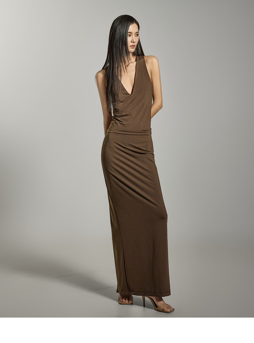 モデルの身長は173cmで、ダークブラウンのONEサイズを着用しています。