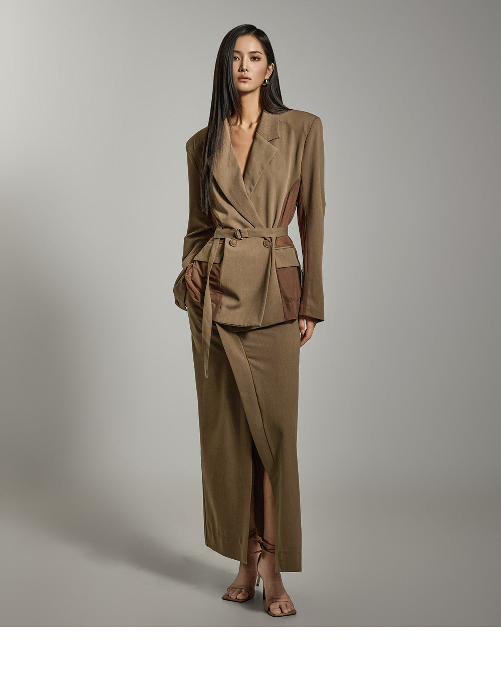 長めの丈とラップスタイルのデザインが洗練された印象を与えます。