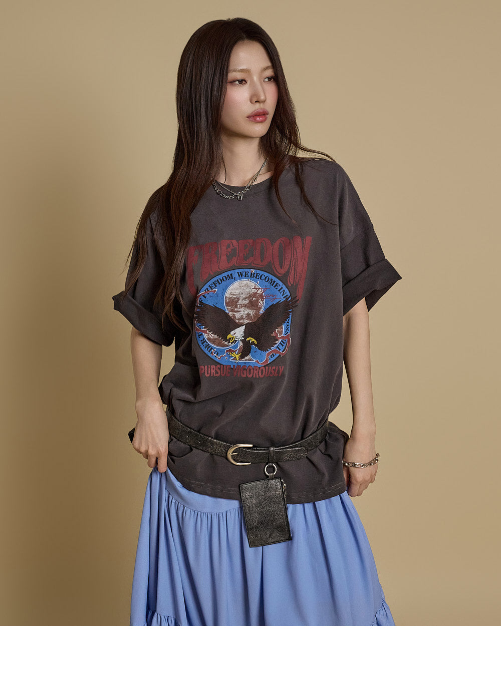 アシンメトリーな裾とスリットのディテールが自然なシルエットを演出します