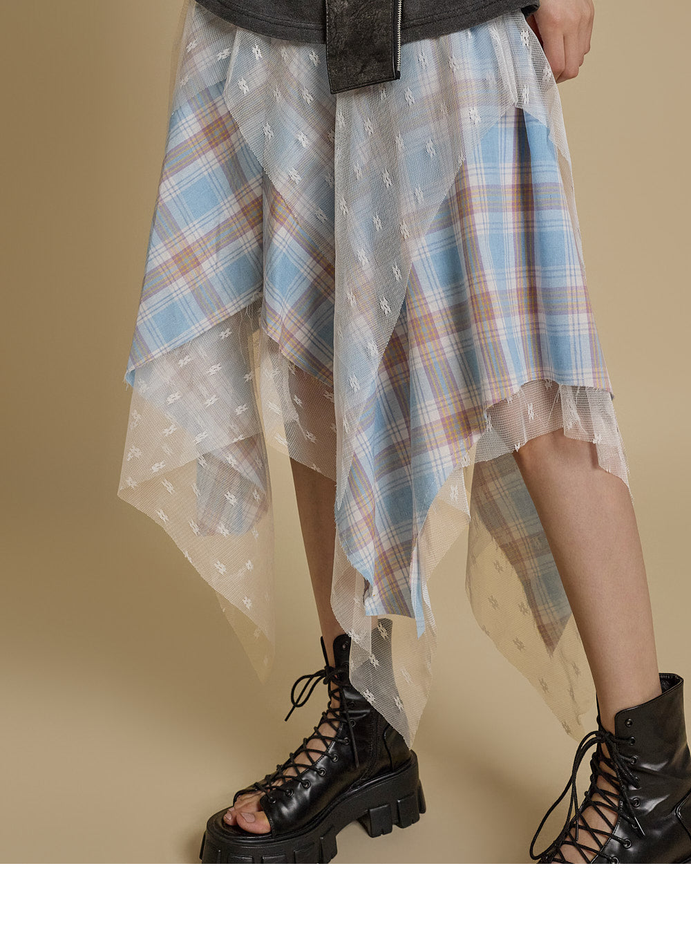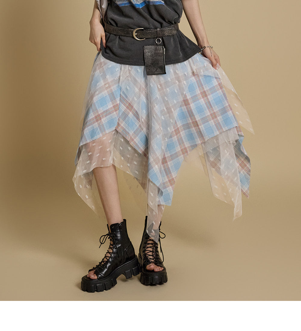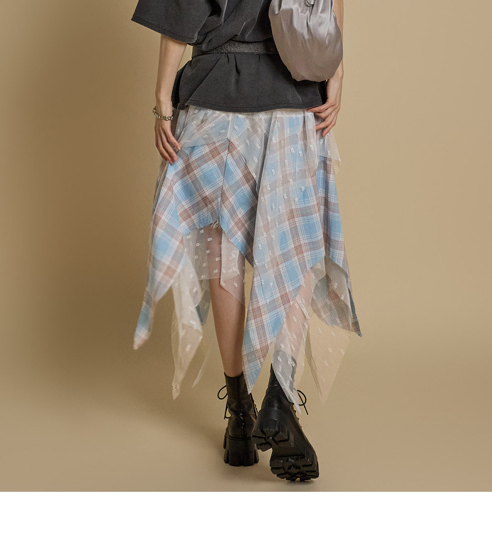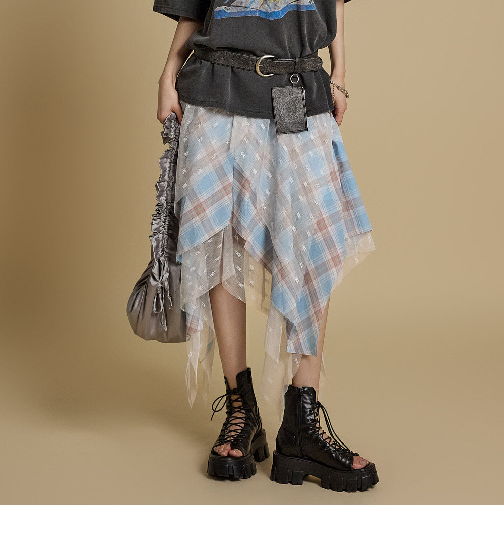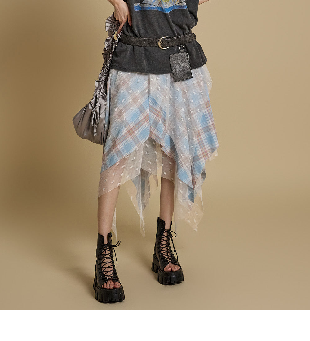 アシンメトリーなチェックとメッシュのコントラストデザイン。