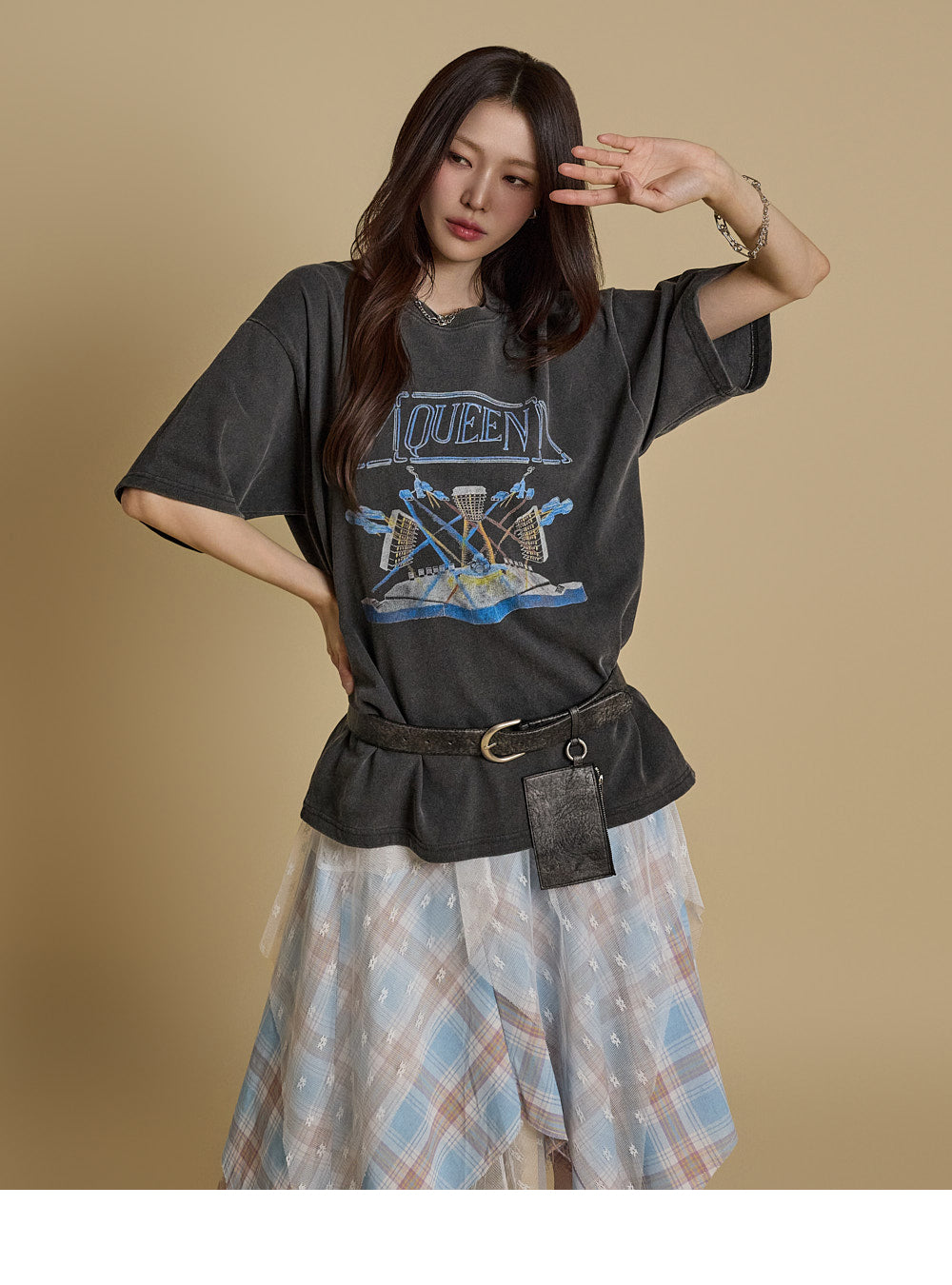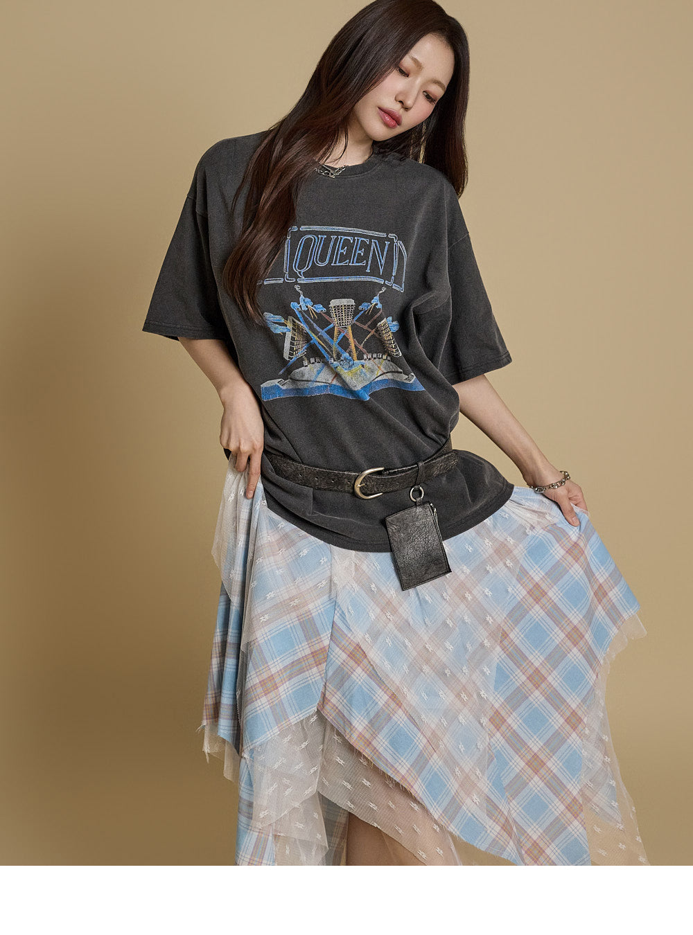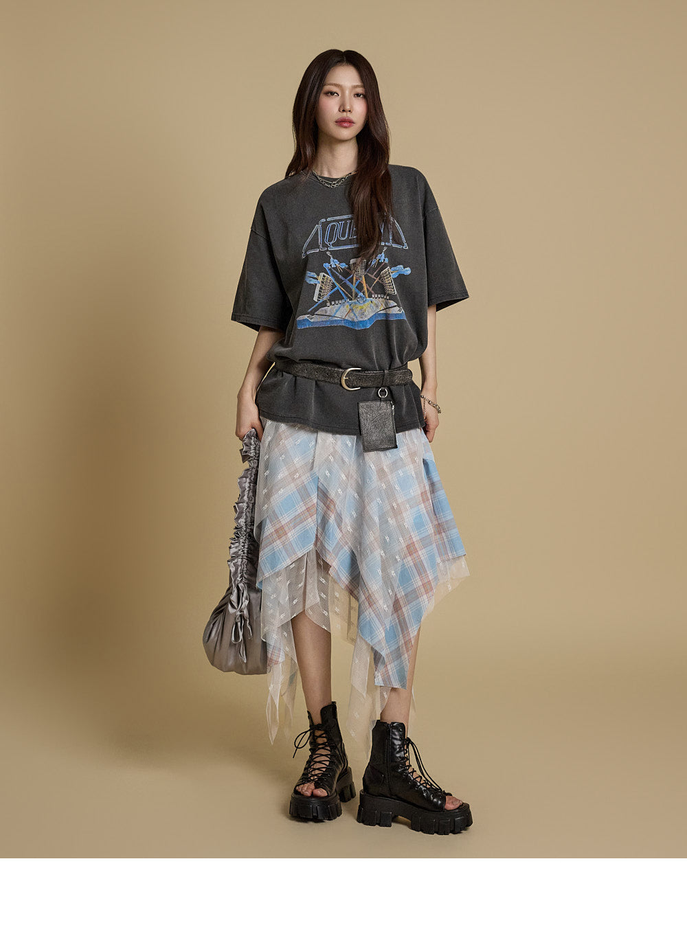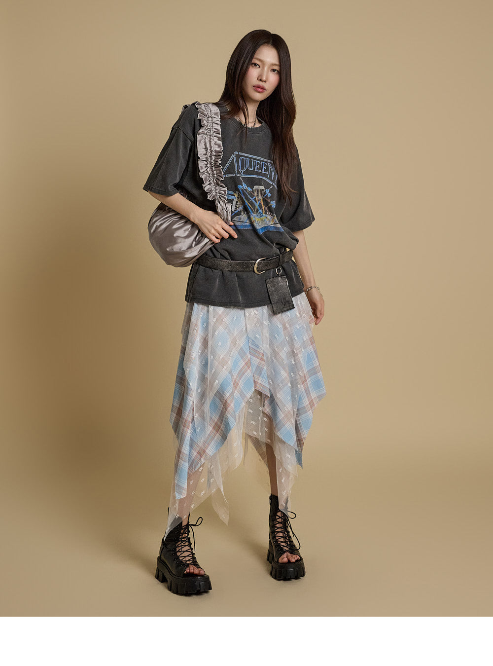 アシンメトリーなチェックとメッシュのコントラストデザイン。