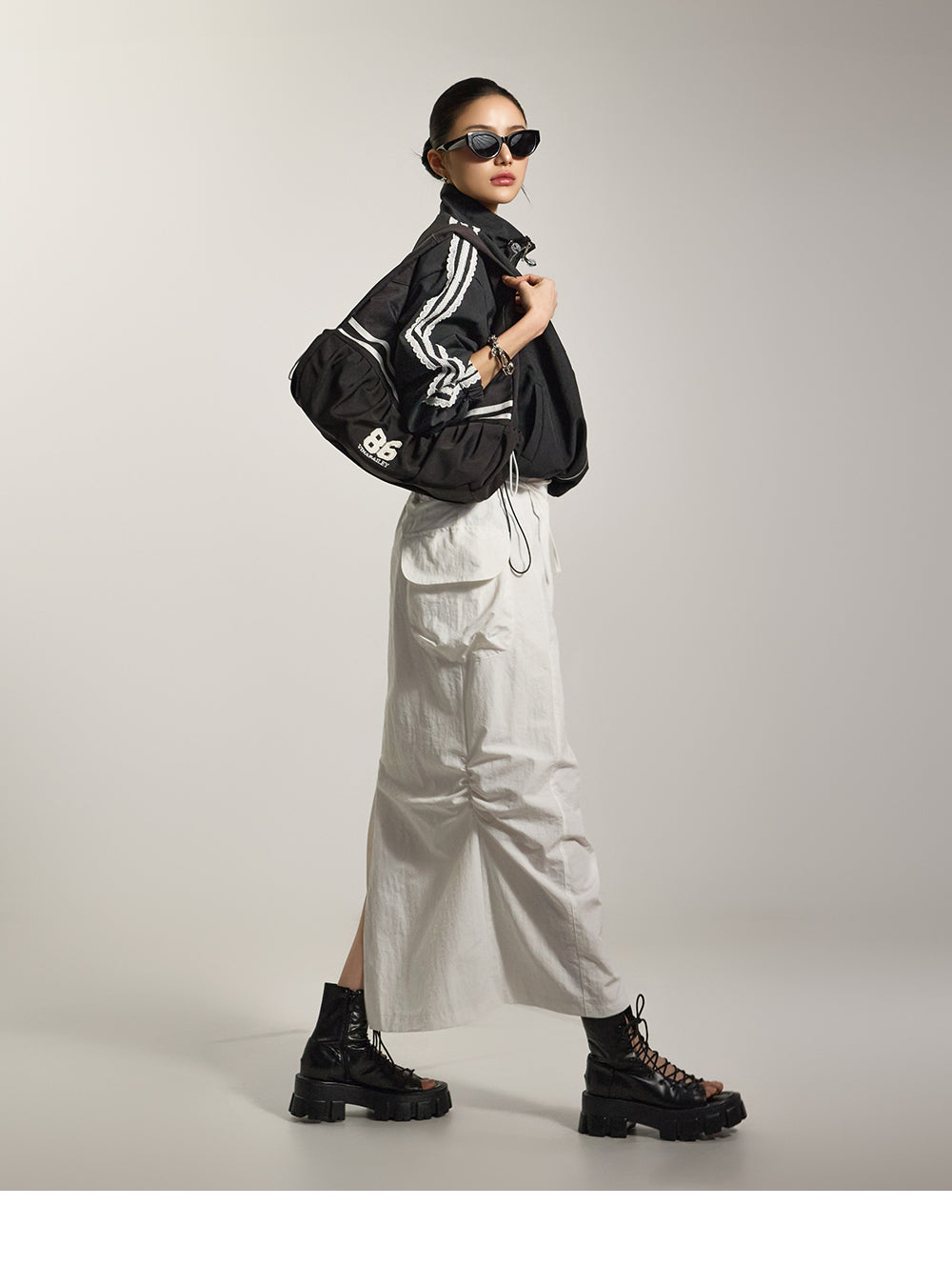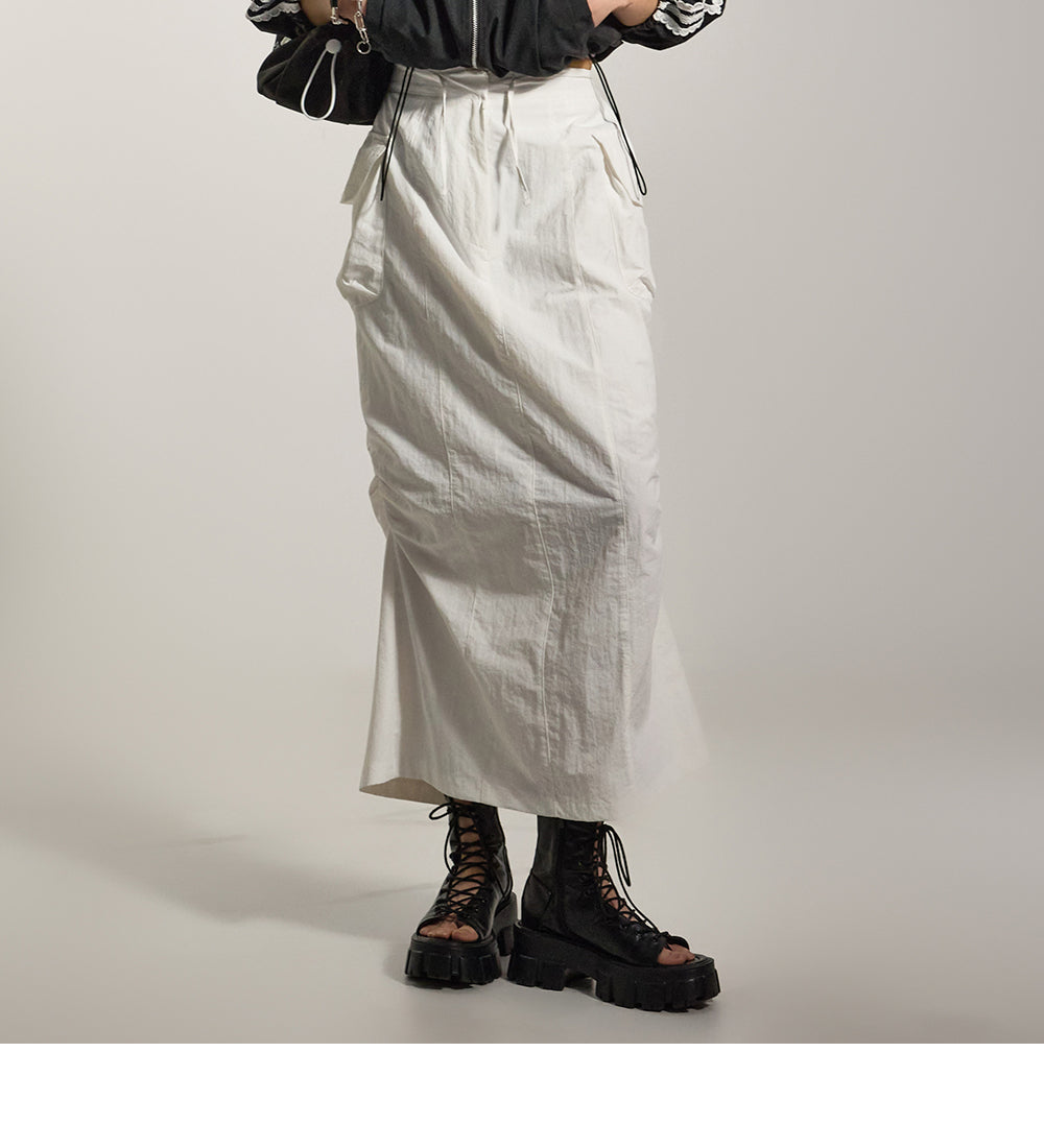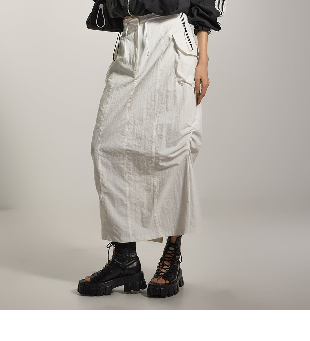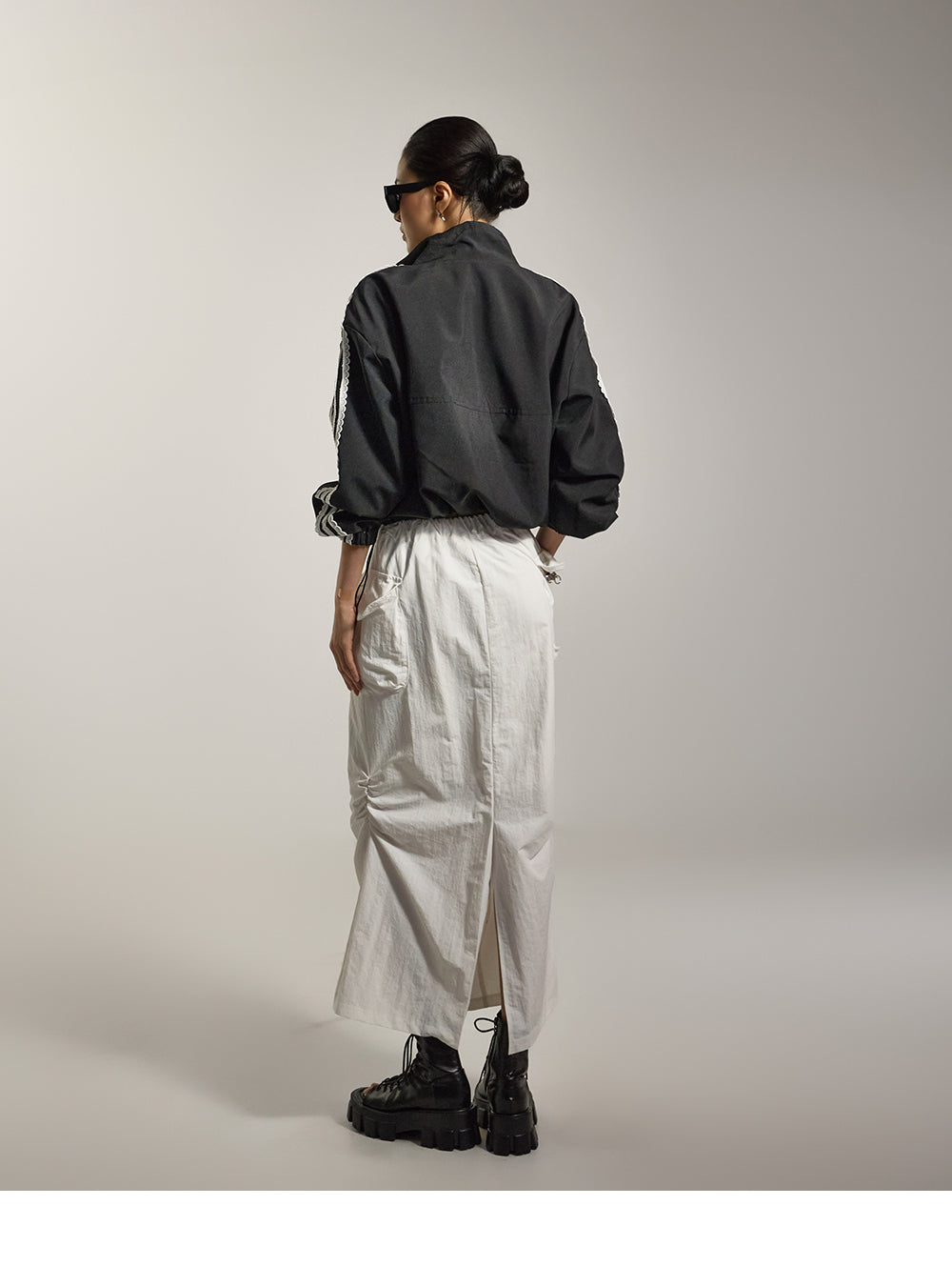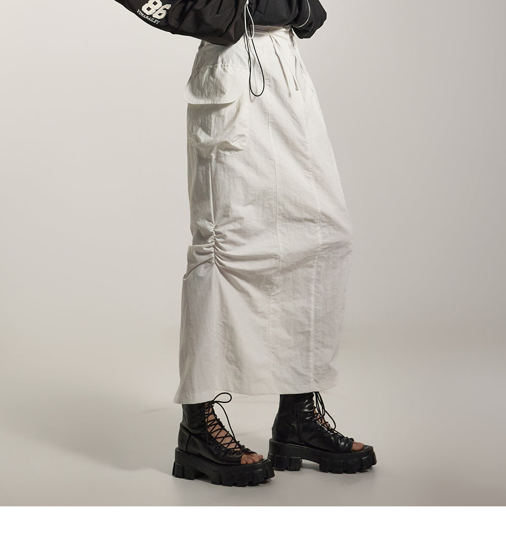 サイドシャーリングディテールを施したロング丈が個性的なシルエットを演出します。
