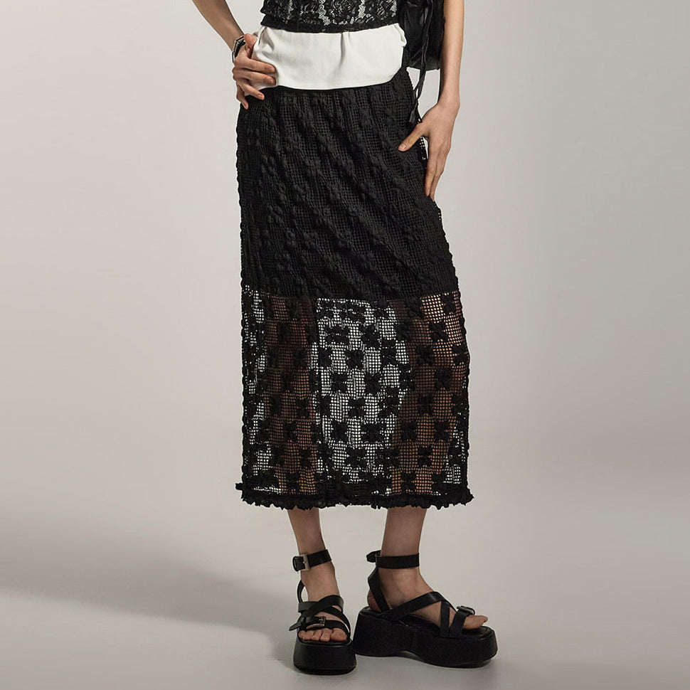 透け感のあるエンボス加工のスカートは、個性的でスタイリッシュな雰囲気を演出します。