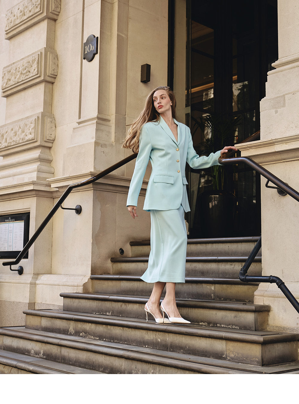 ペンシルスカートのデザインが洗練された雰囲気を添えます。