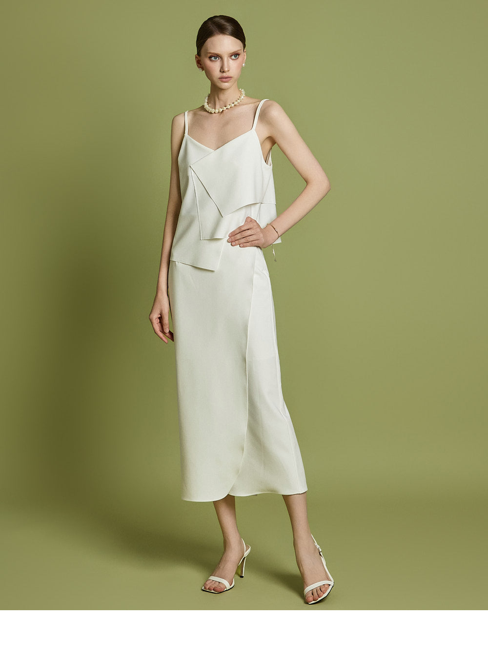 すっきりと落ちるHラインシルエットで、部分的に裏地を付けることで透け感を軽減。