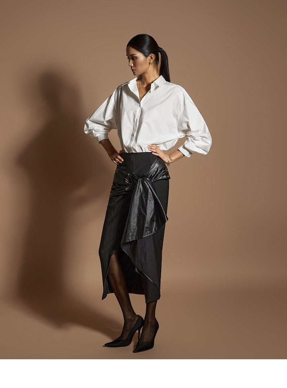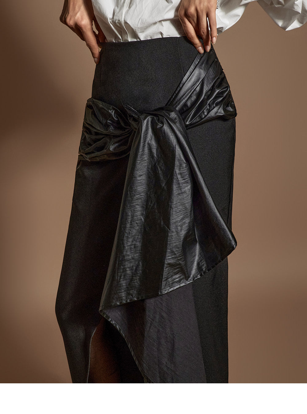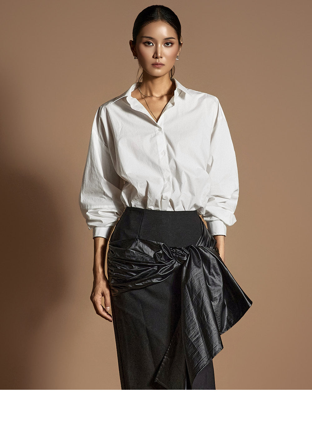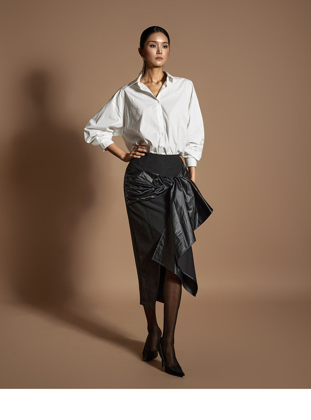The H-line silhouette with a front slit creates a polished and elegant look.