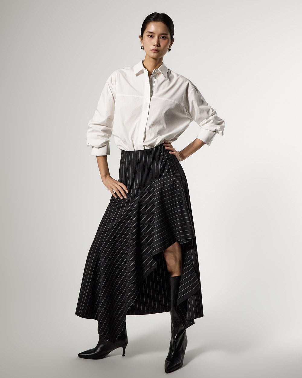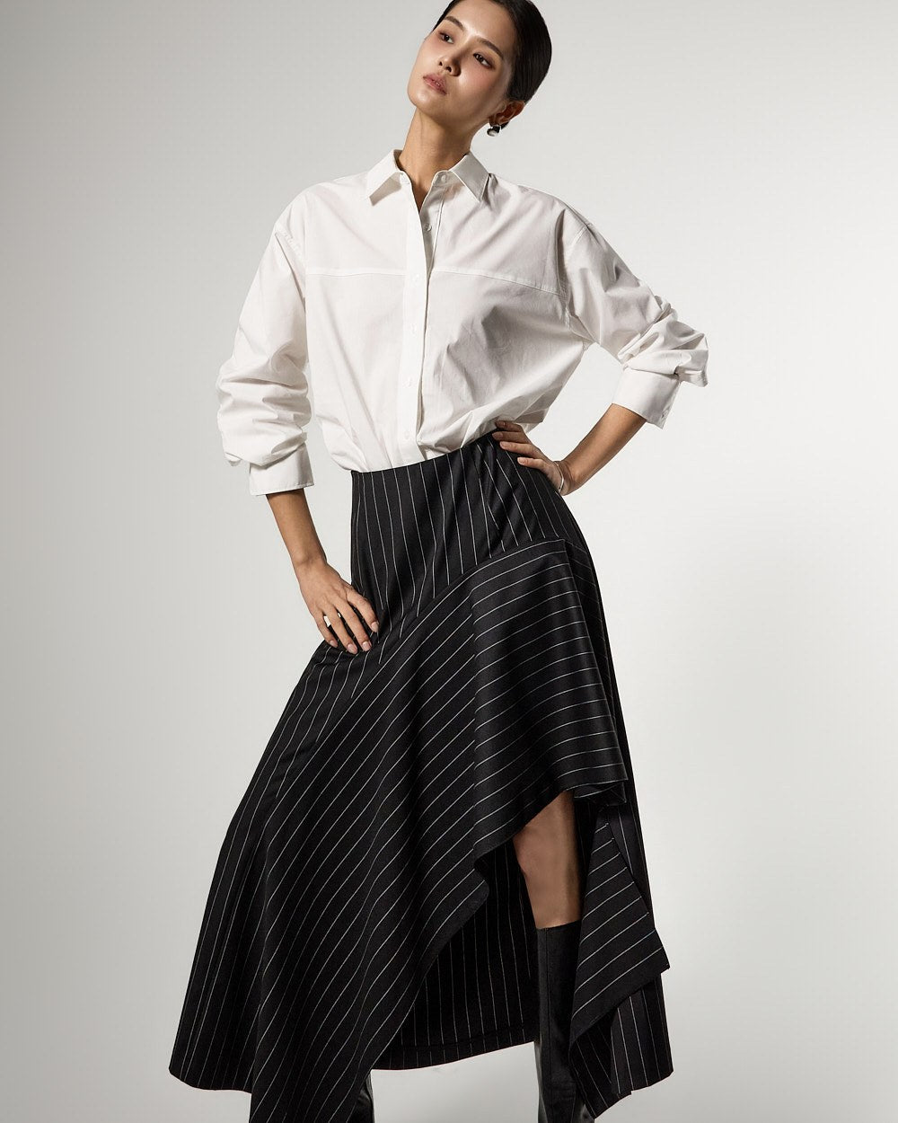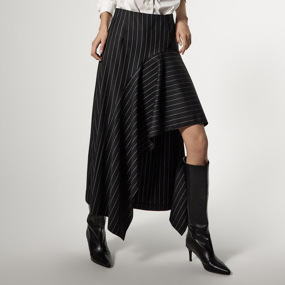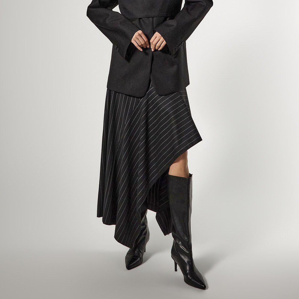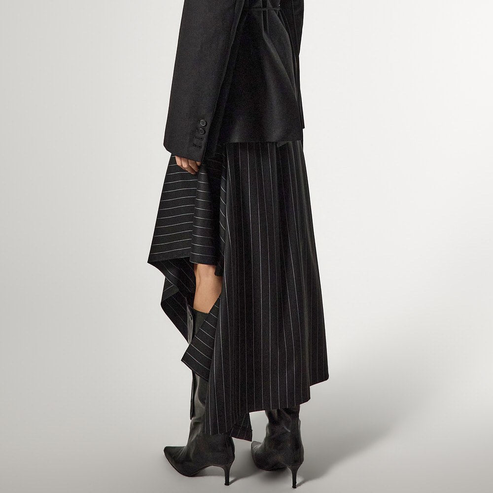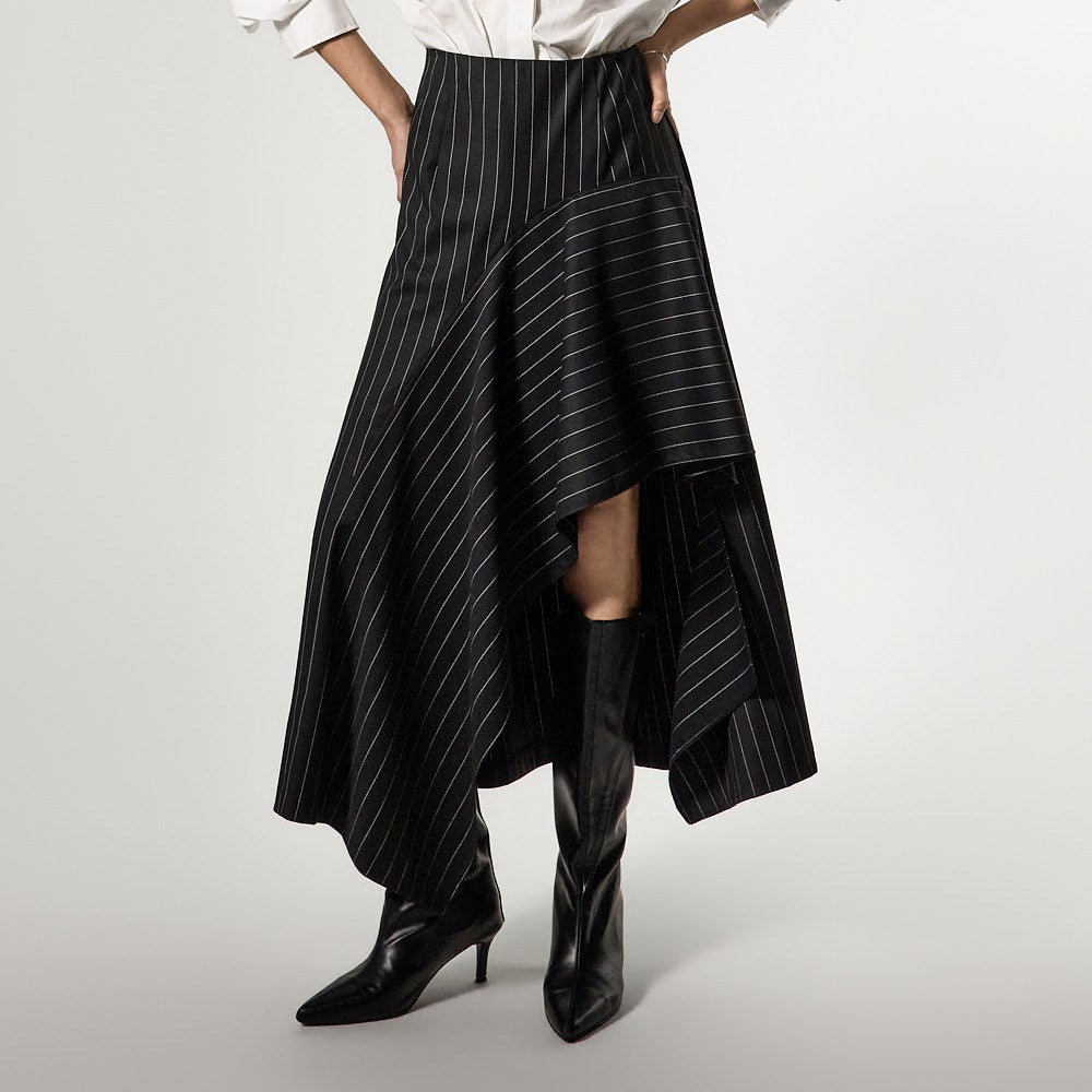 アシンメトリーなヘムディテールがスタイリッシュで洗練されたシルエットを演出します。