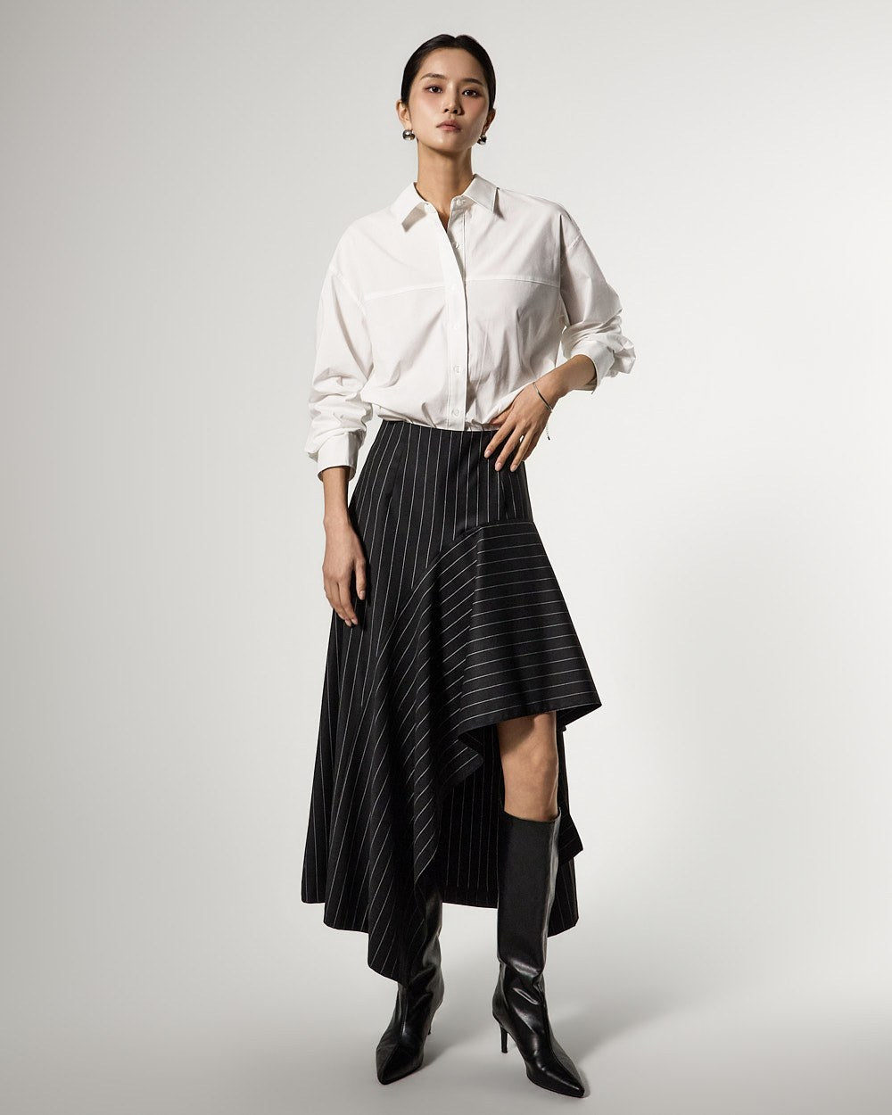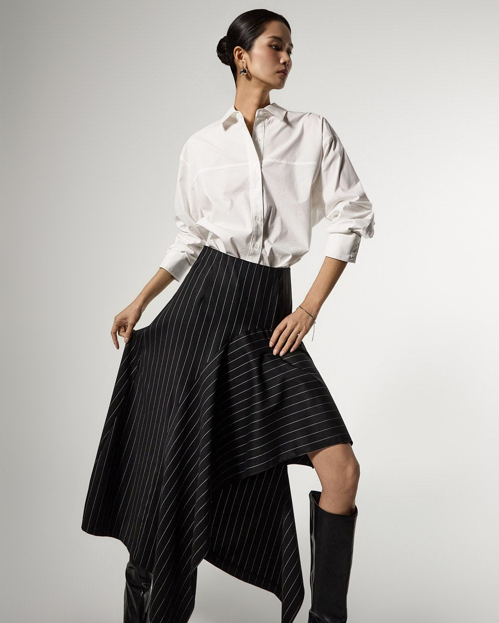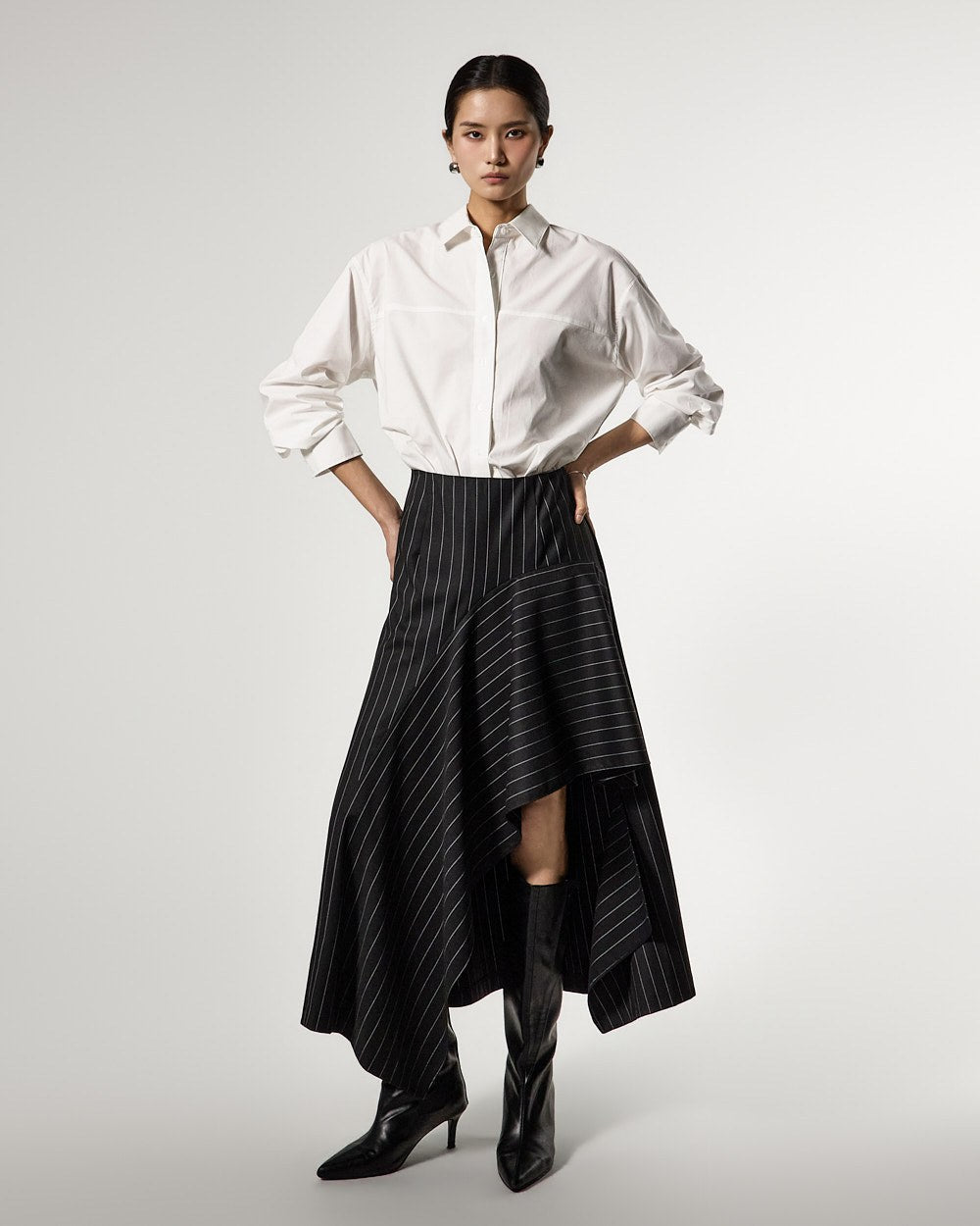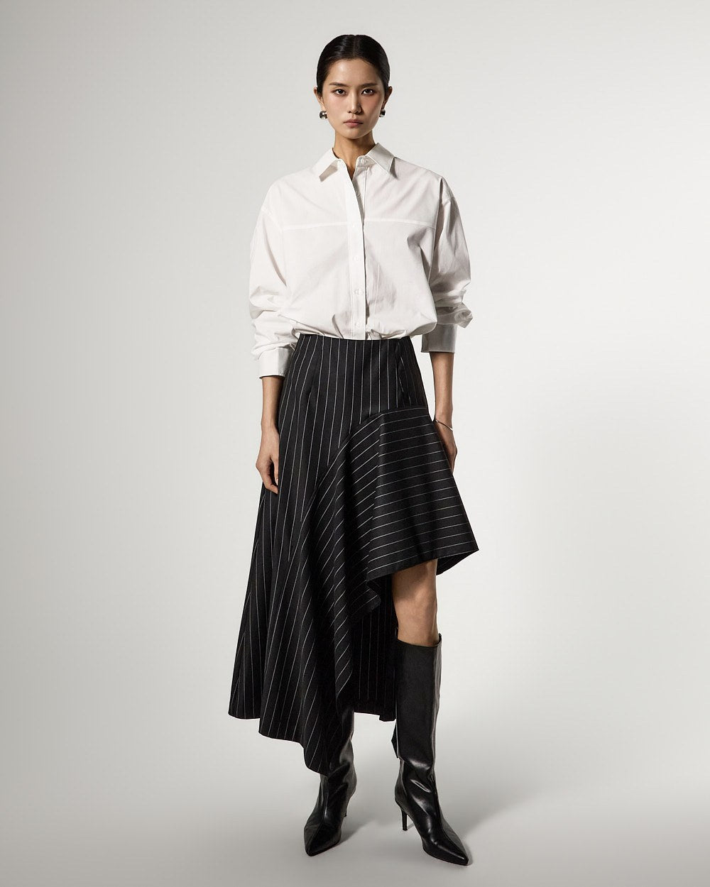 アシンメトリーなヘムディテールがスタイリッシュで洗練されたシルエットを演出します。