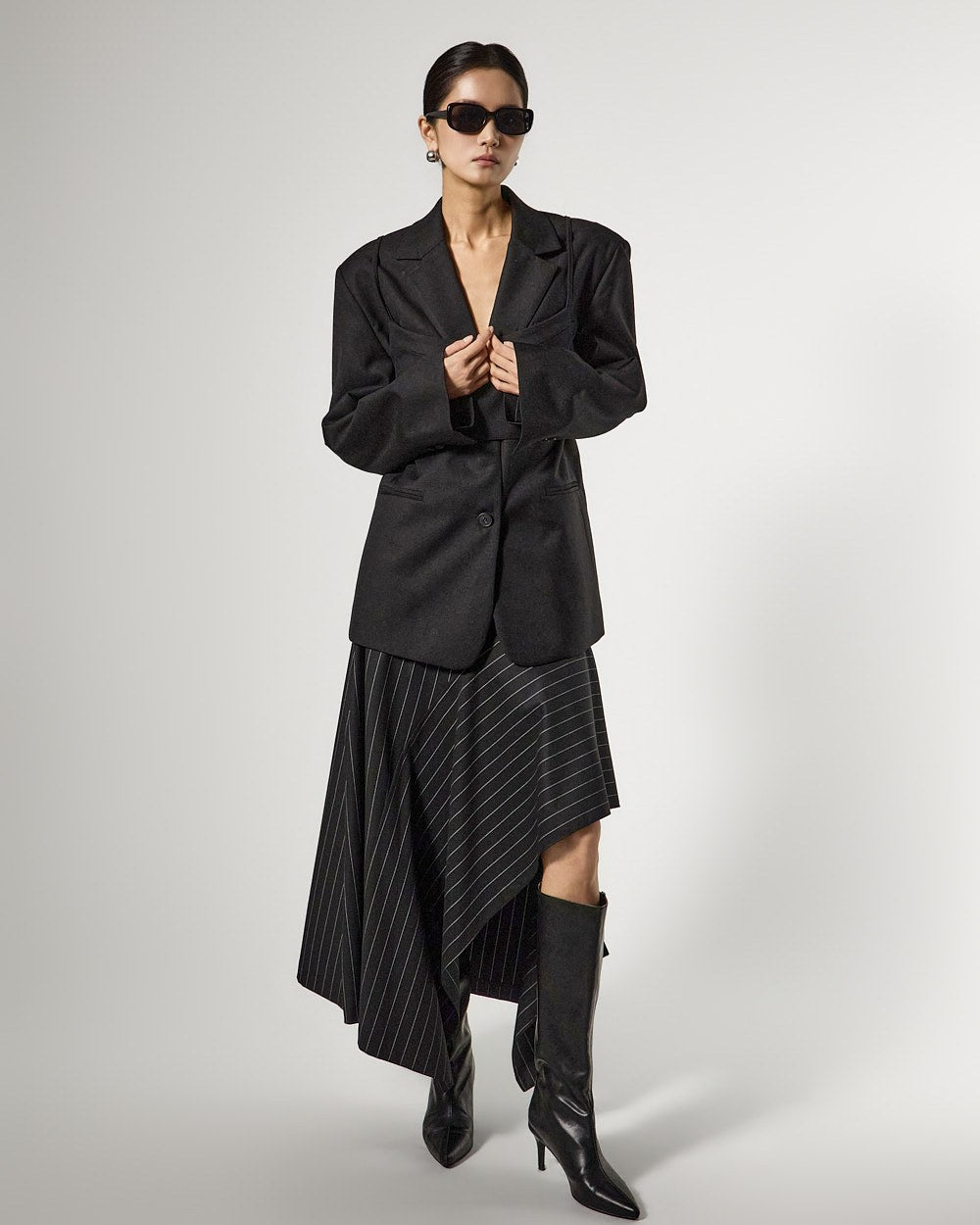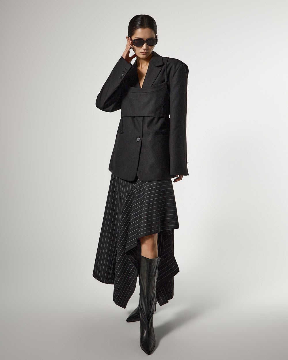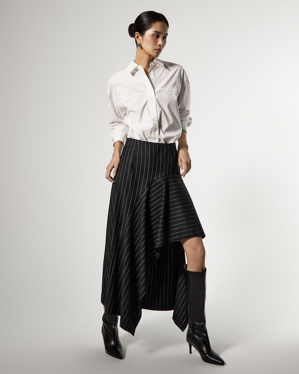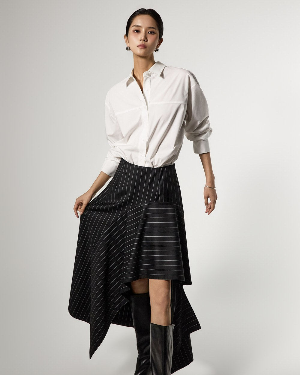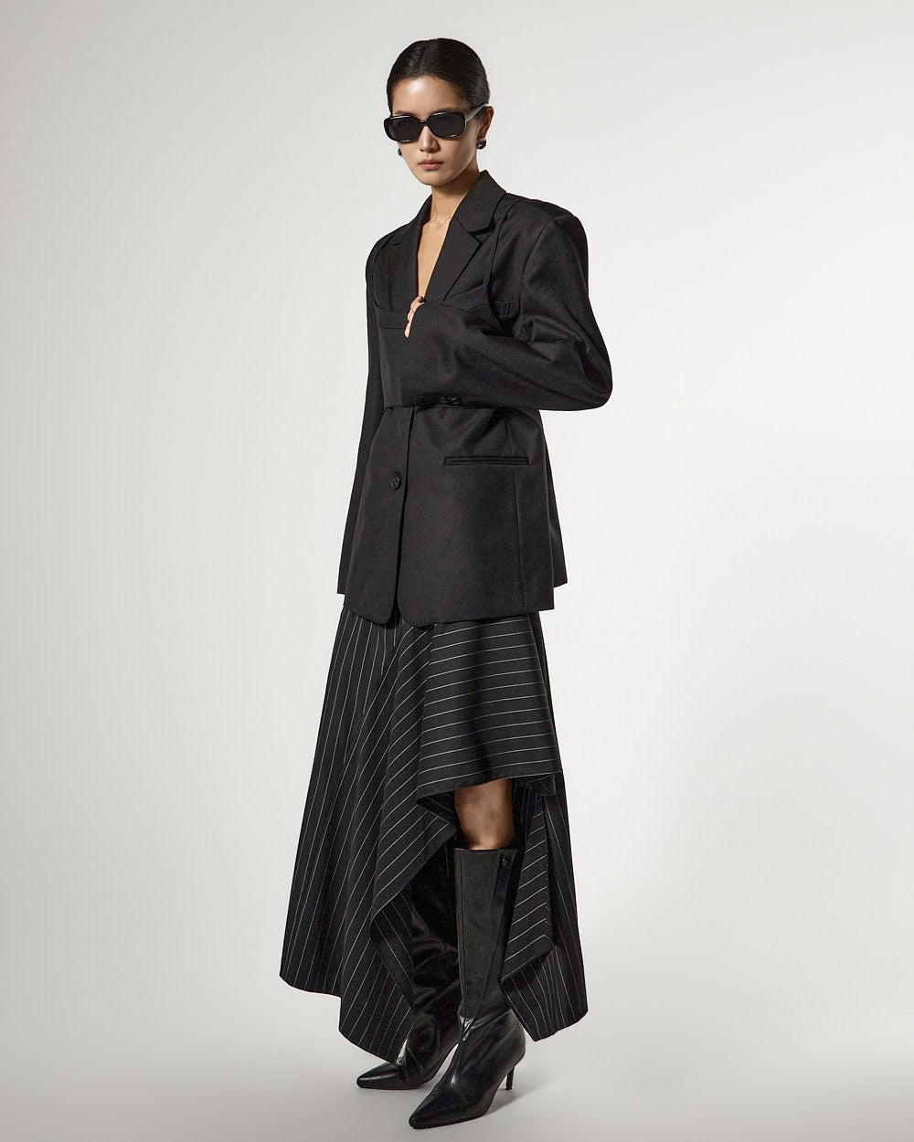アシンメトリーなヘムディテールがスタイリッシュで洗練されたシルエットを演出します。
