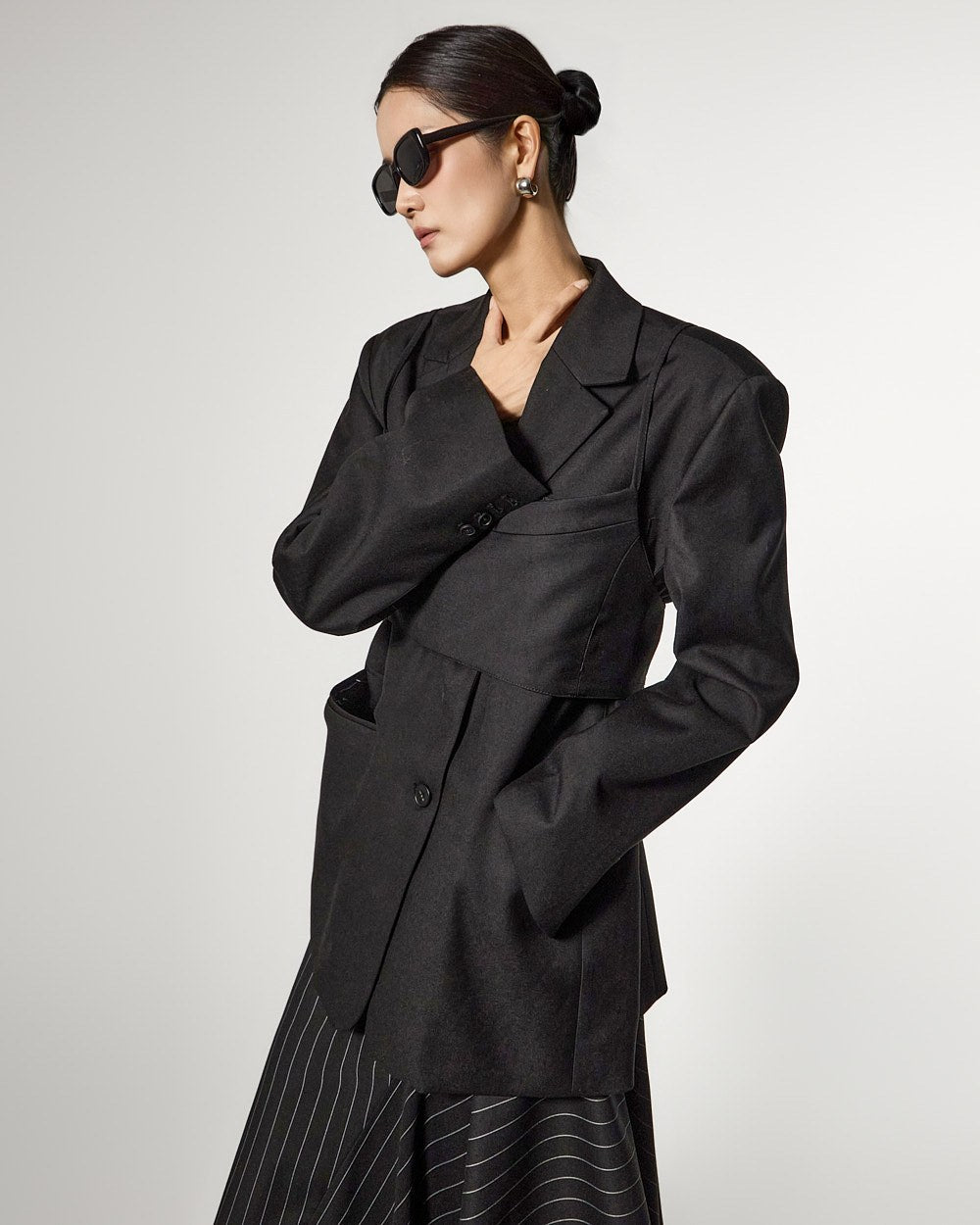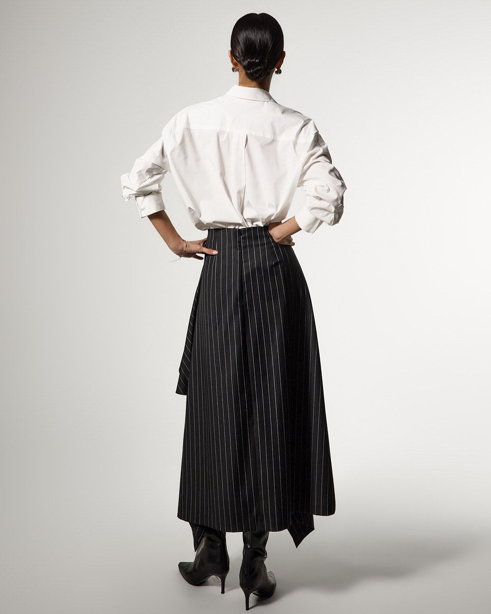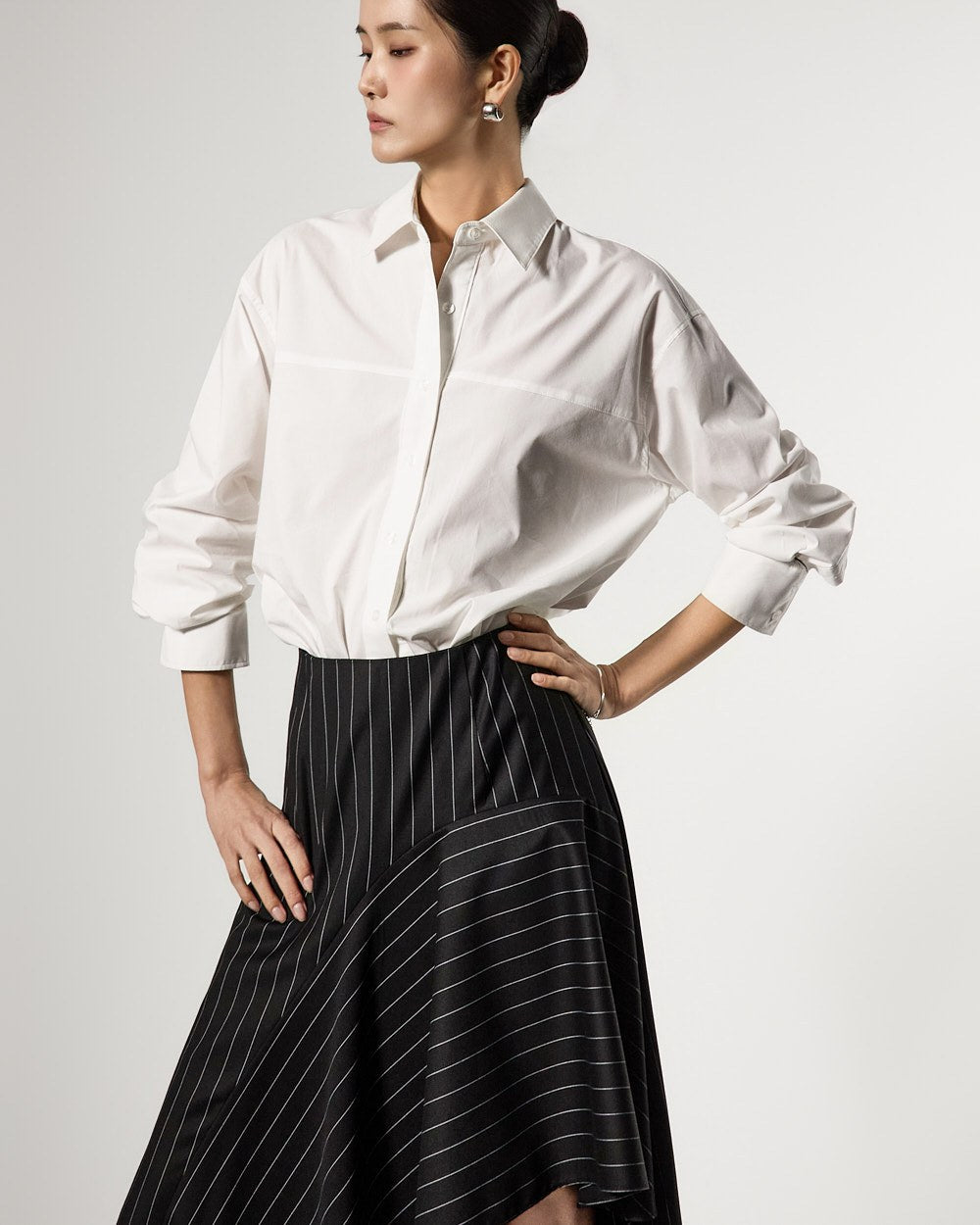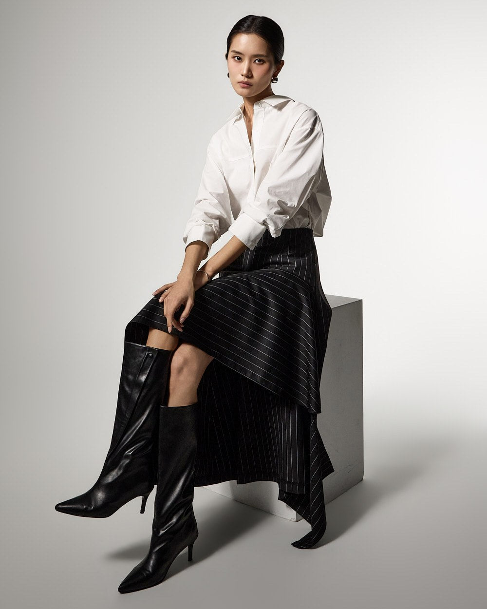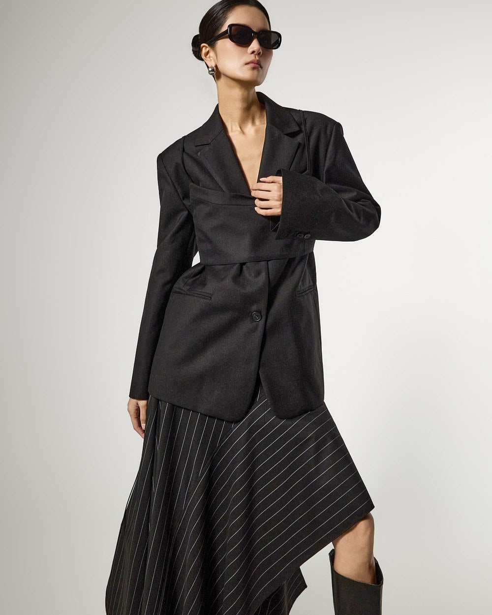 アシンメトリーなヘムディテールがスタイリッシュで洗練されたシルエットを演出します。