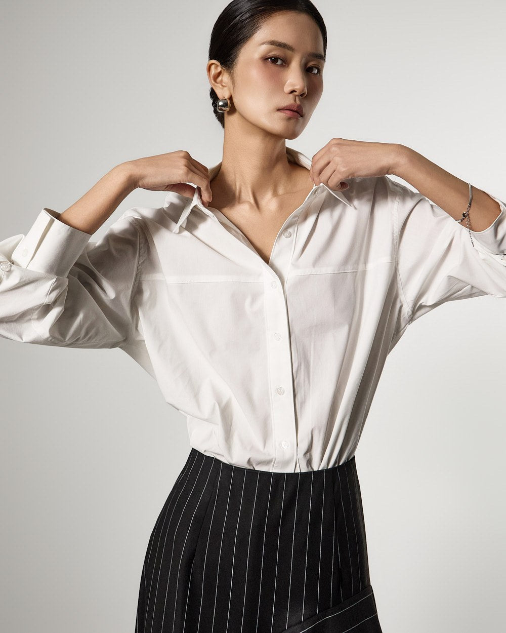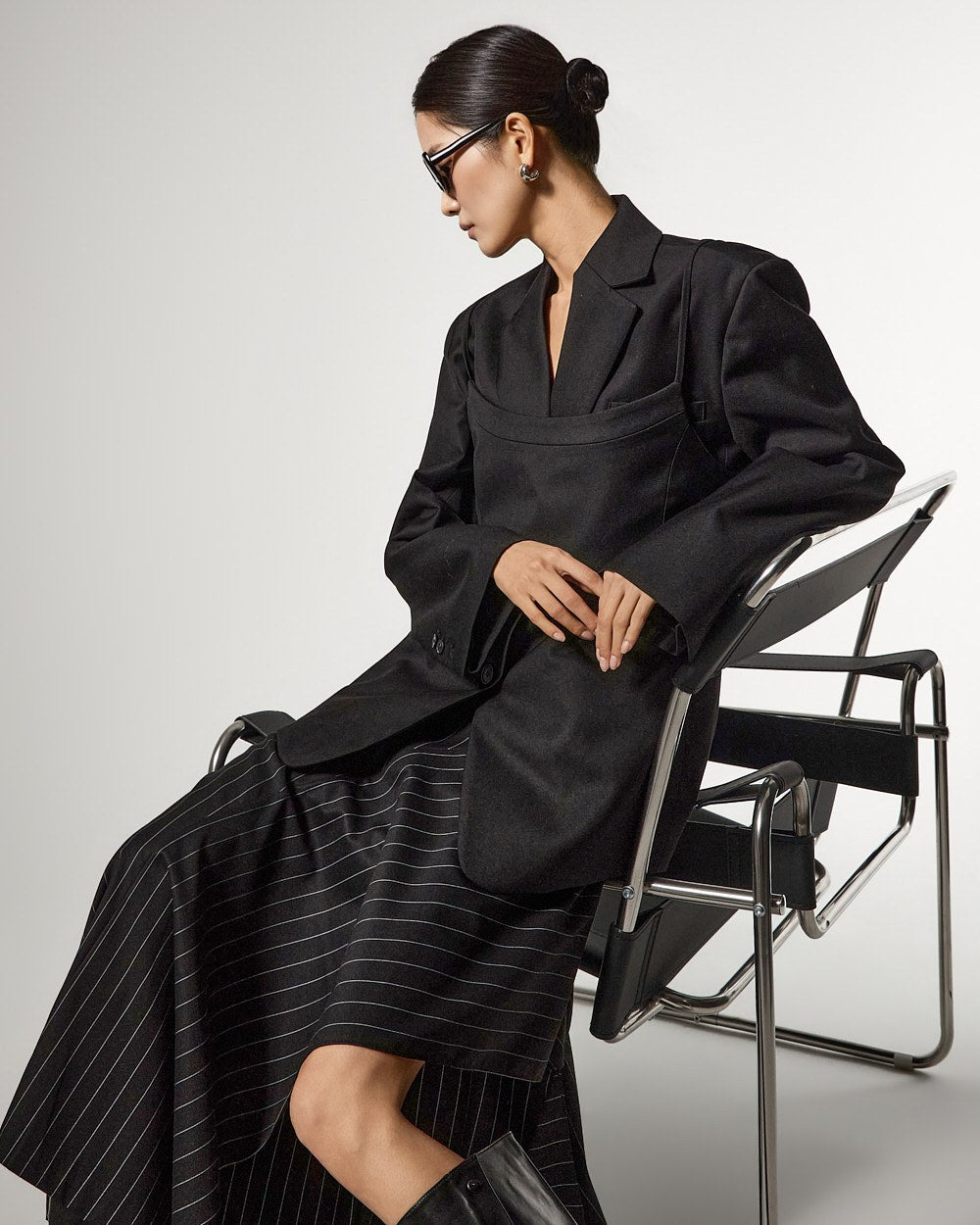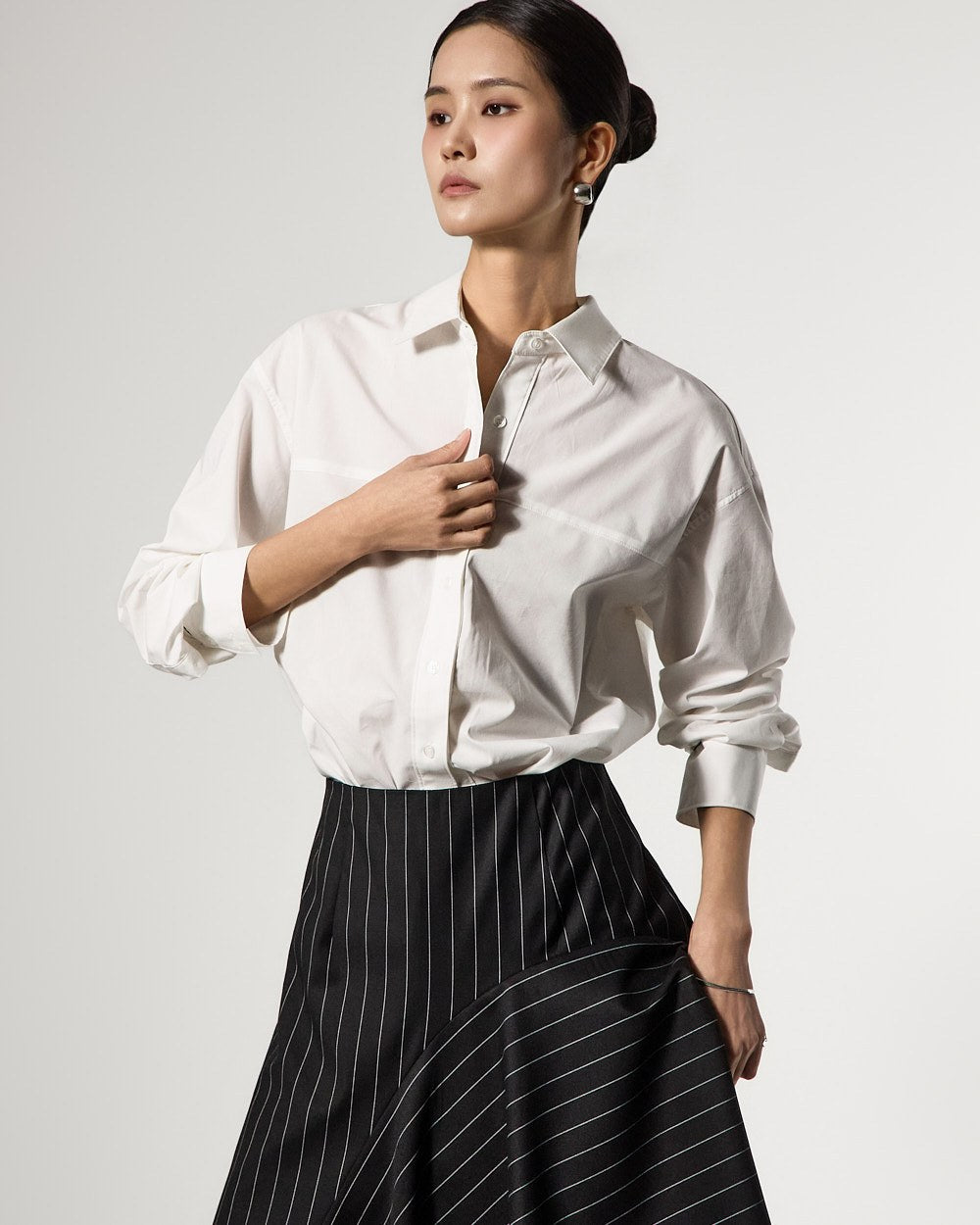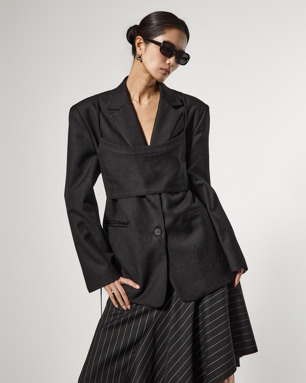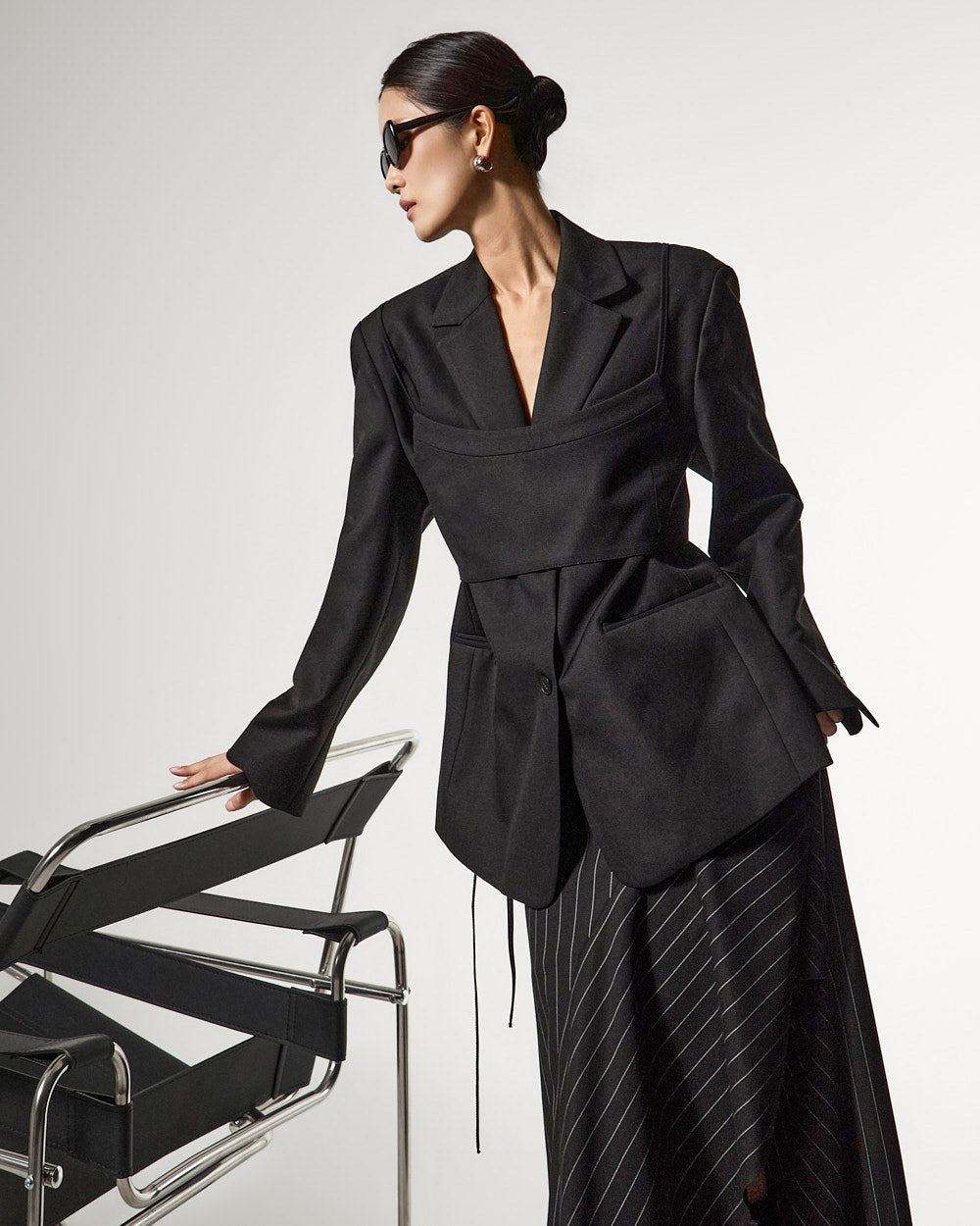 アシンメトリーなヘムディテールがスタイリッシュで洗練されたシルエットを演出します。