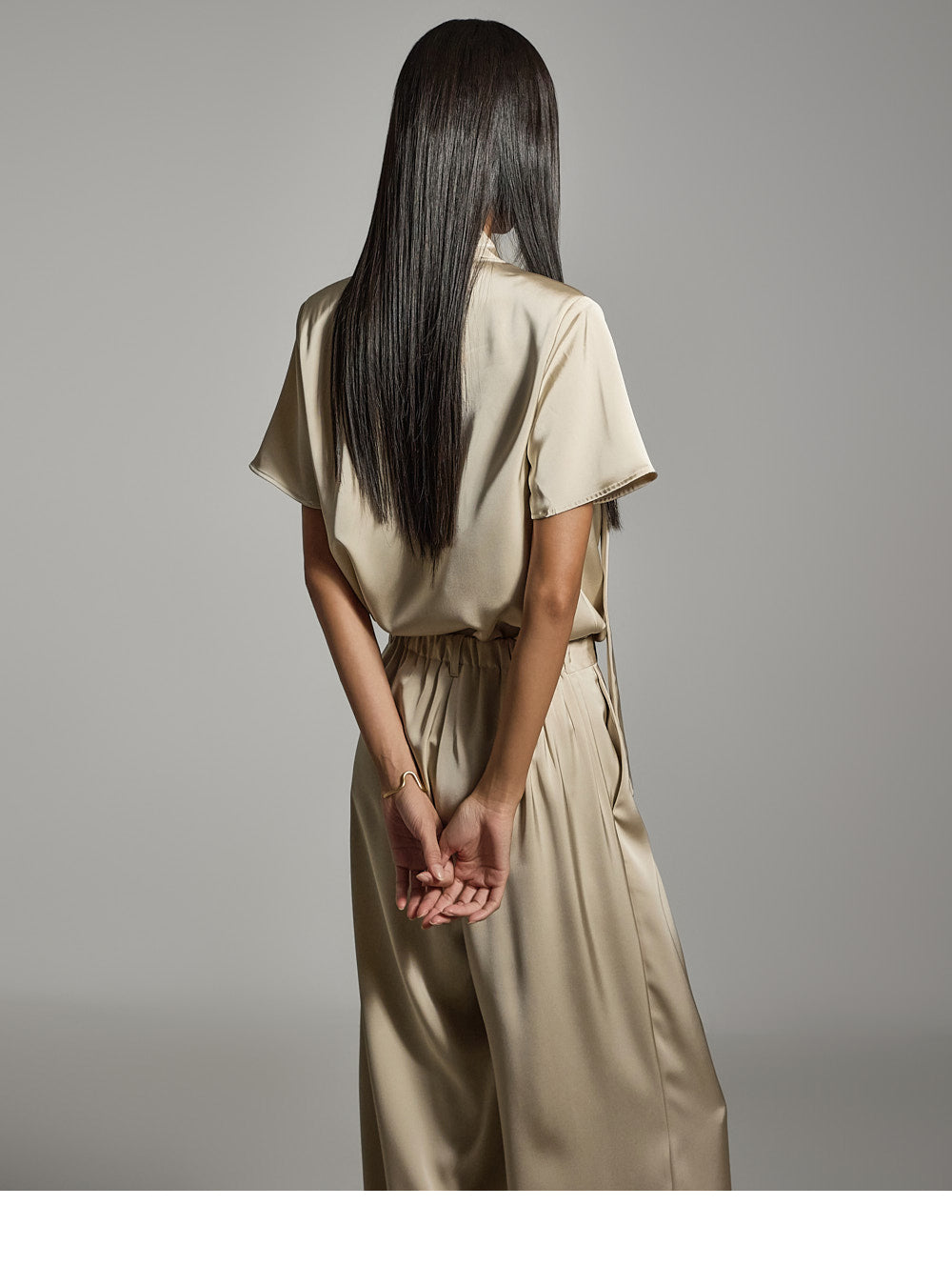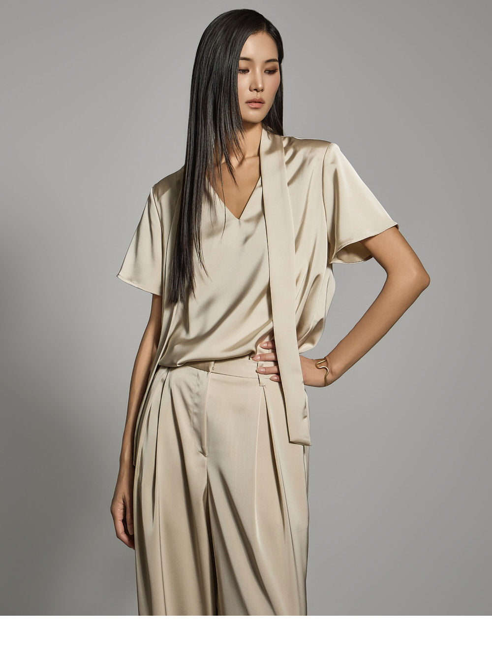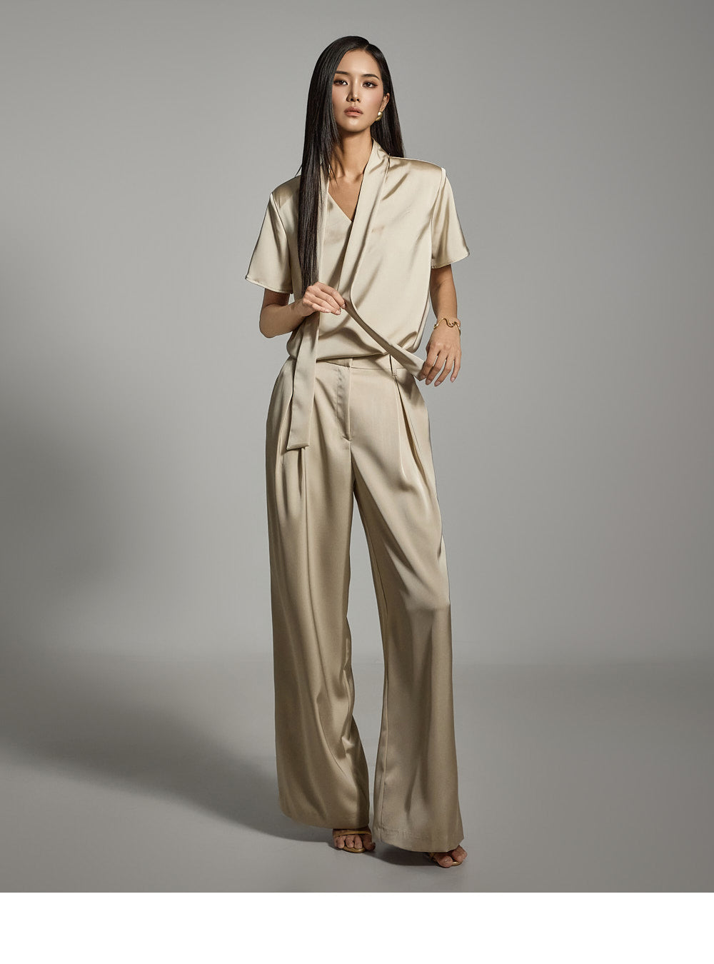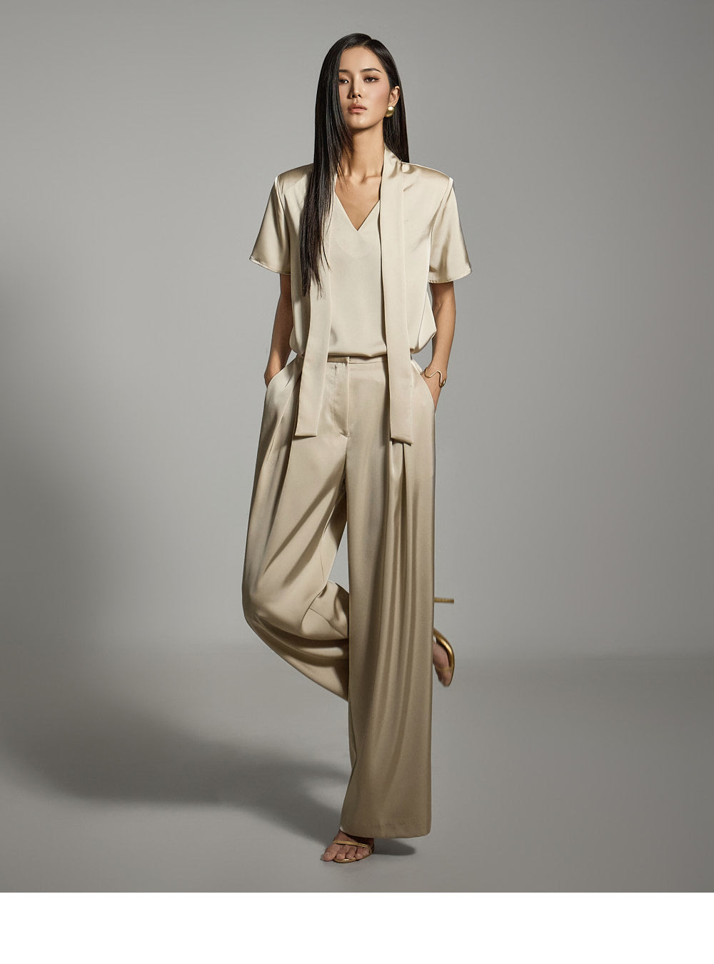 スラックスはピンタックのディテールが施されたワイドフィットです