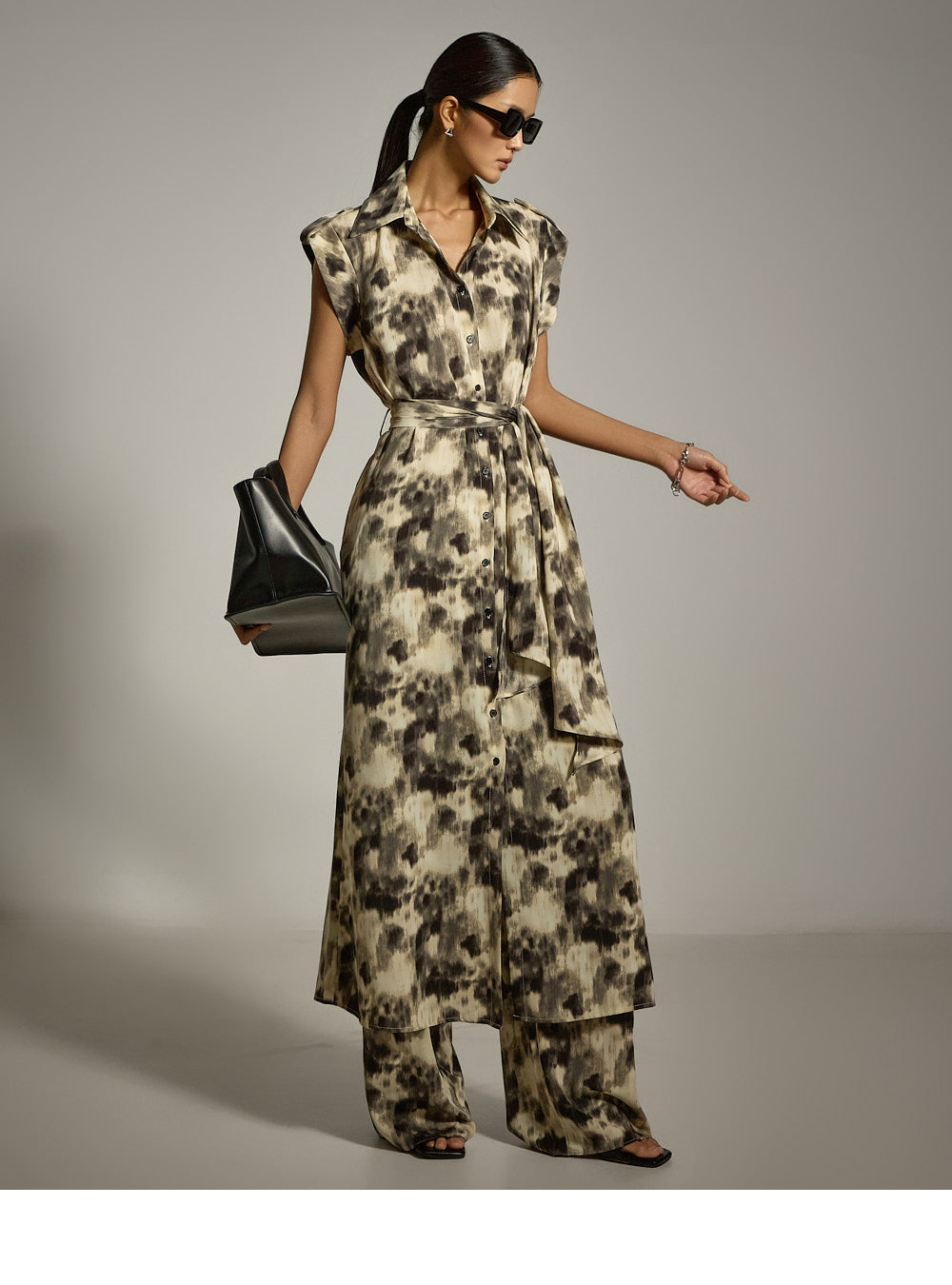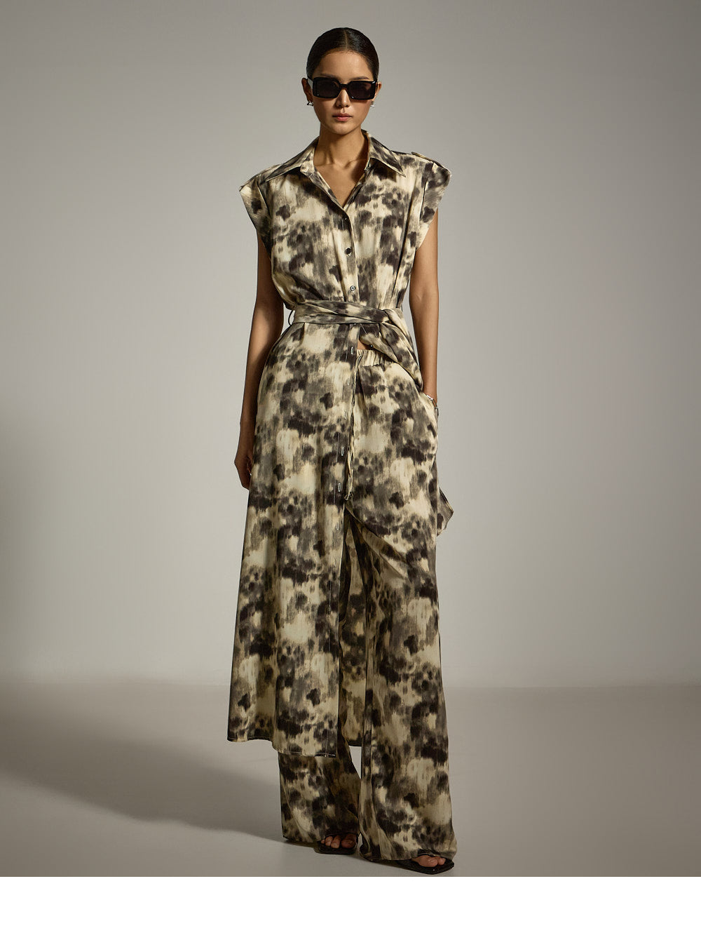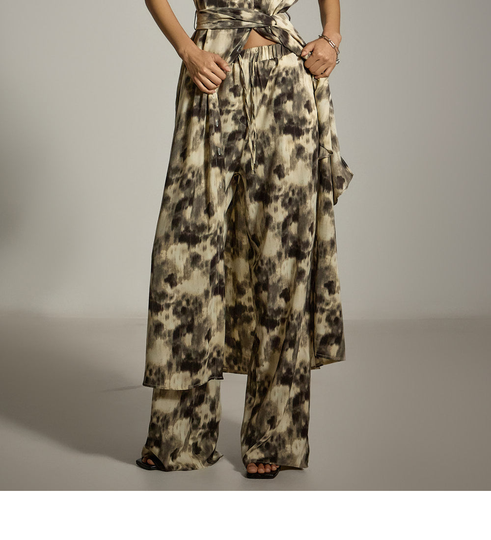 ワイドレッグシルエット、伸縮性のあるウエストバンド、