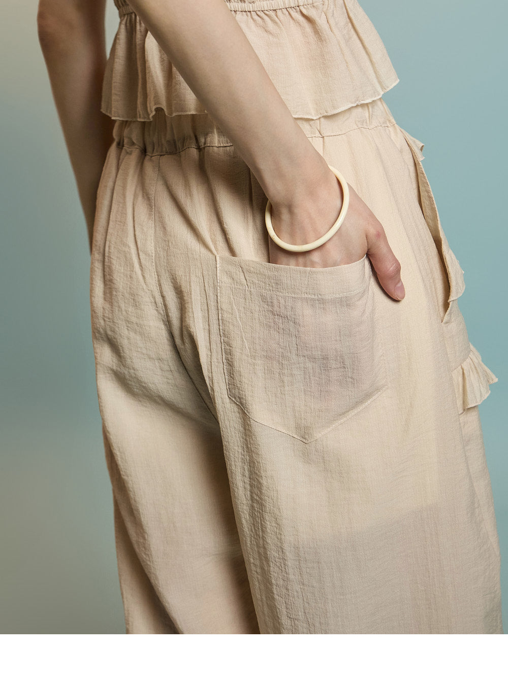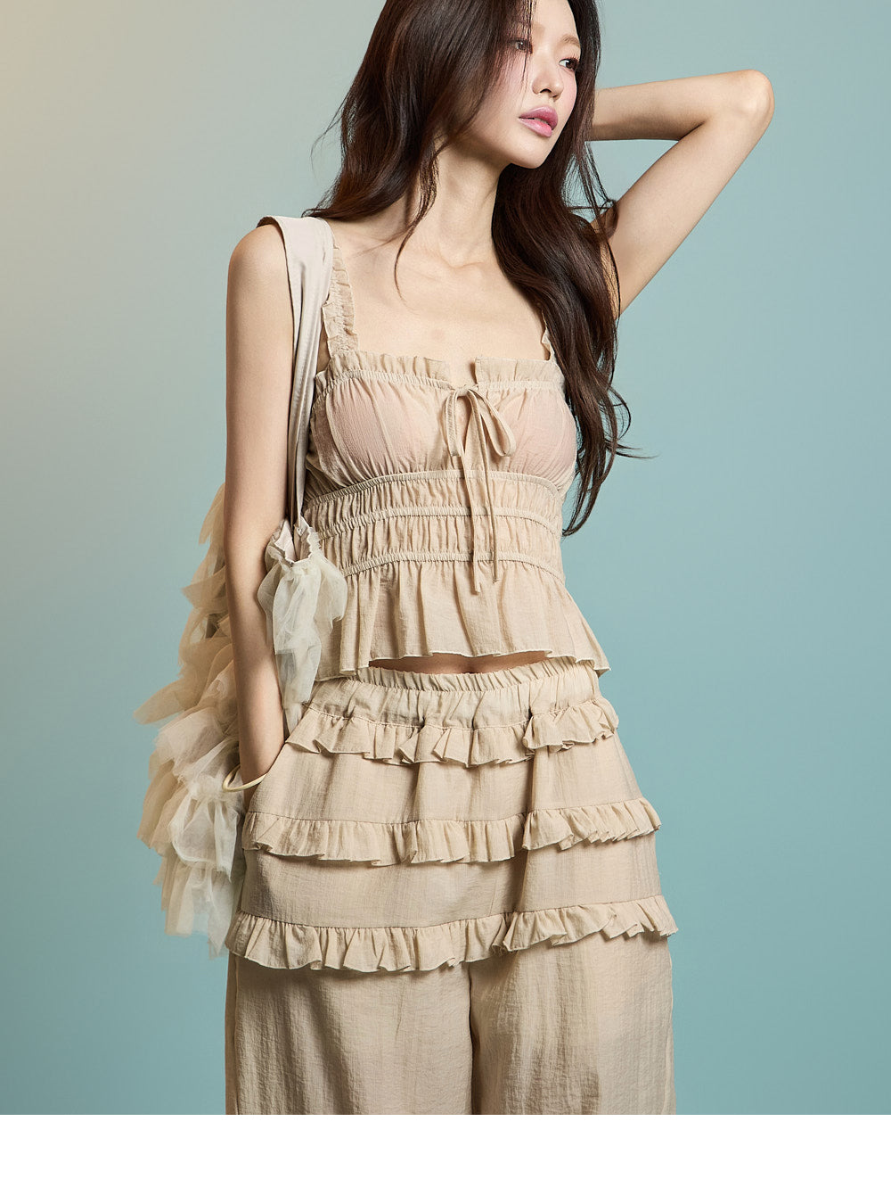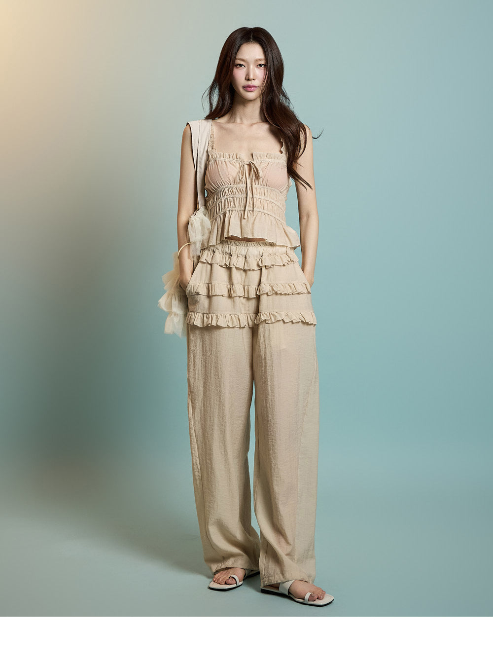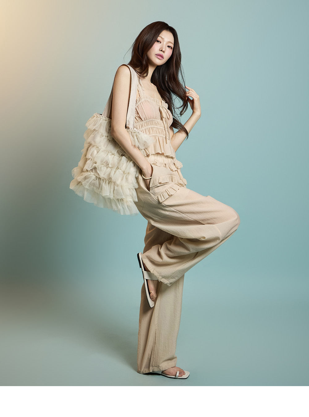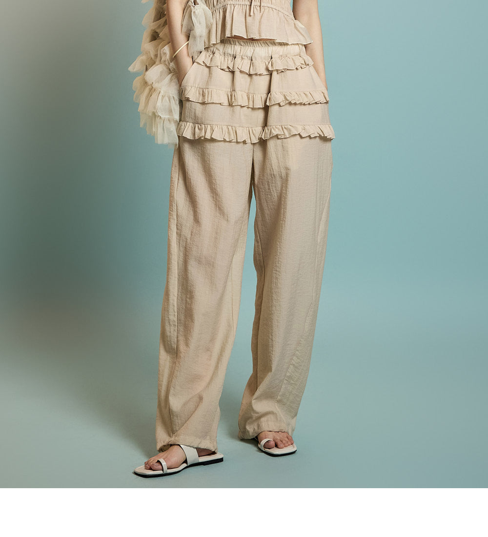 フロントのフリルディテールと裾のドローストリングで、さまざまなスタイリングを楽しめます。