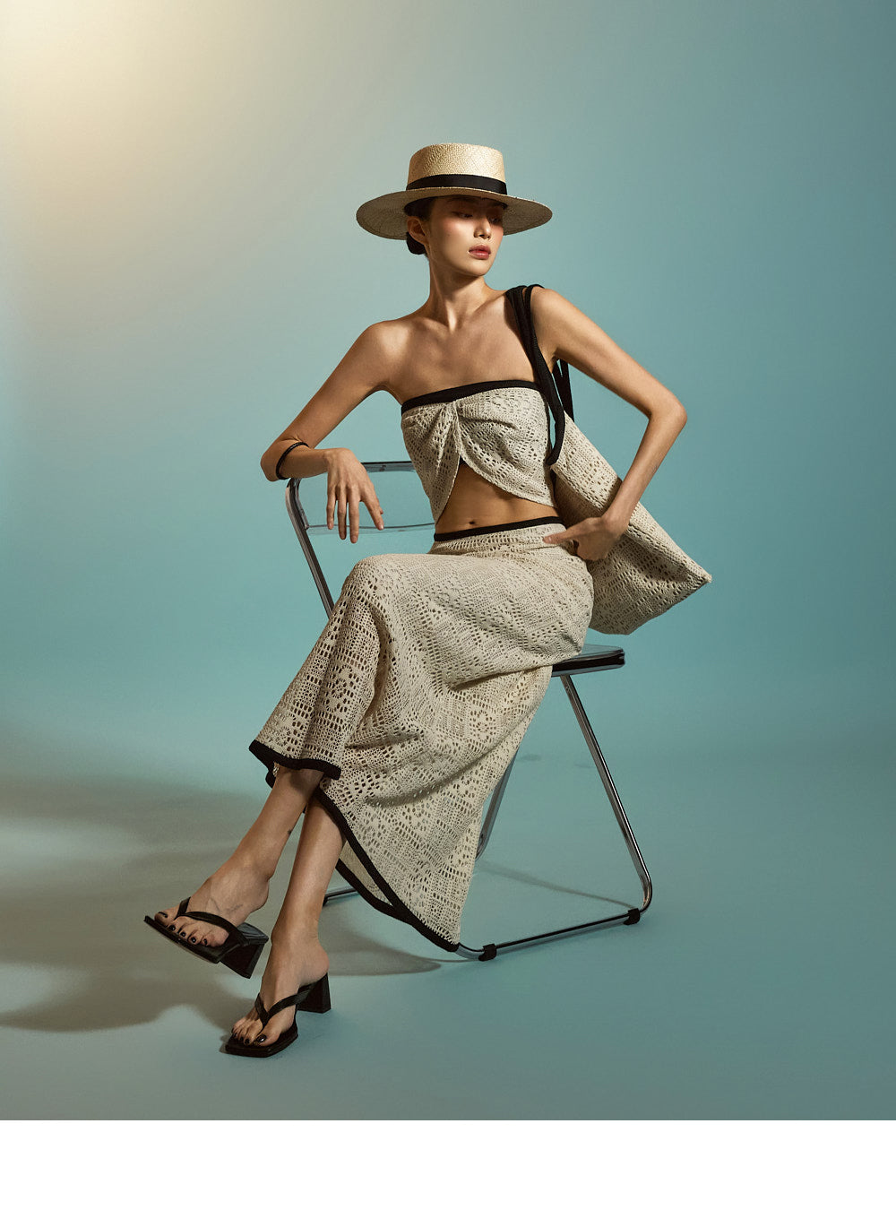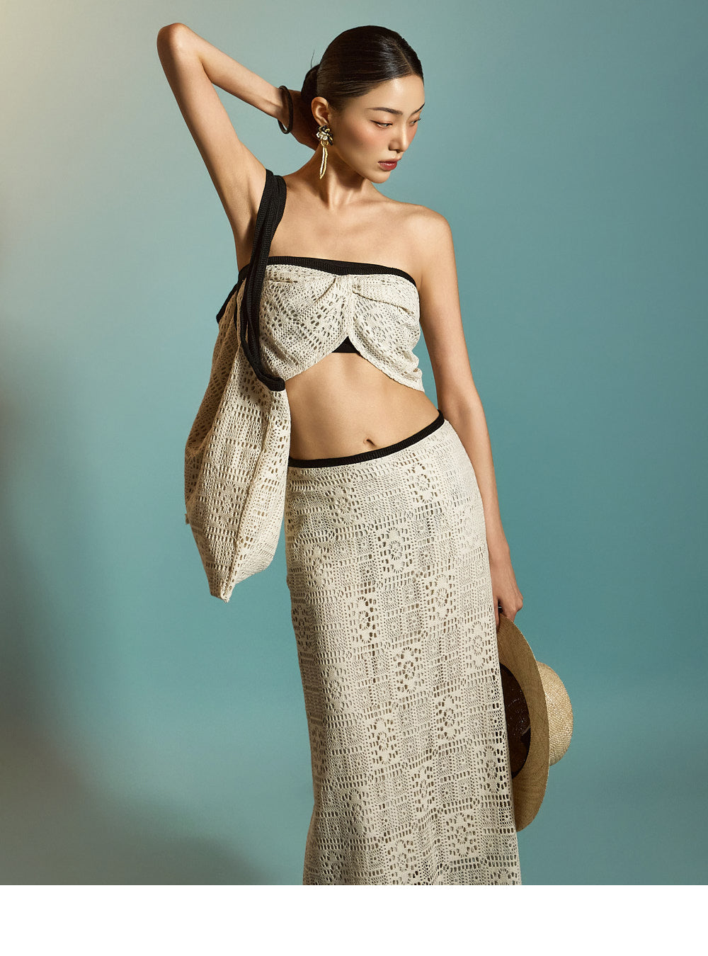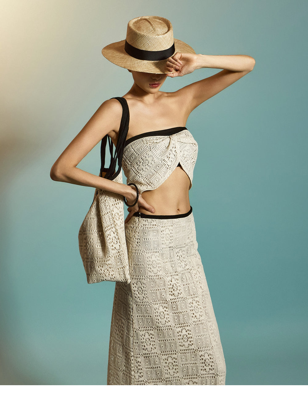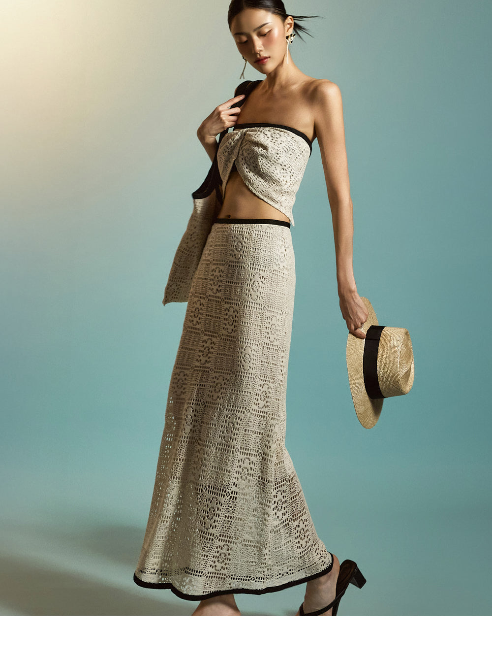 裾はオープンニット仕様で、スタイリッシュな夏の装いにぴったり。