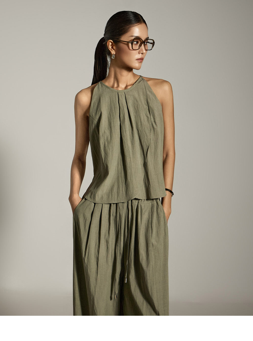 ノースリーブのトップスは、フロントのピンタックディテールがすっきりとしたアクセントになっています。