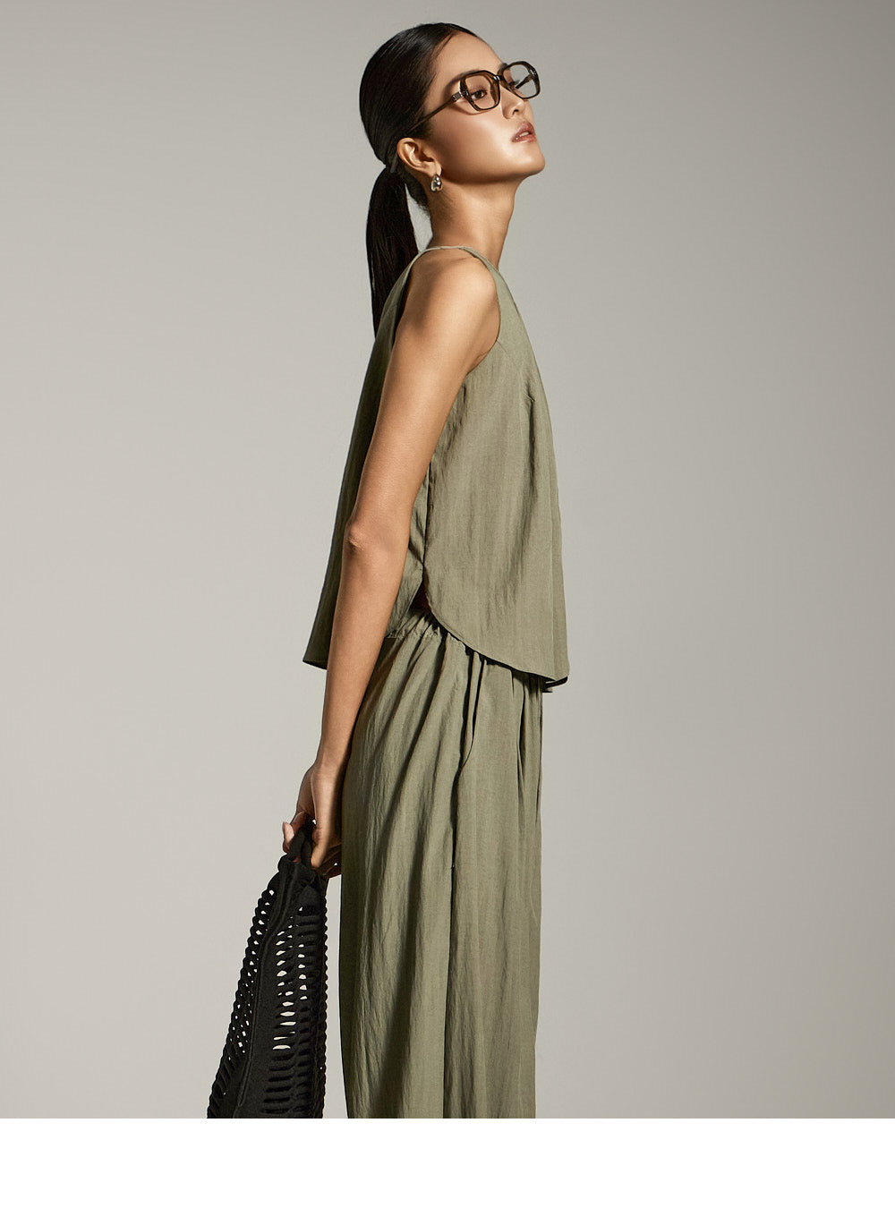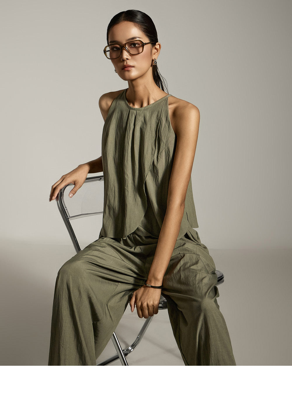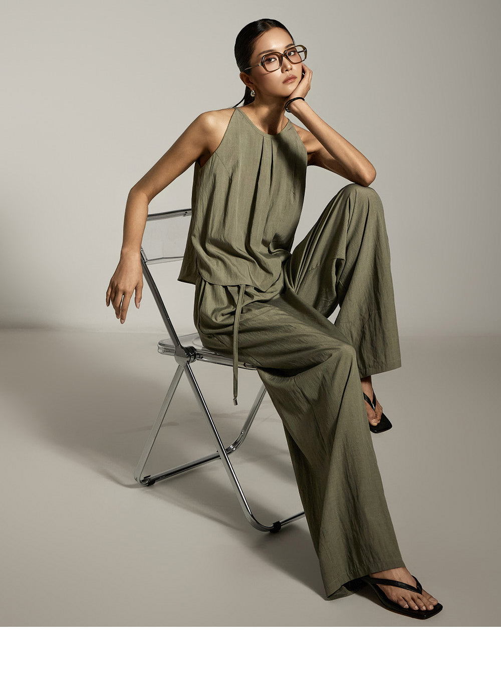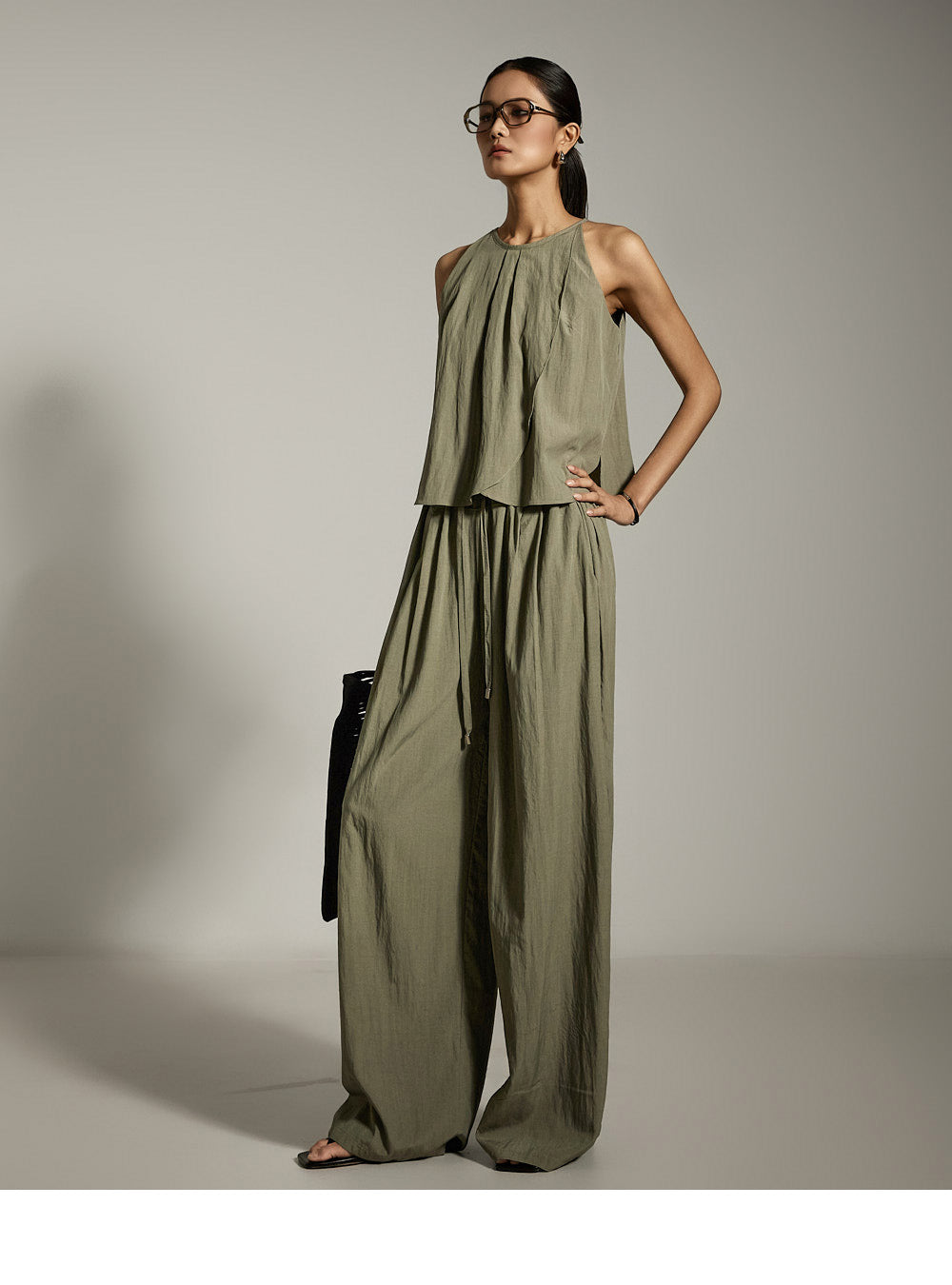 リラックスした日常的な雰囲気を演出するノースリーブのトップスとパンツのセットです。