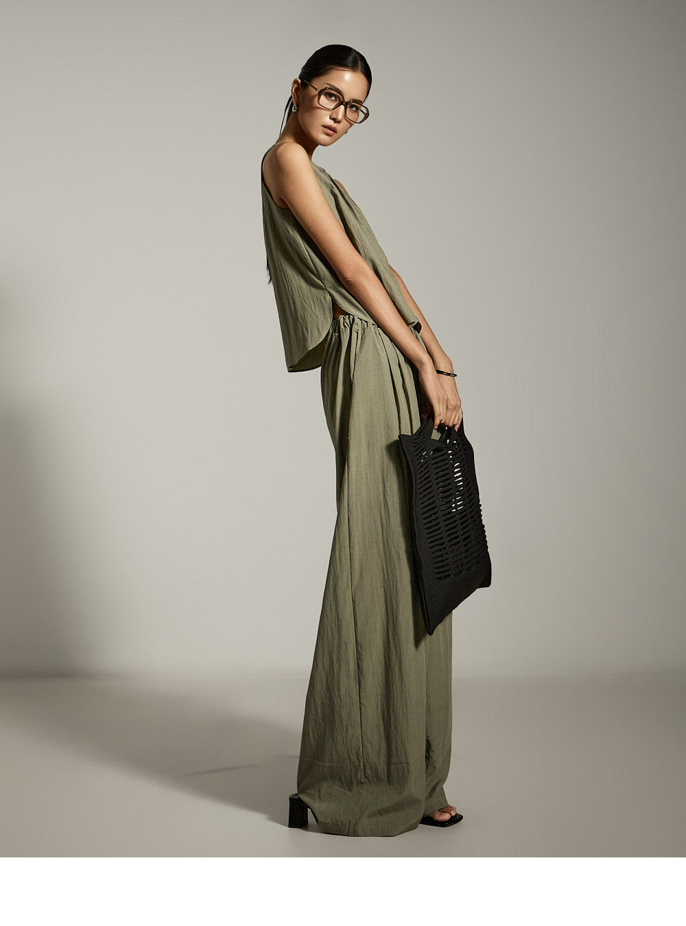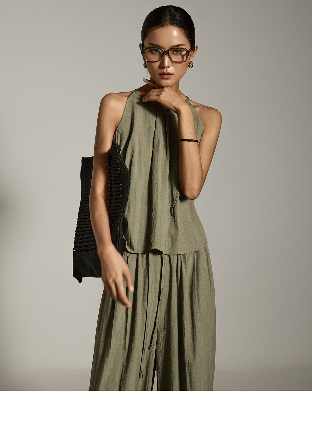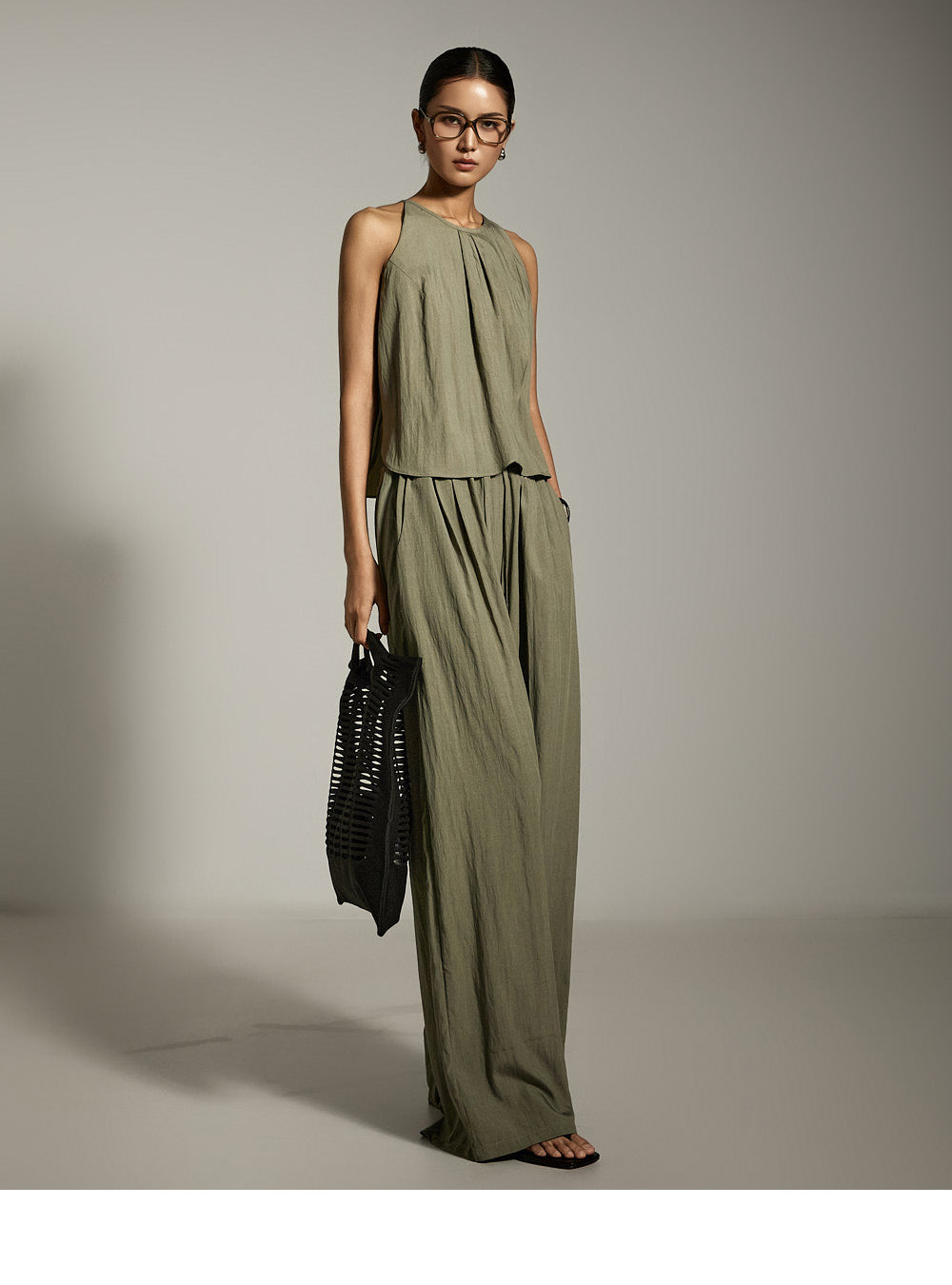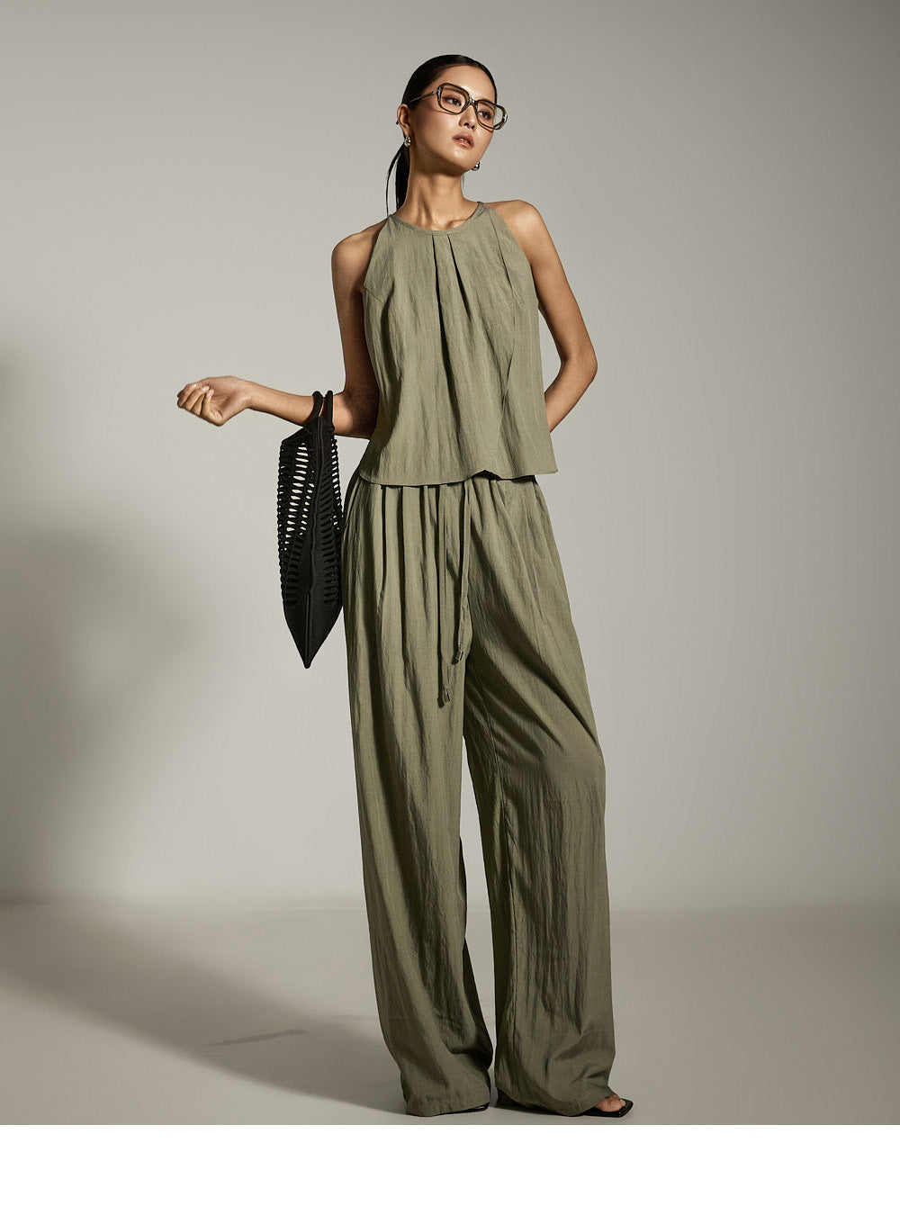 リラックスした日常的な雰囲気を演出するノースリーブのトップスとパンツのセットです。
