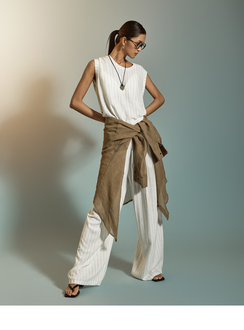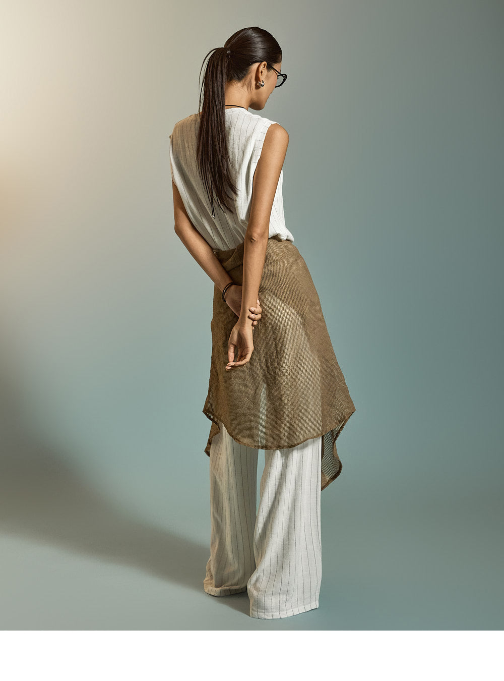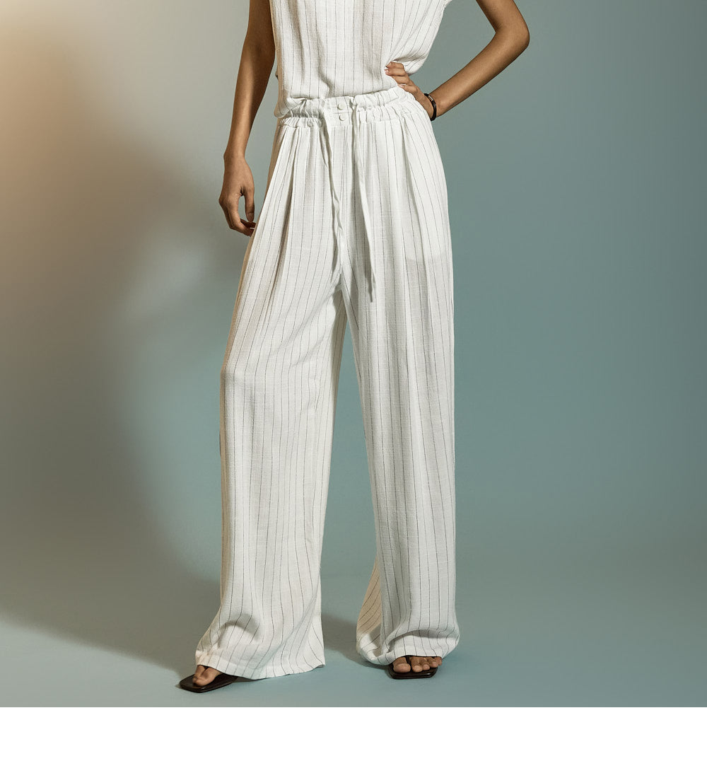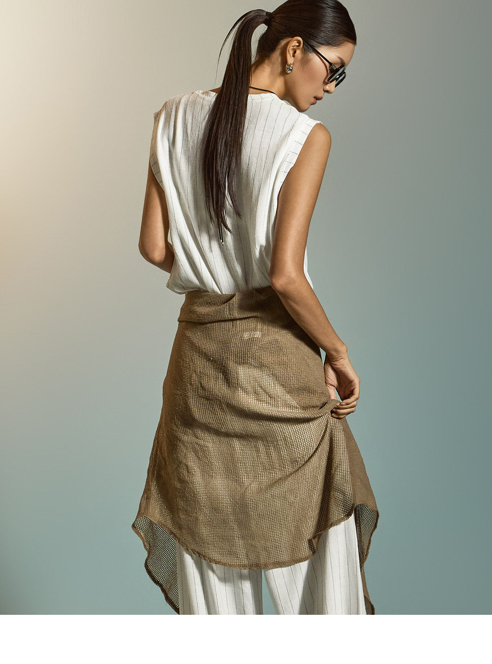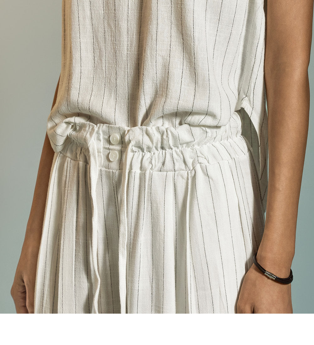 ピンタックのディテールが脚を長く見せ、