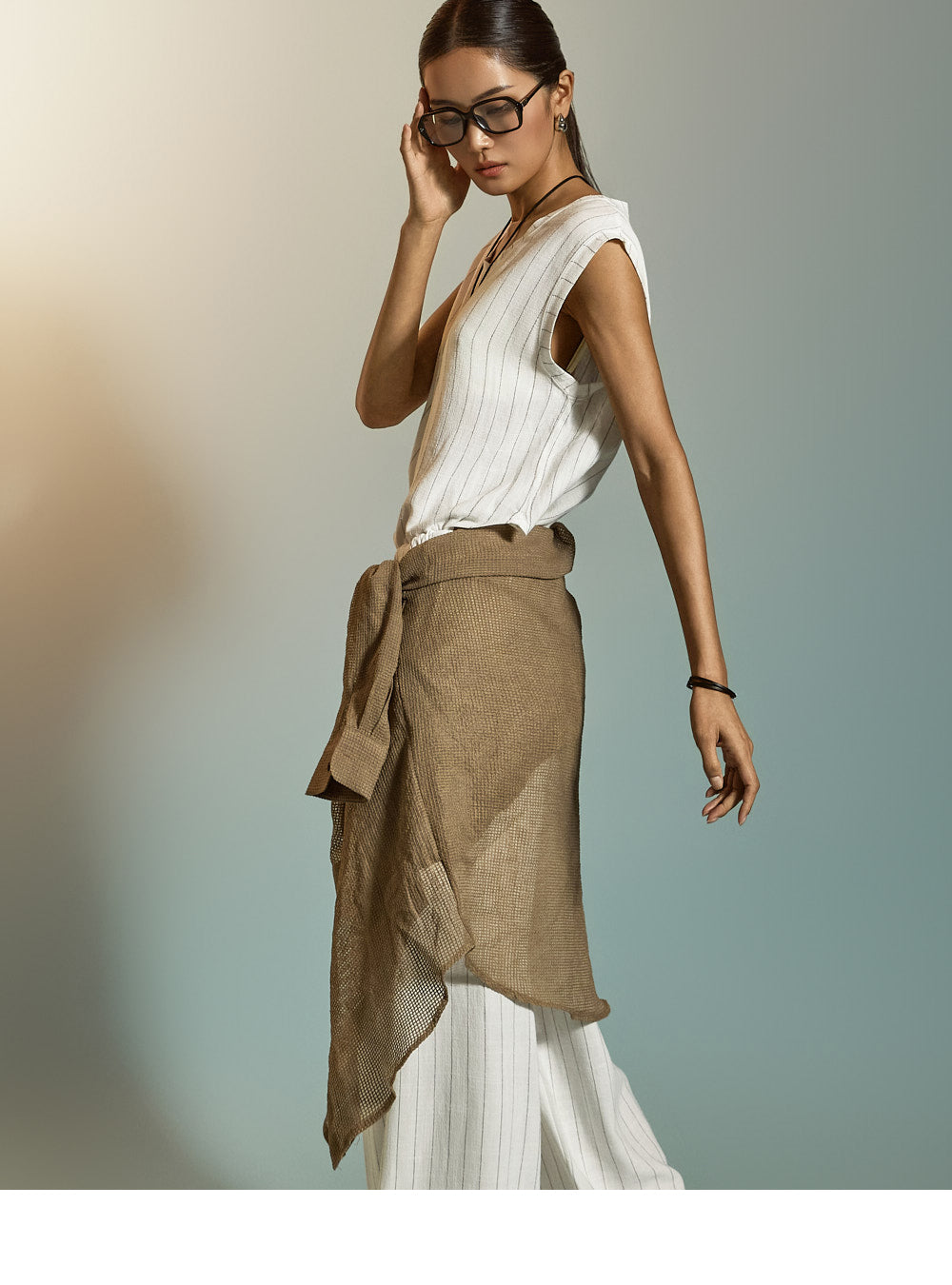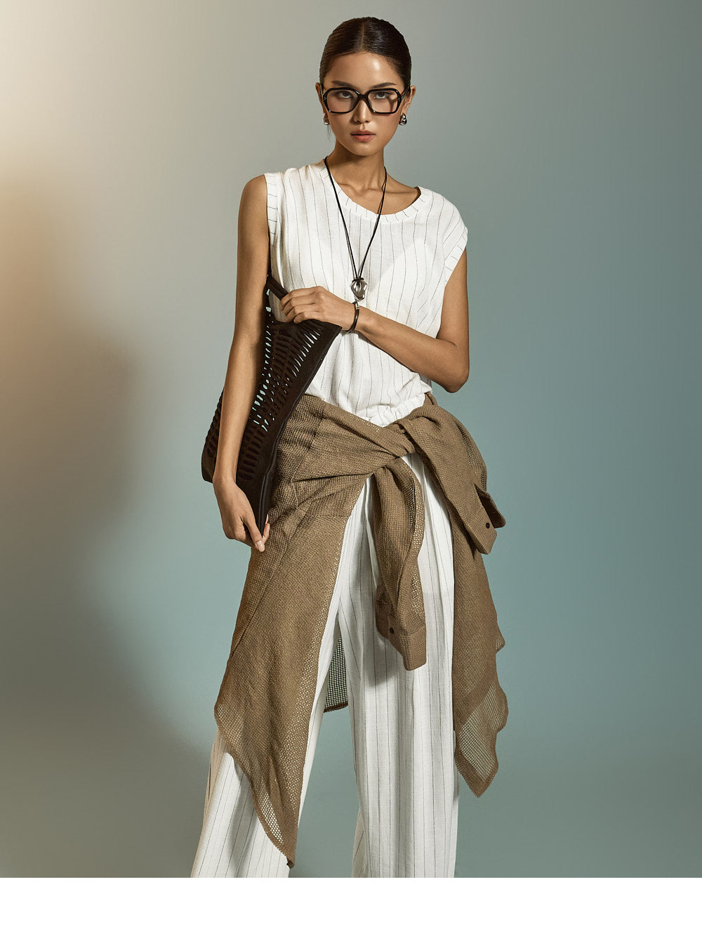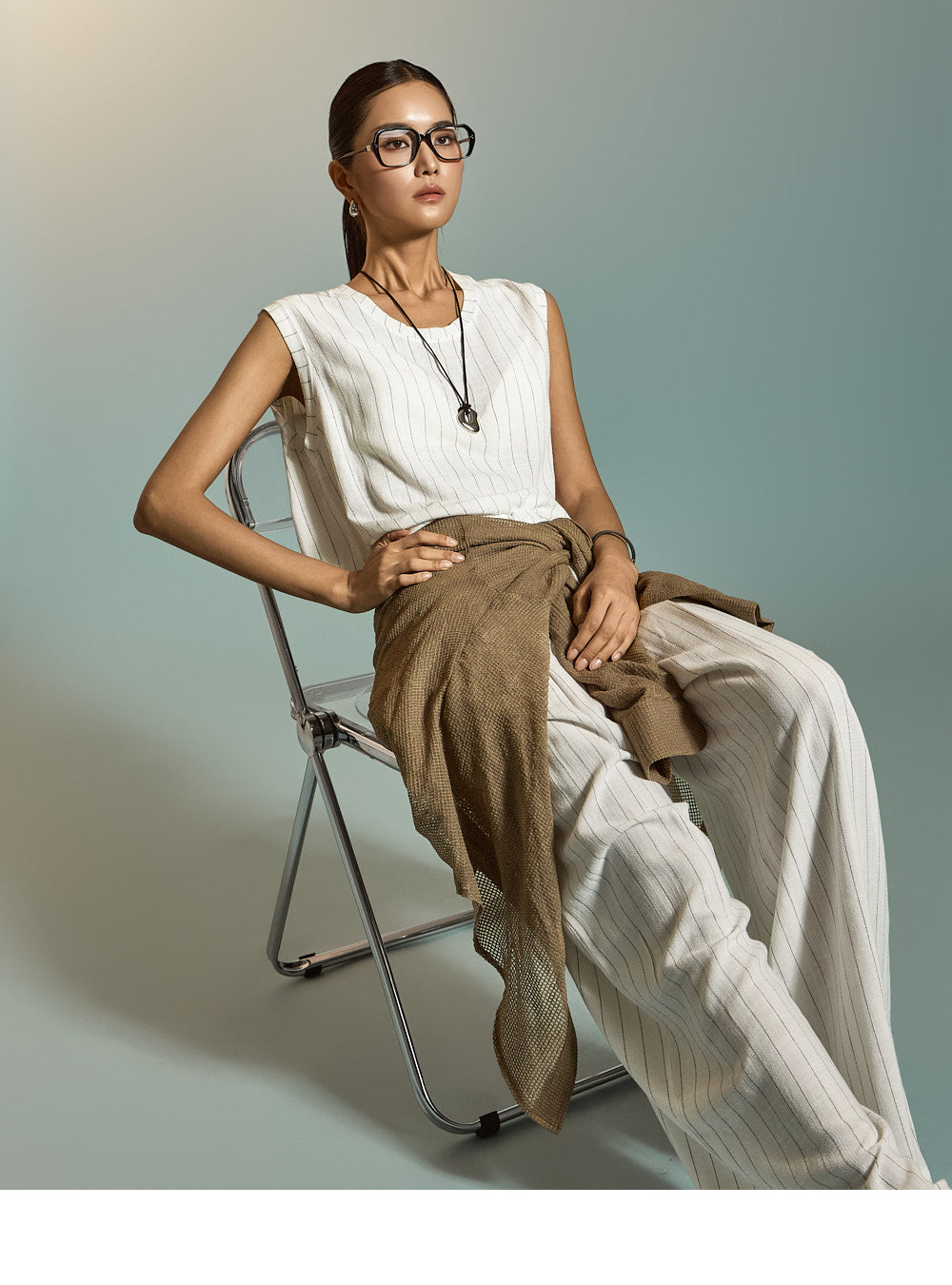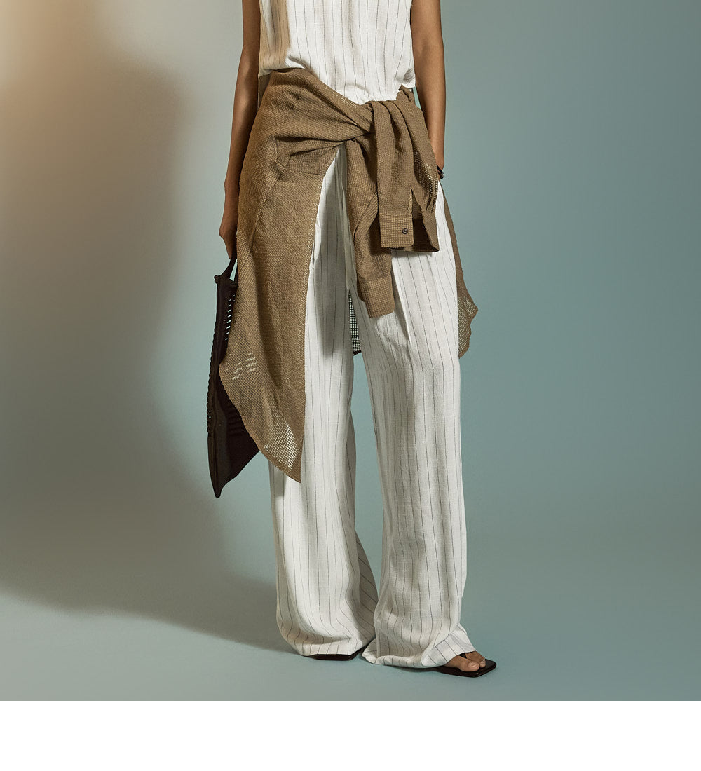 トップスは洗練されたストライプ柄