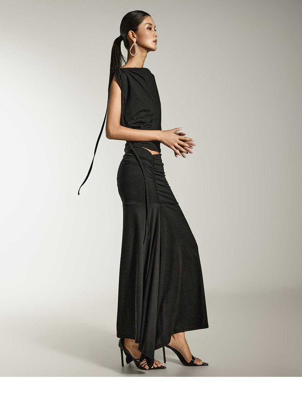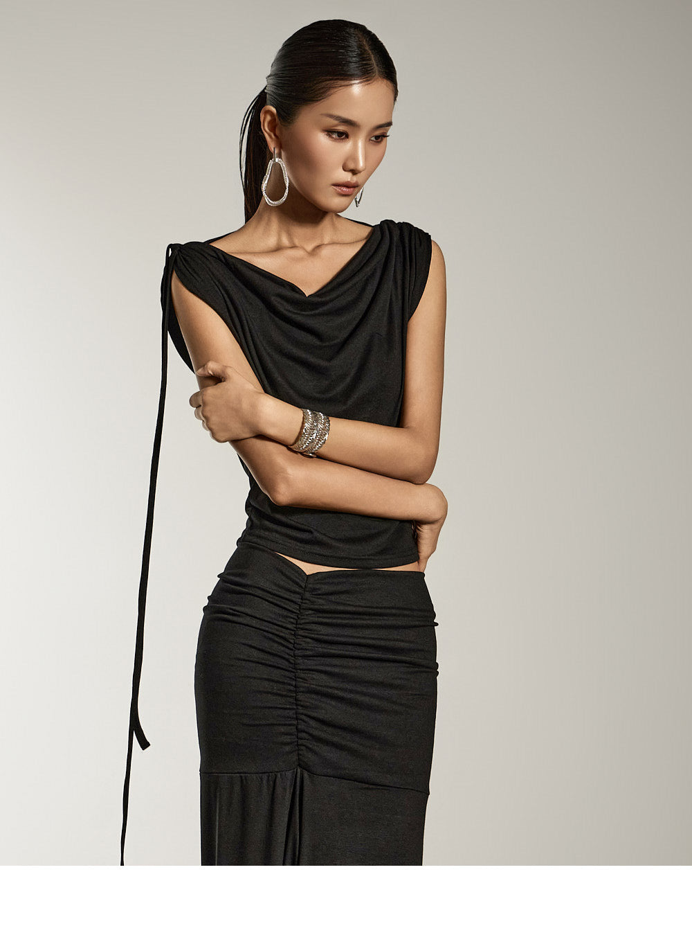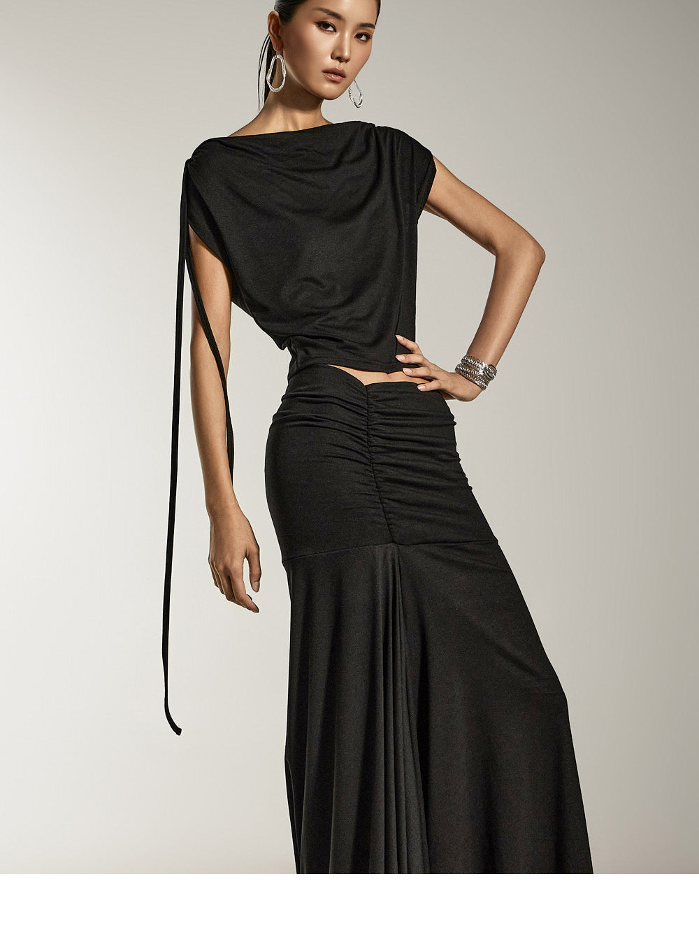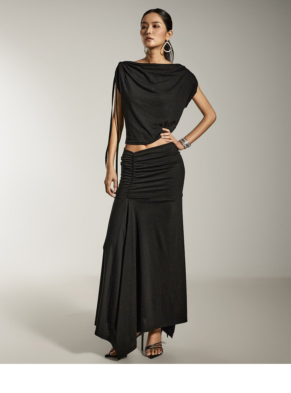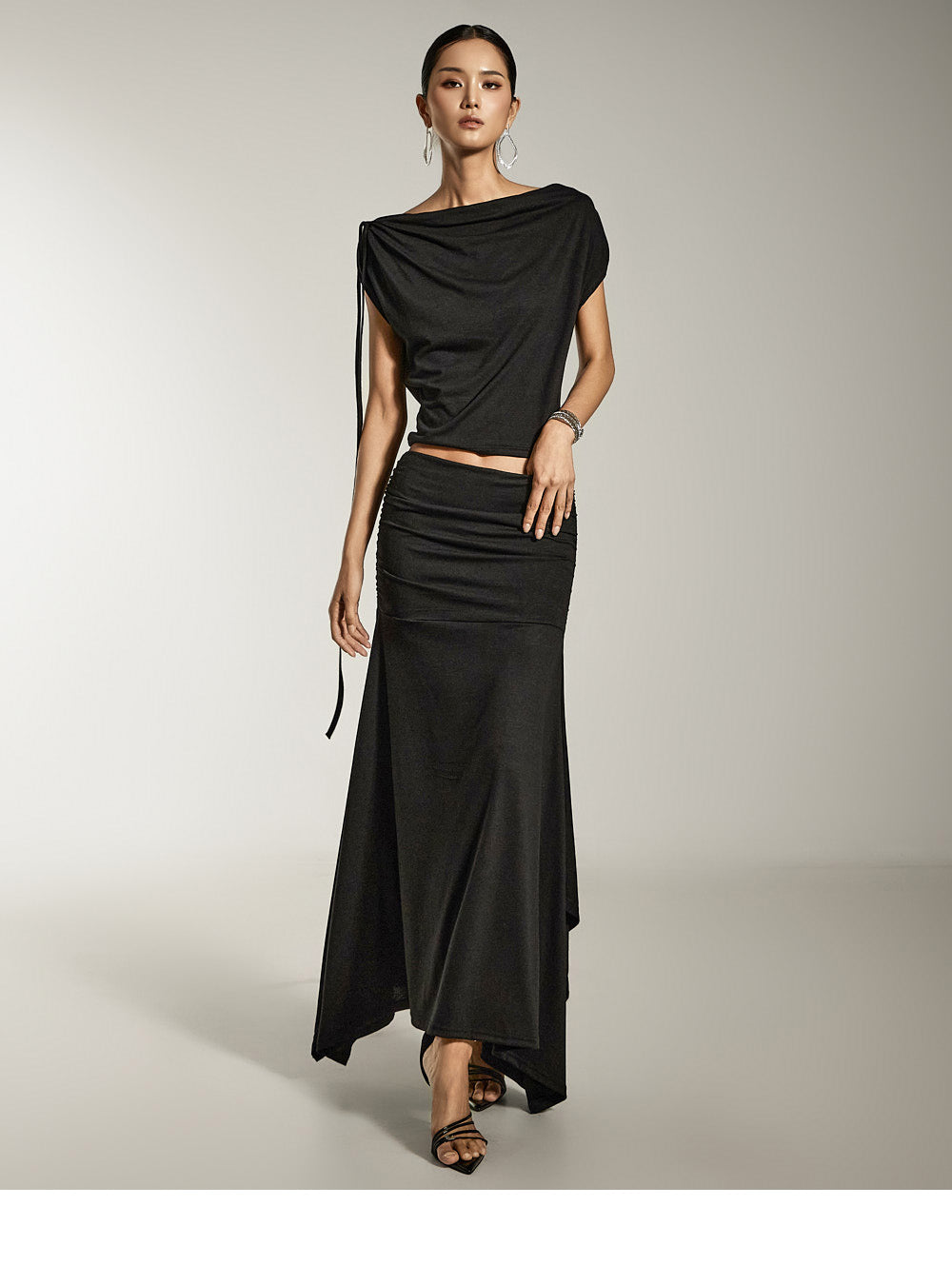 ドレープトップスとシャーリングスカートがお洒落なセットです。