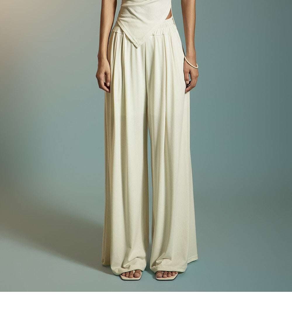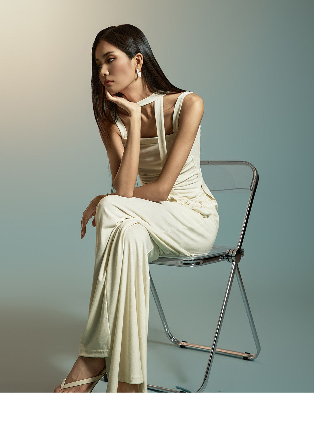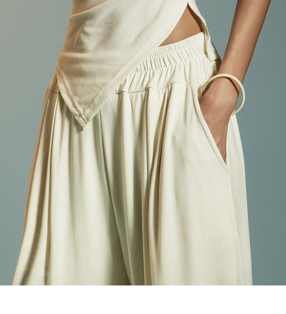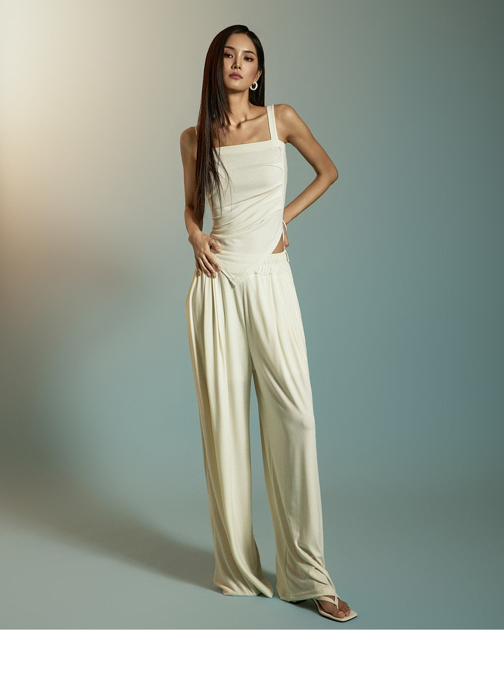 ノースリーブのトップスとリラックスフィットのパンツは、すっきりとした構造的なシルエットで快適さとスタイルの両方を提供します。