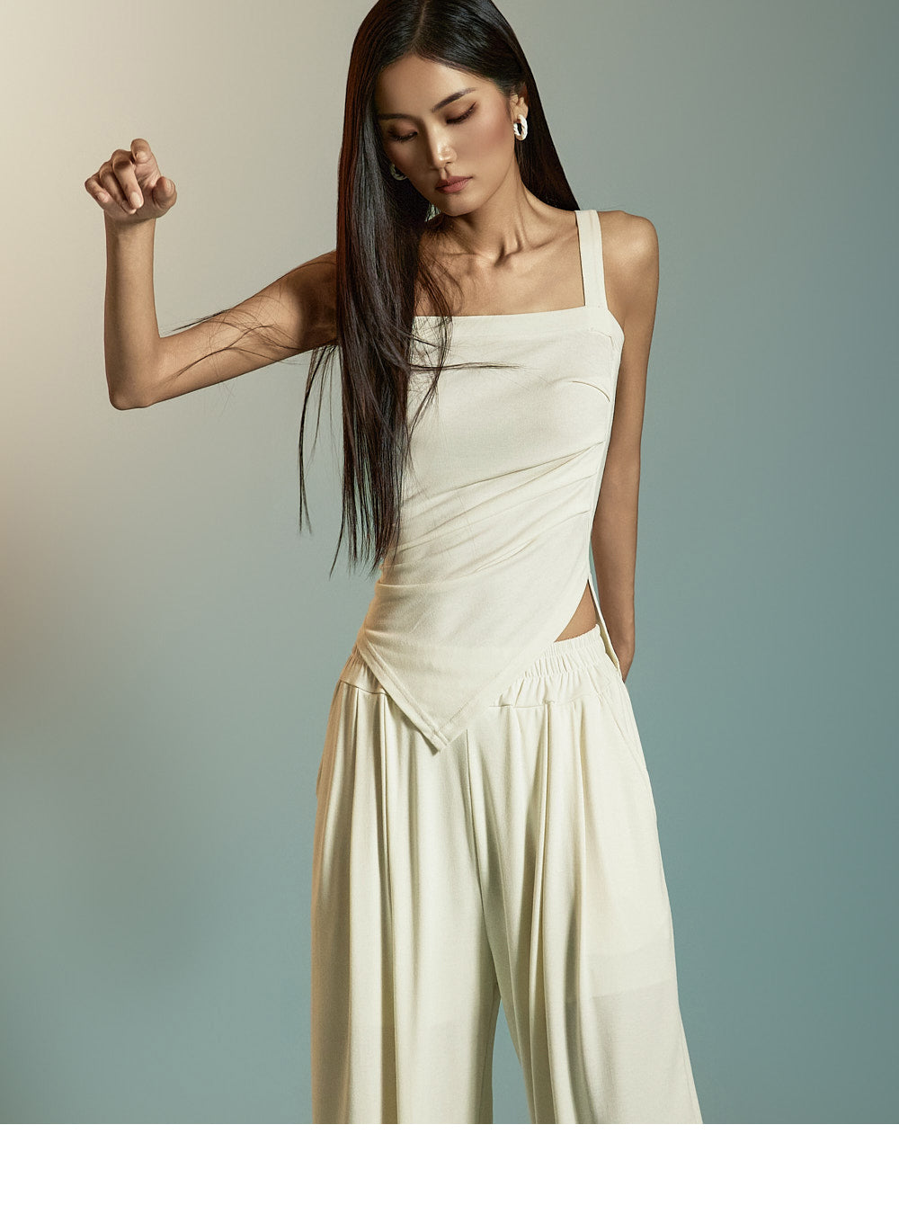 トップスはアシンメトリーなカットとスリムフィットが特徴で、