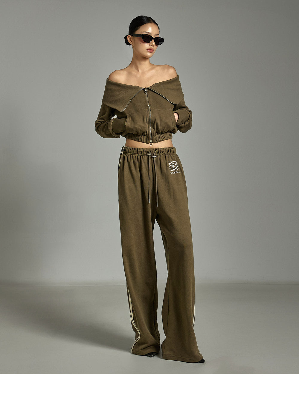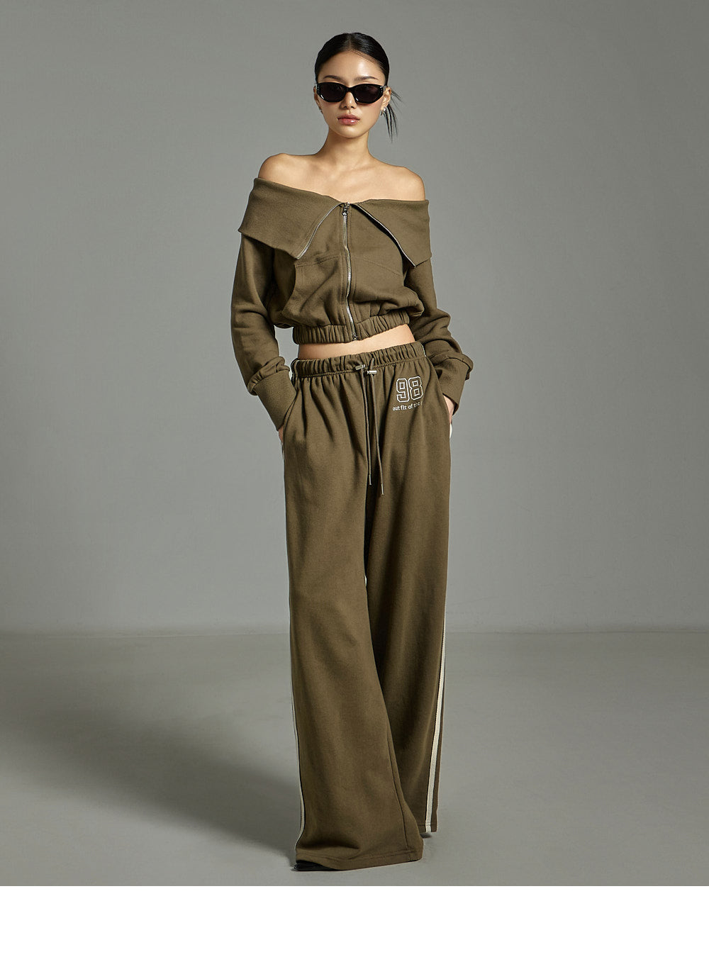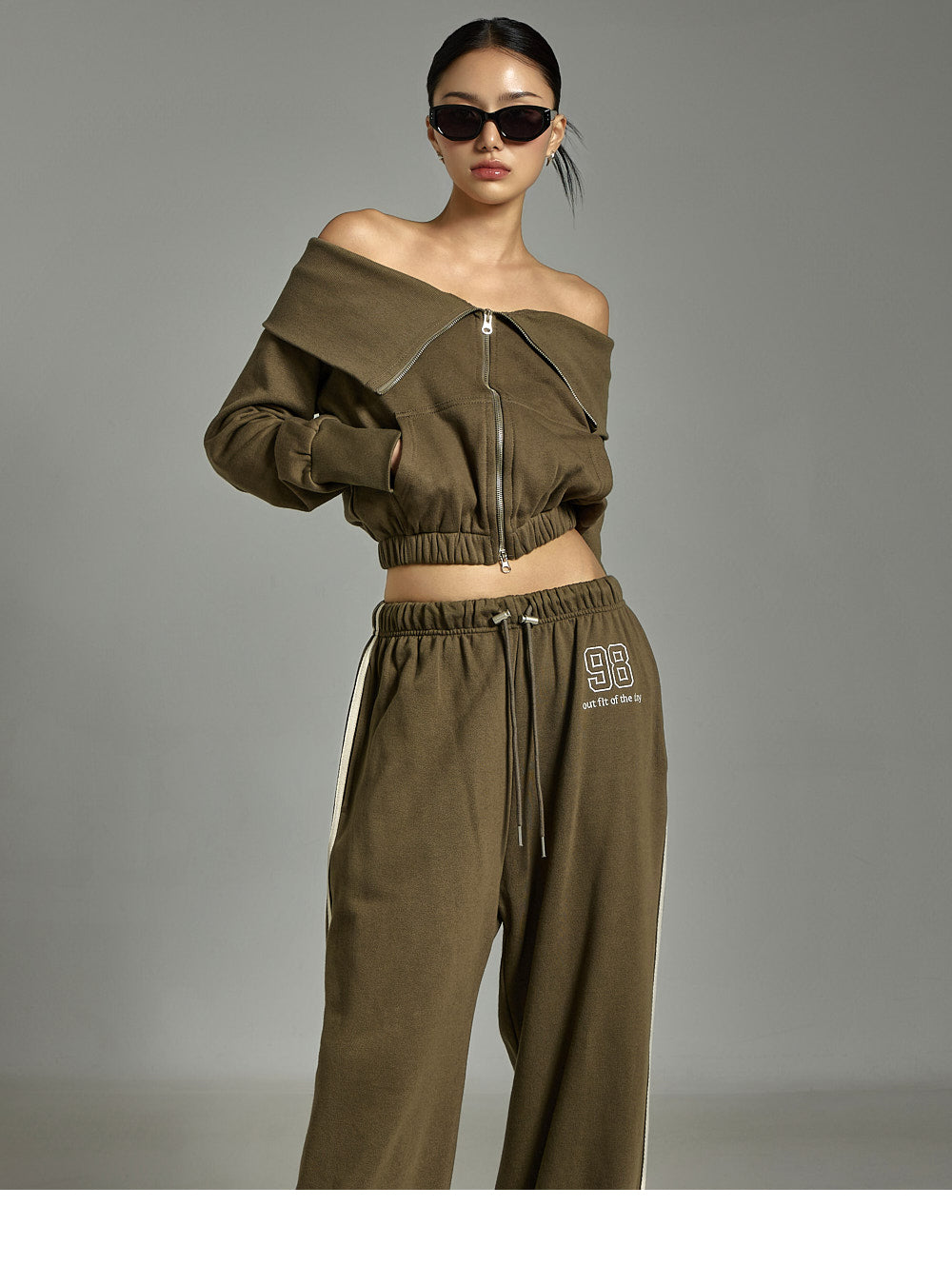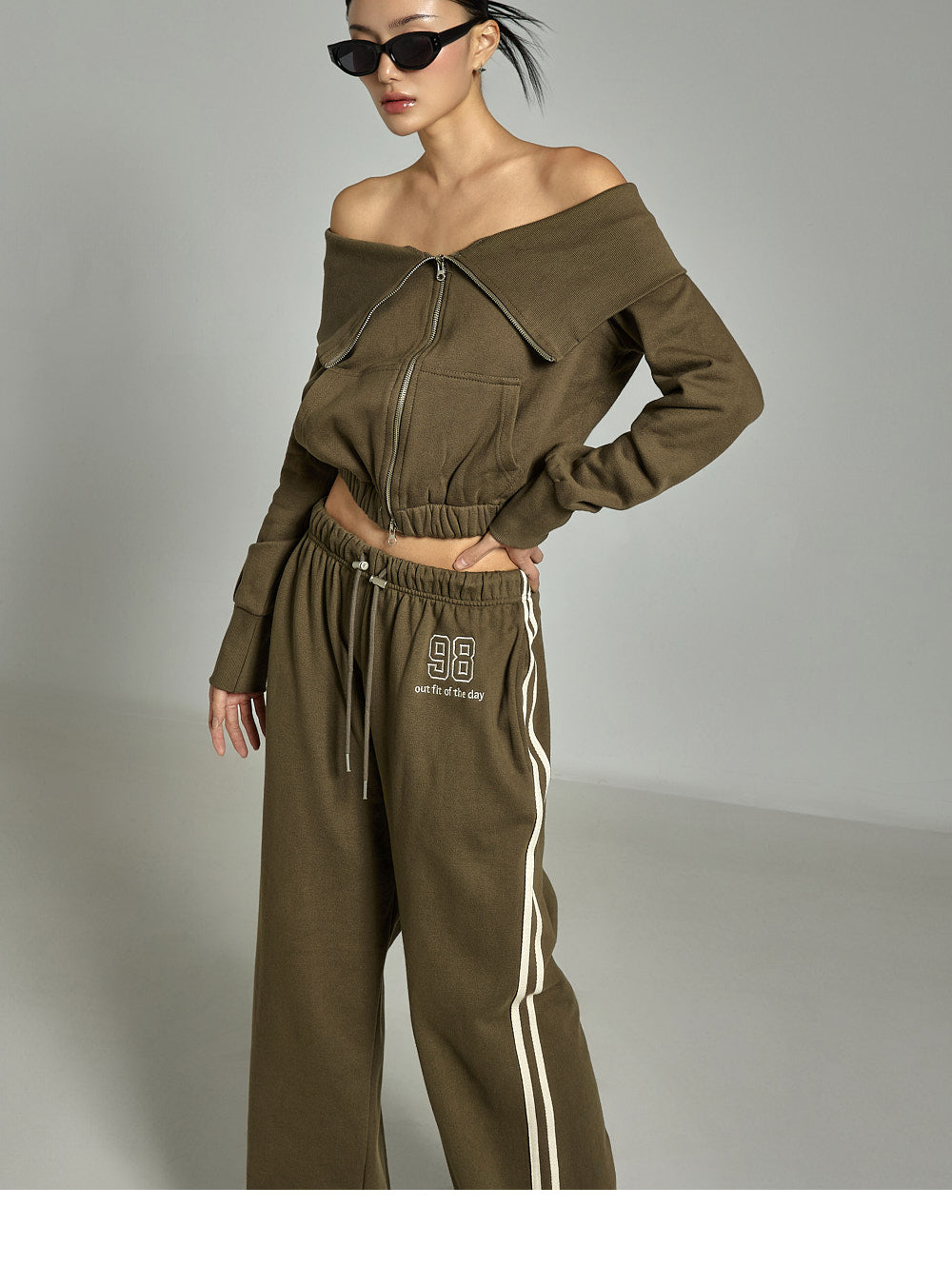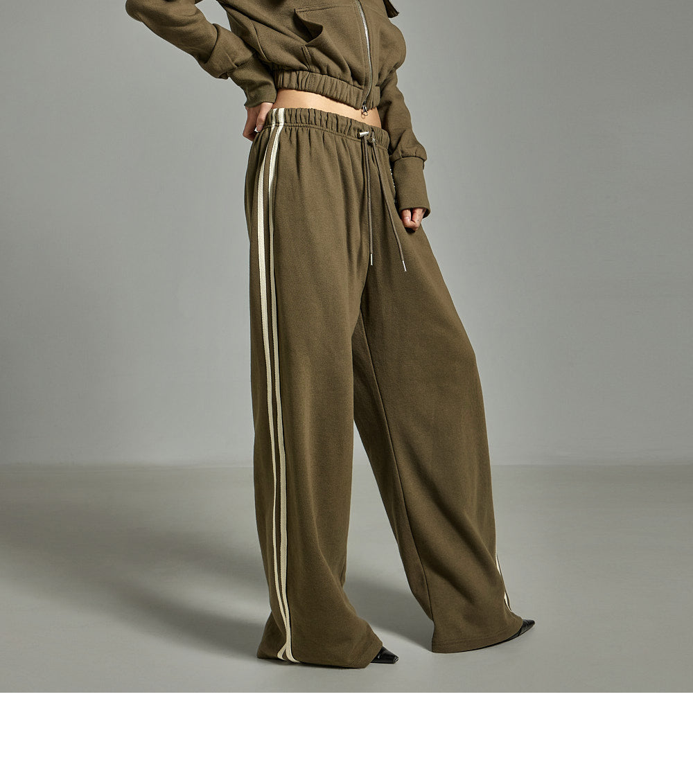 This zip-up pants set has a casual vibe.