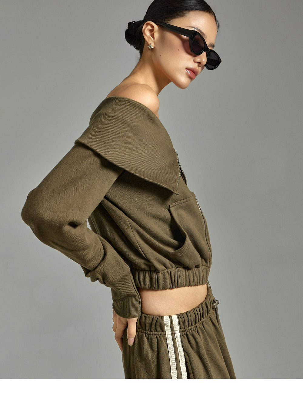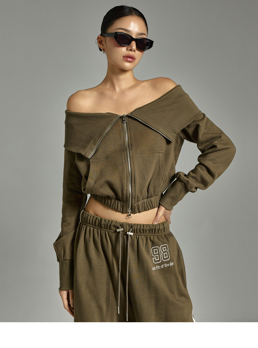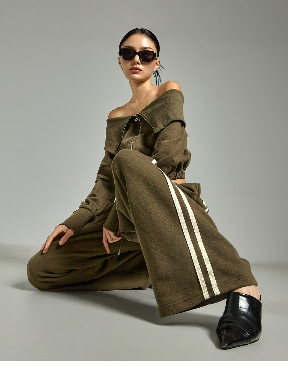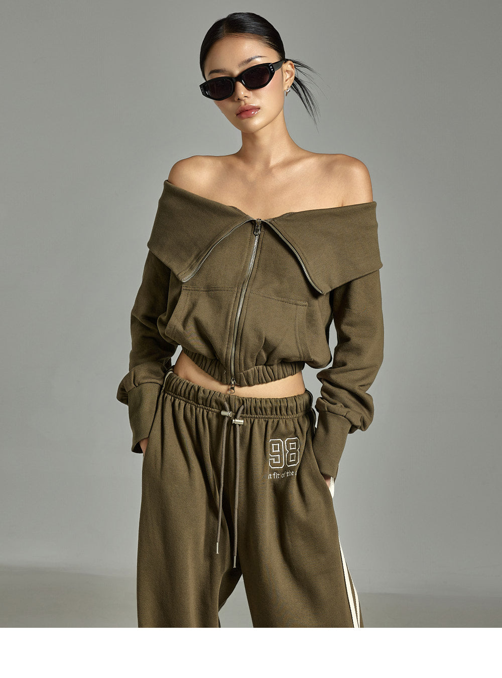 This zip-up pants set has a casual vibe.