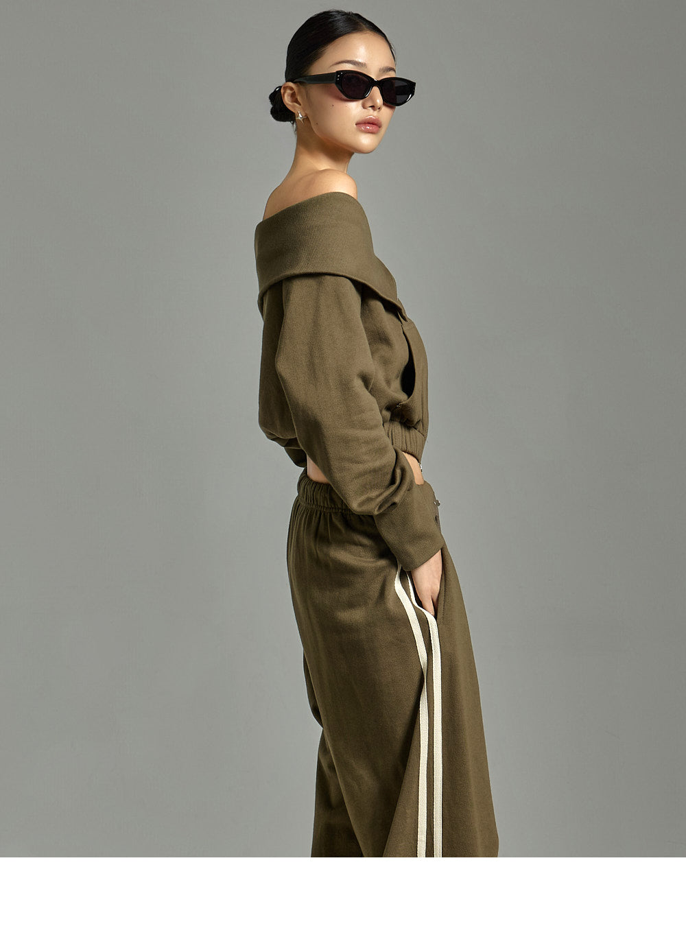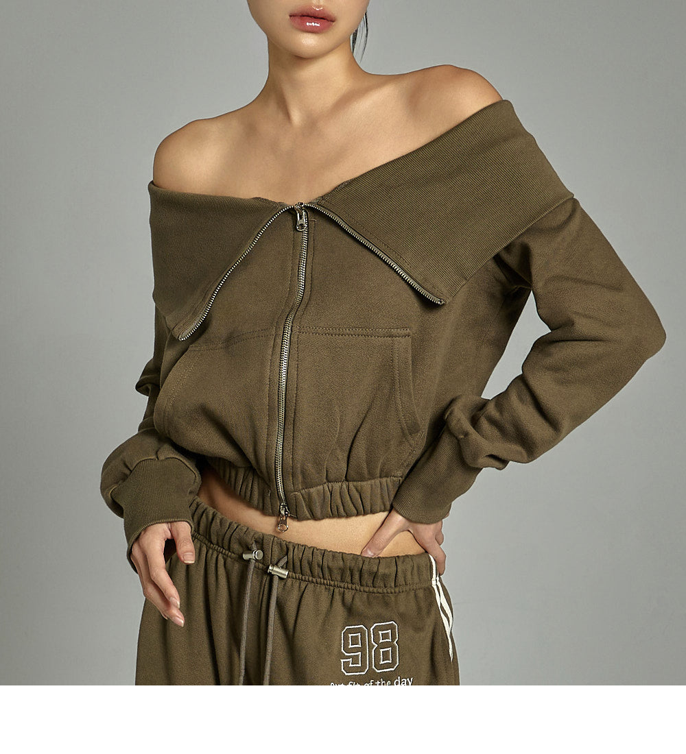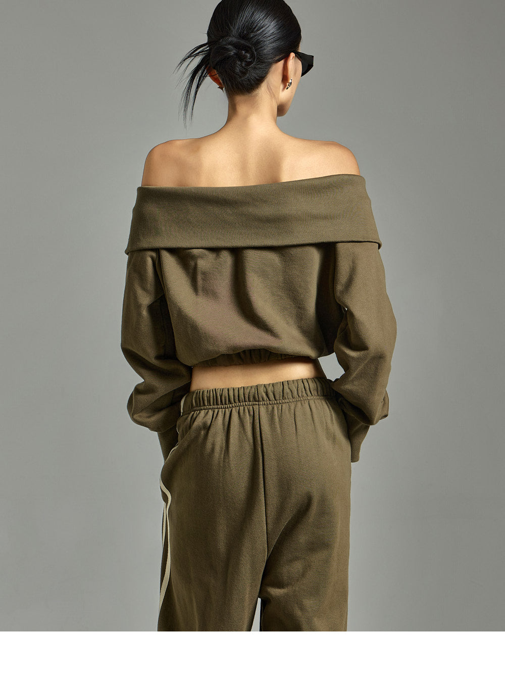 The top features an off-the-shoulder design and a cropped length,