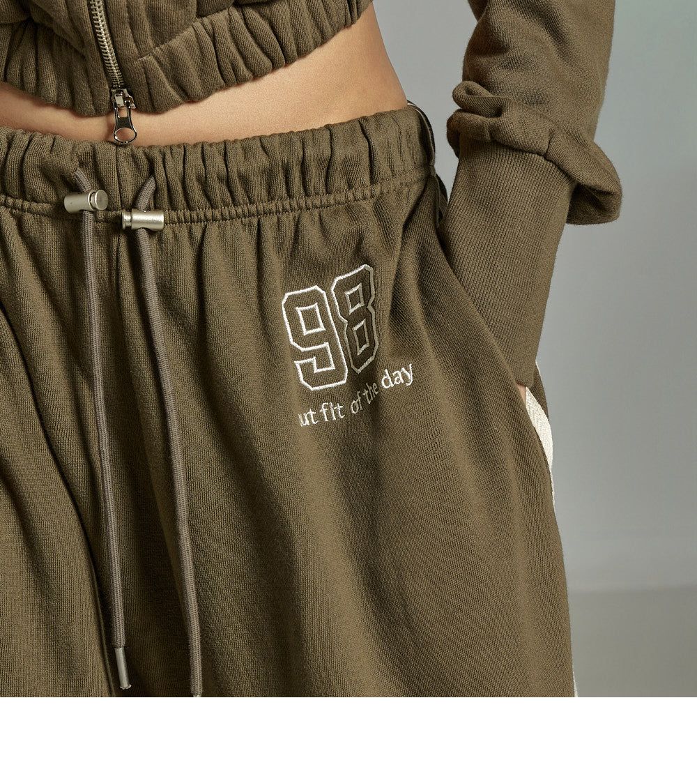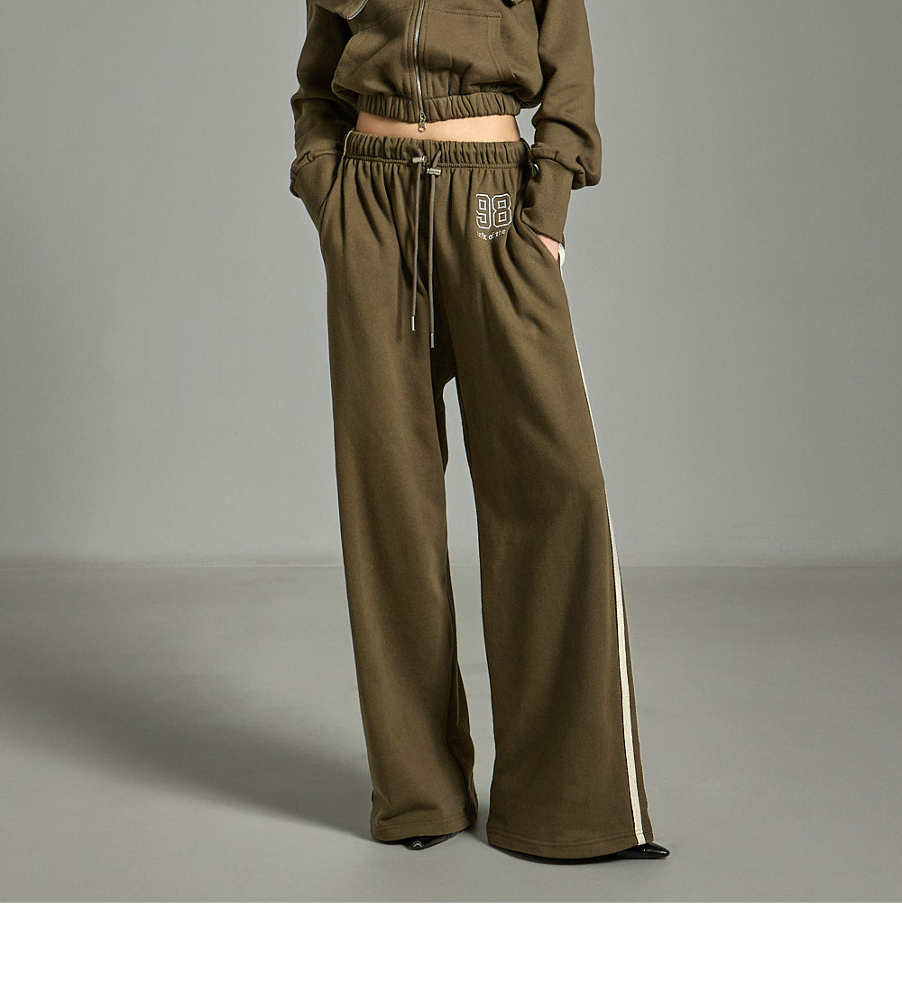 The bottoms feature a wide-leg workout pants silhouette,