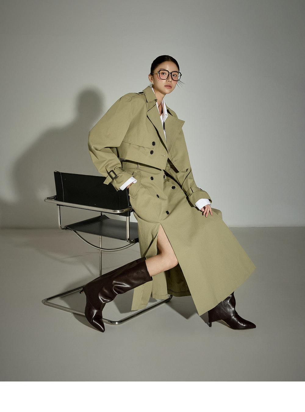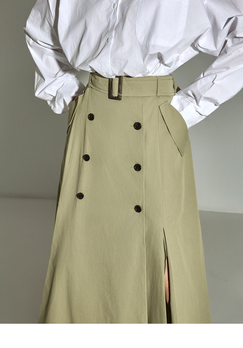 The front button closure and slit details enhance freedom of movement,