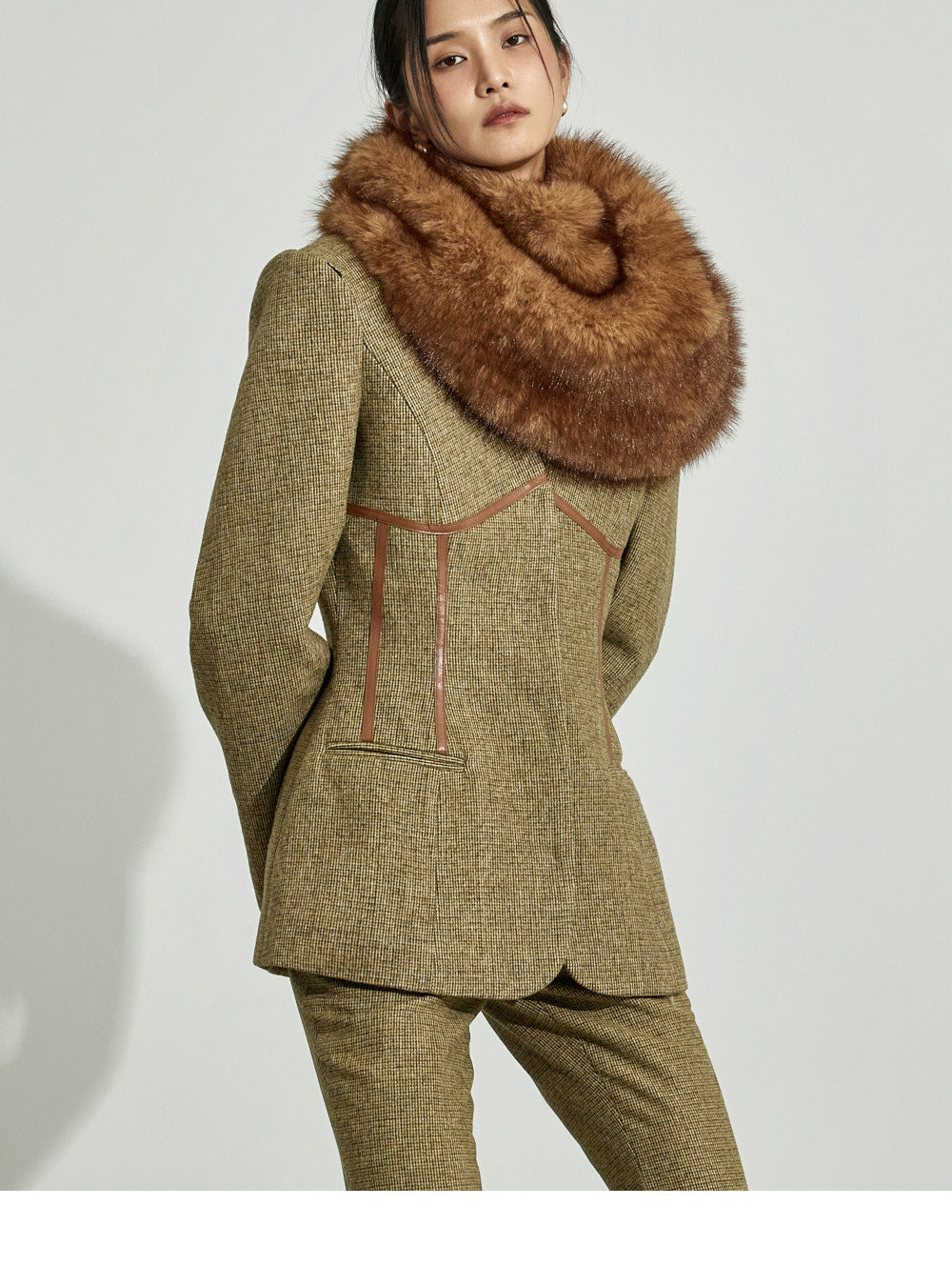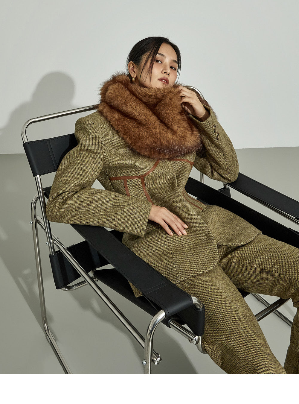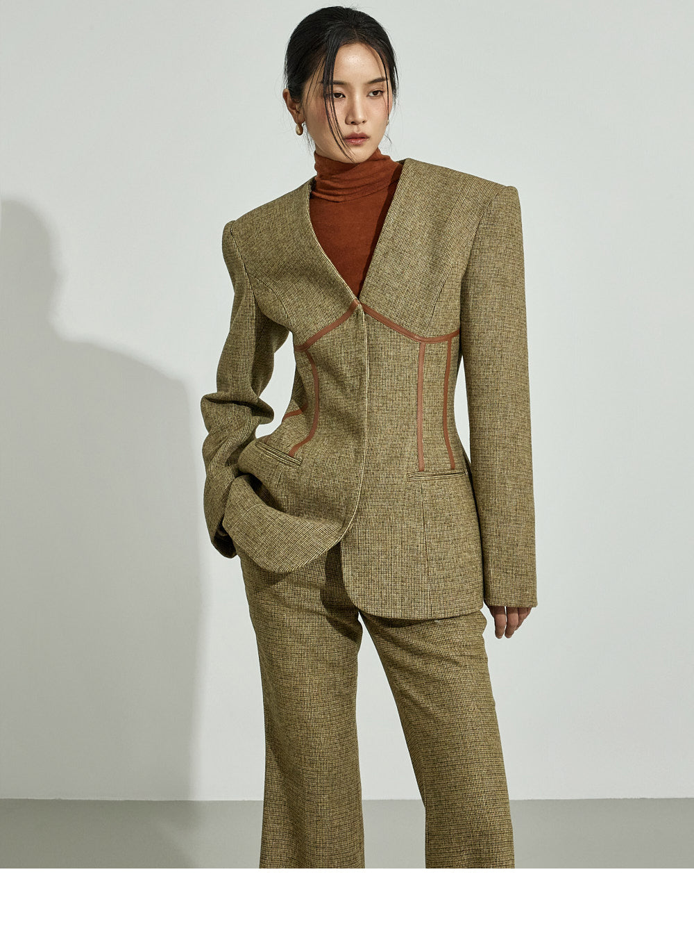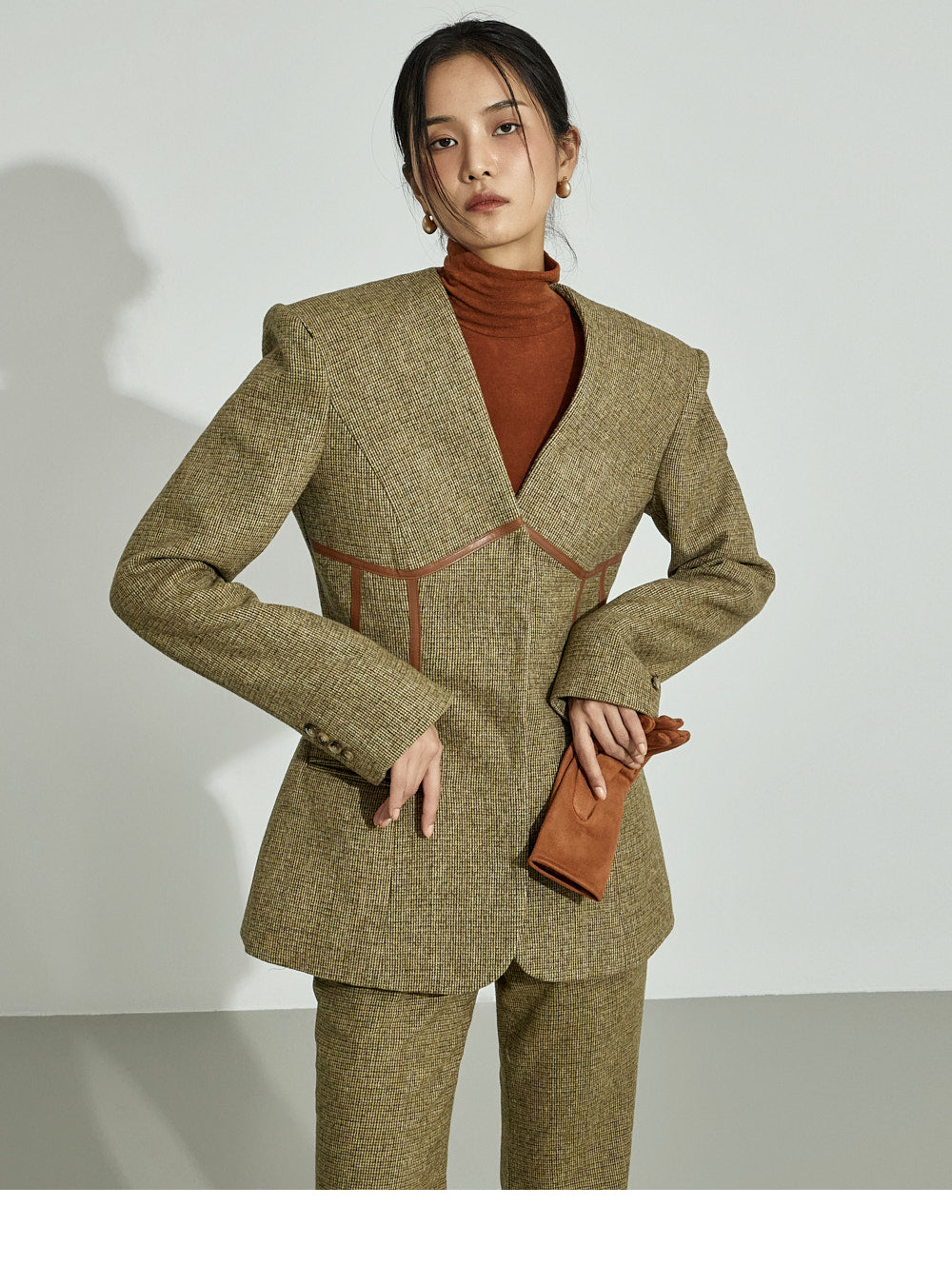 while the no-collar design and moderate shoulder pads create a structured silhouette.