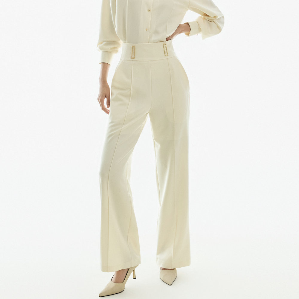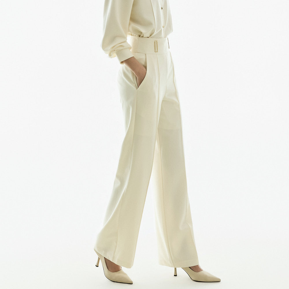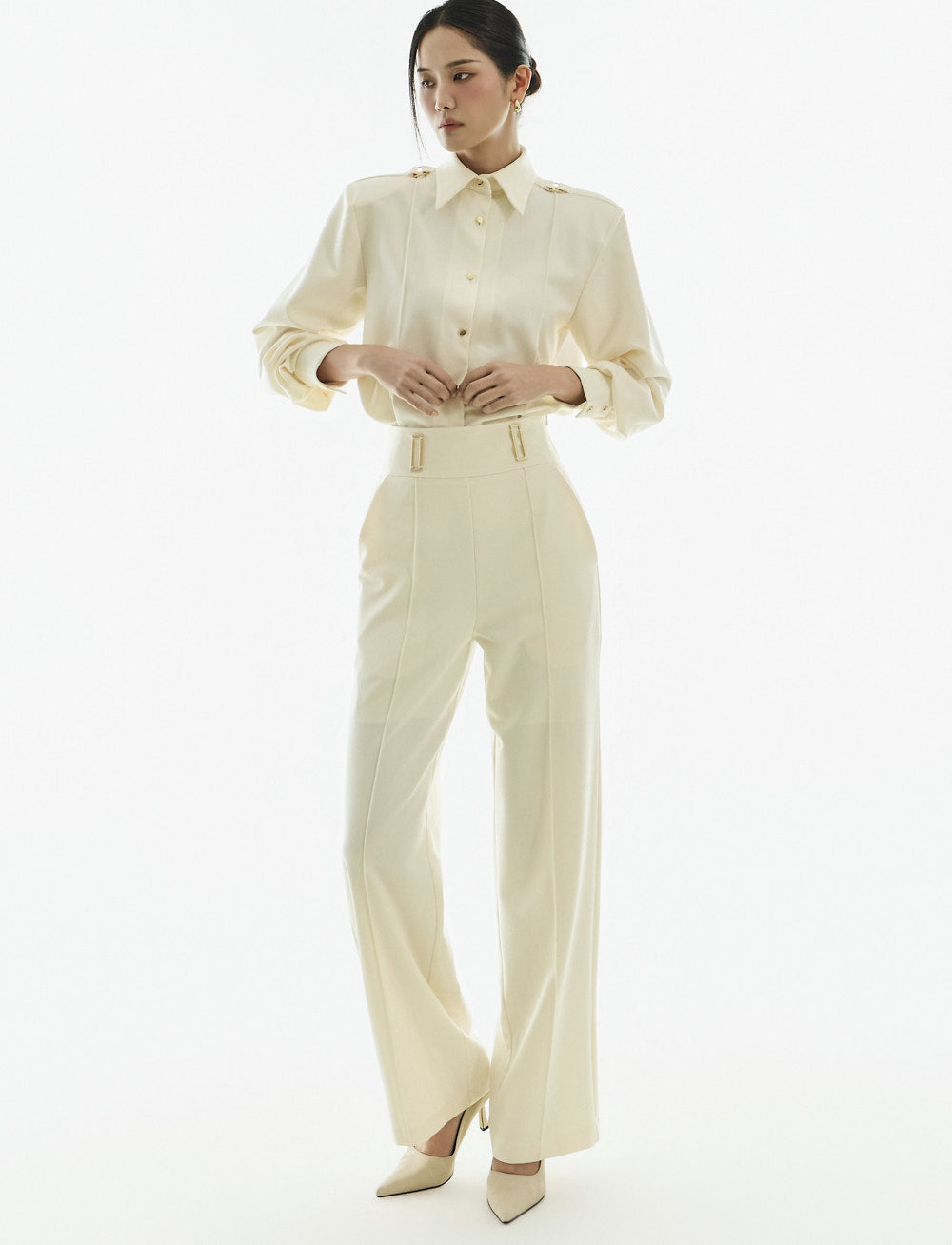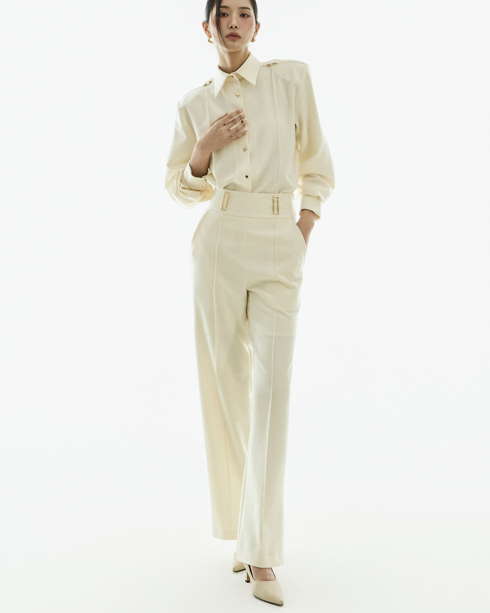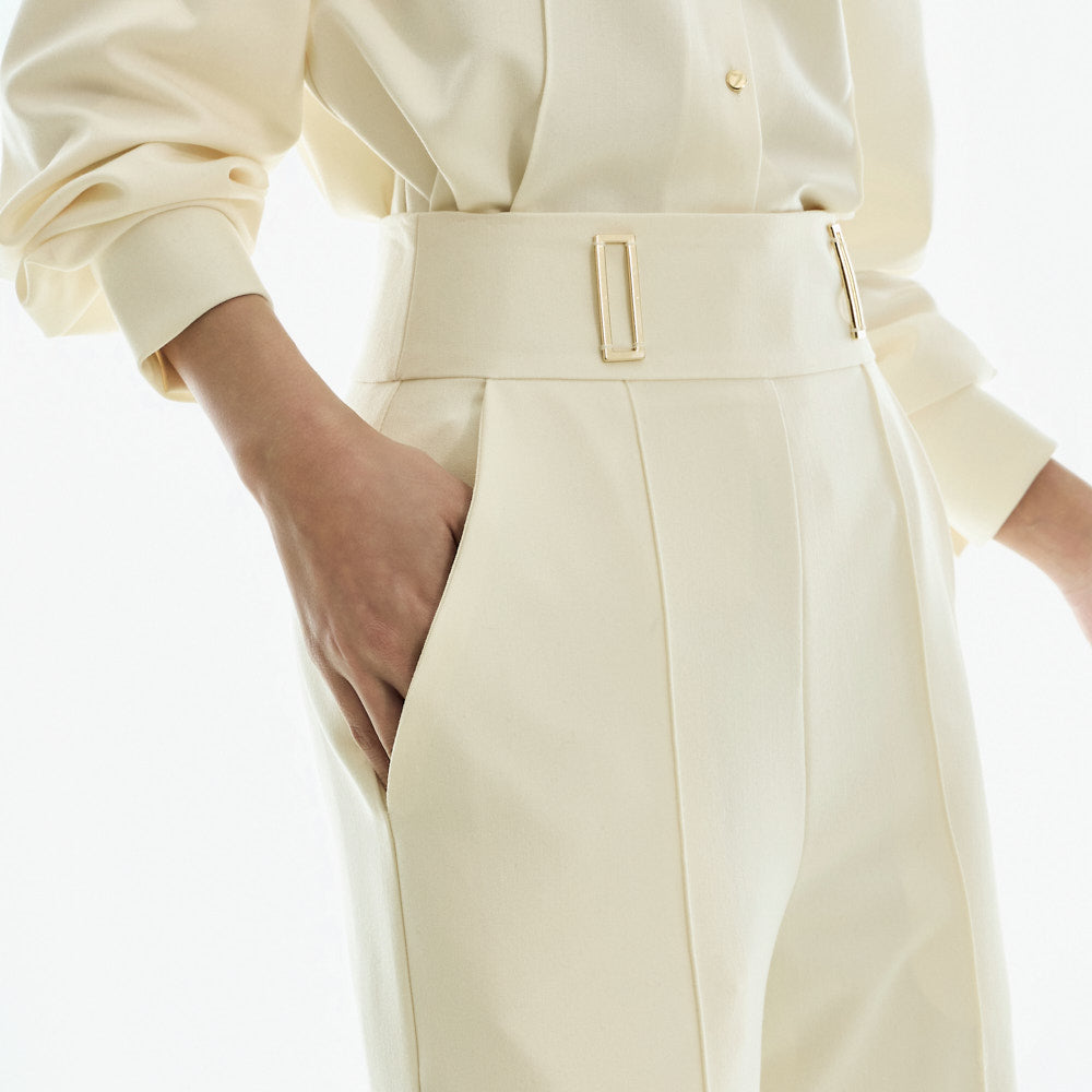 Model (173cm) wears the blouse in one size and the slacks in size S.