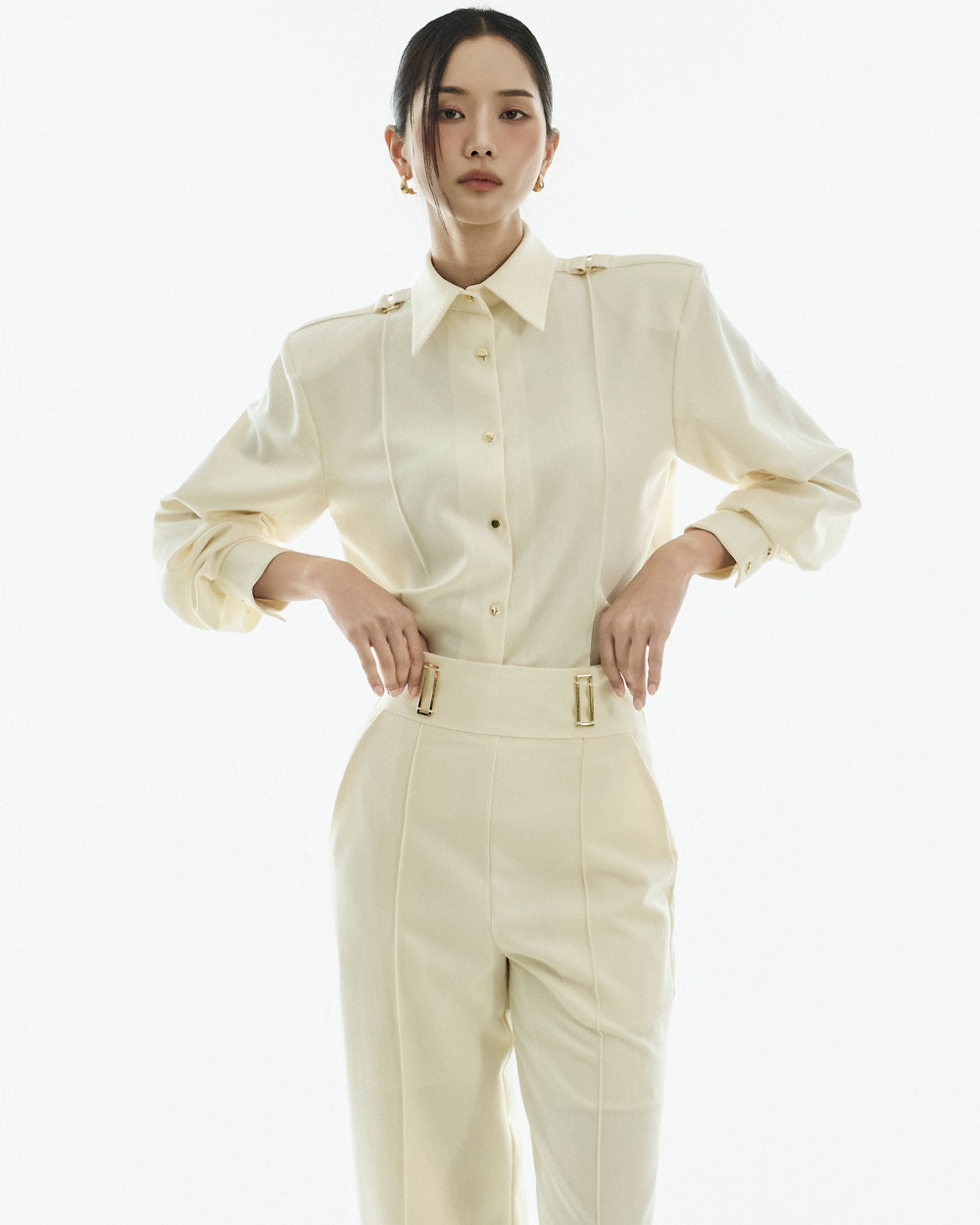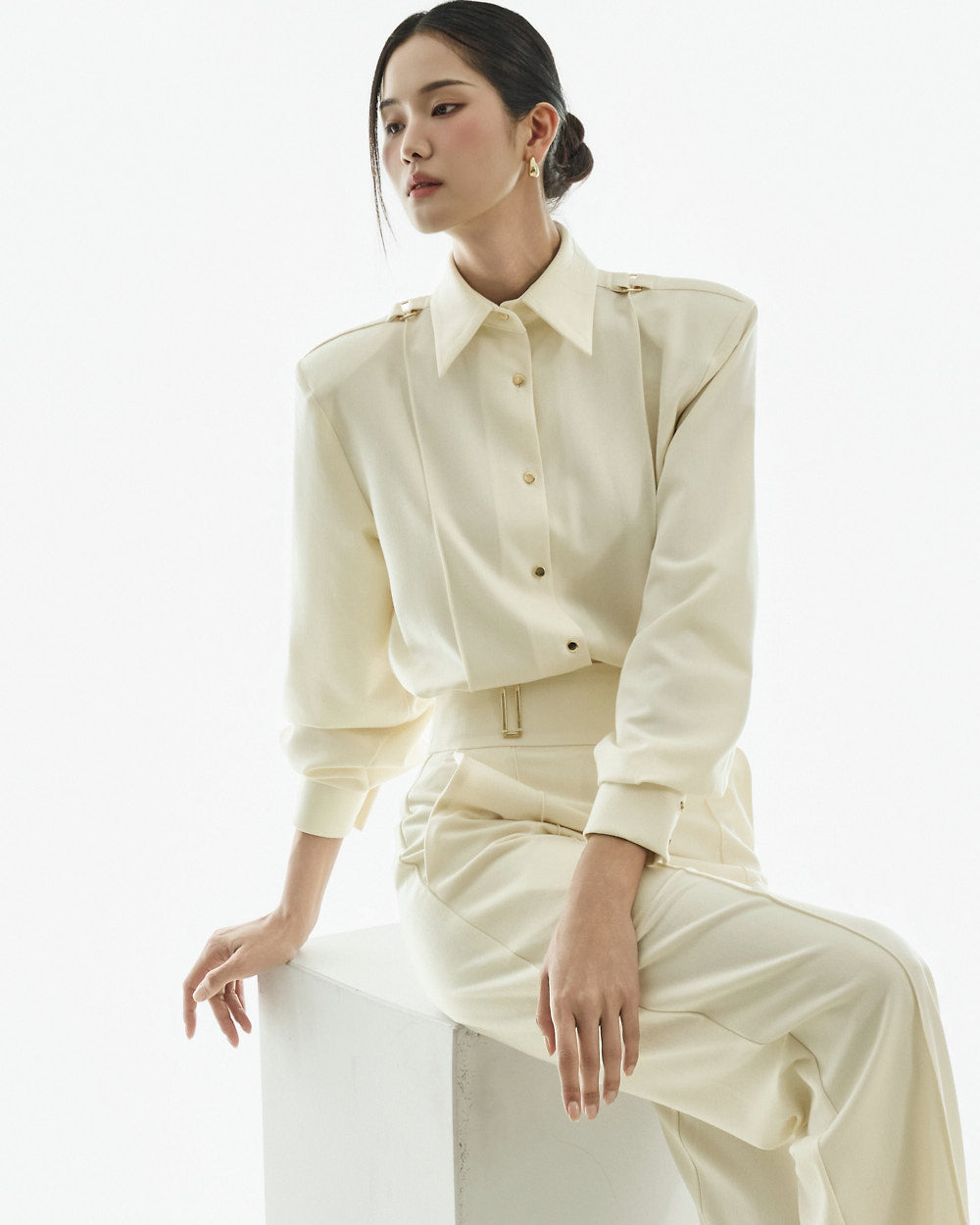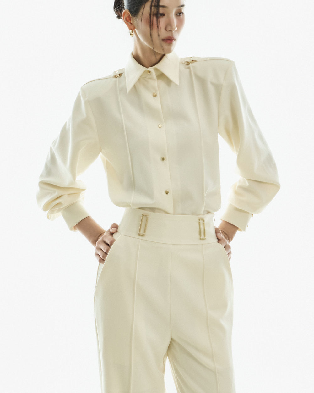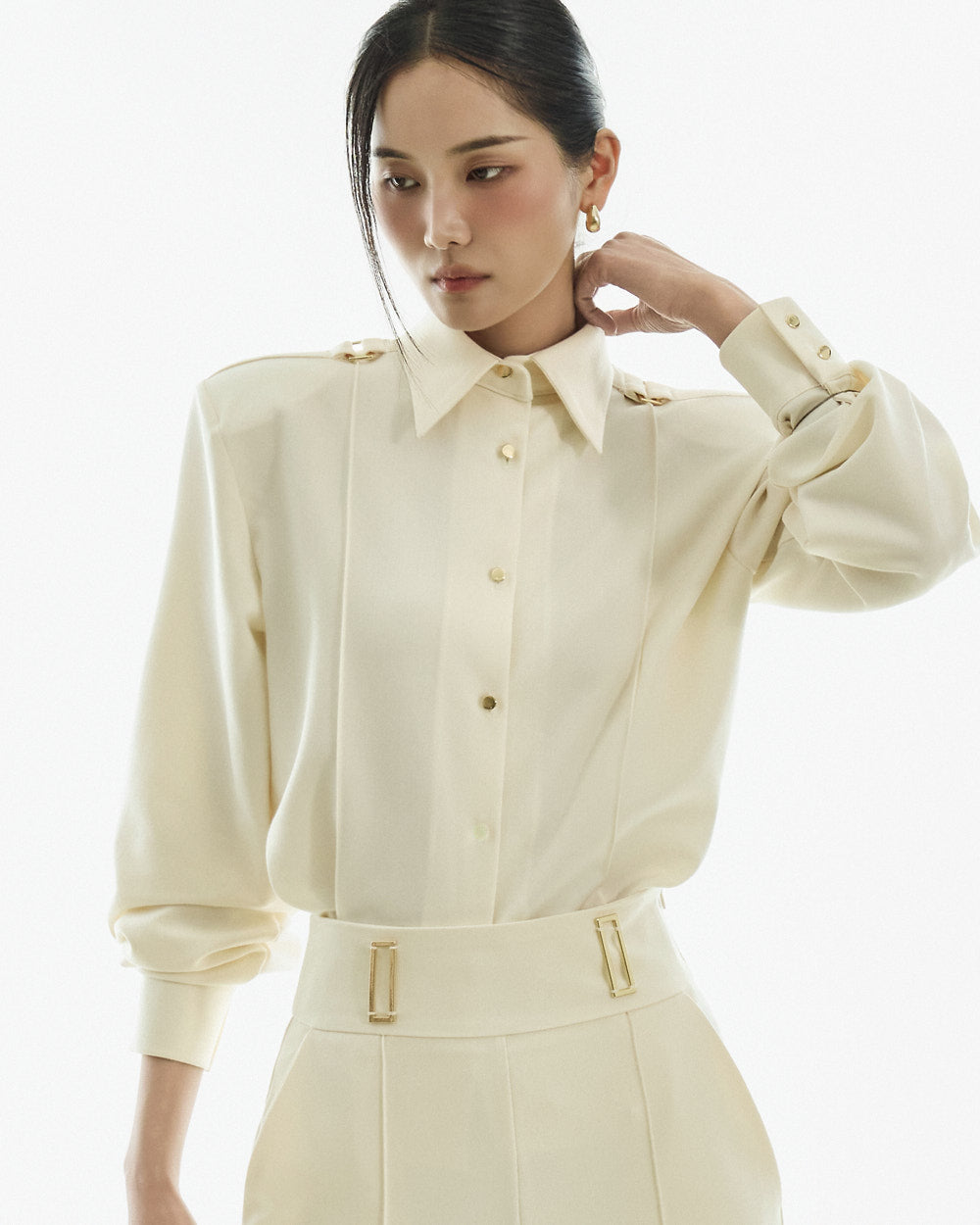 The blouse features a straight, fitted silhouette with shoulder pads and