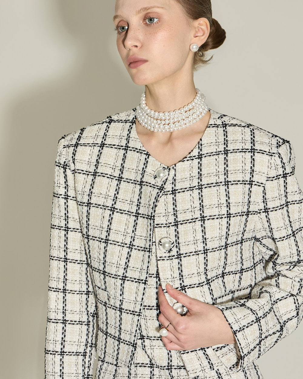 Pearl button details add a feminine touch,