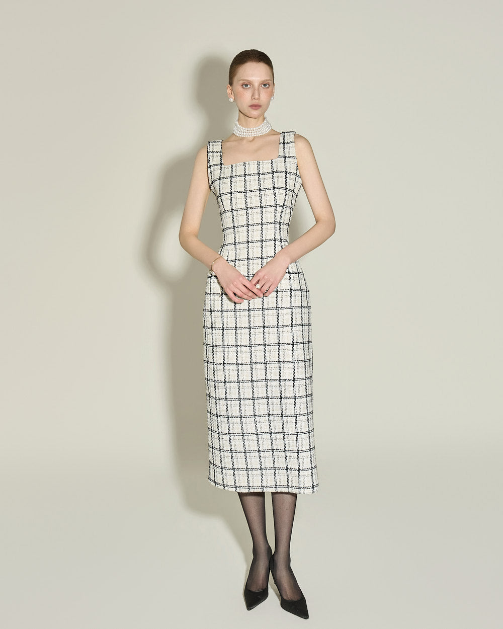 The dress is a sleeveless, midi-length H-line,