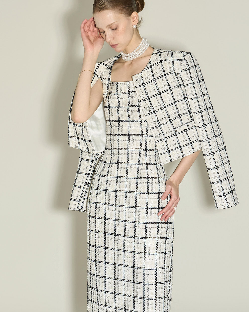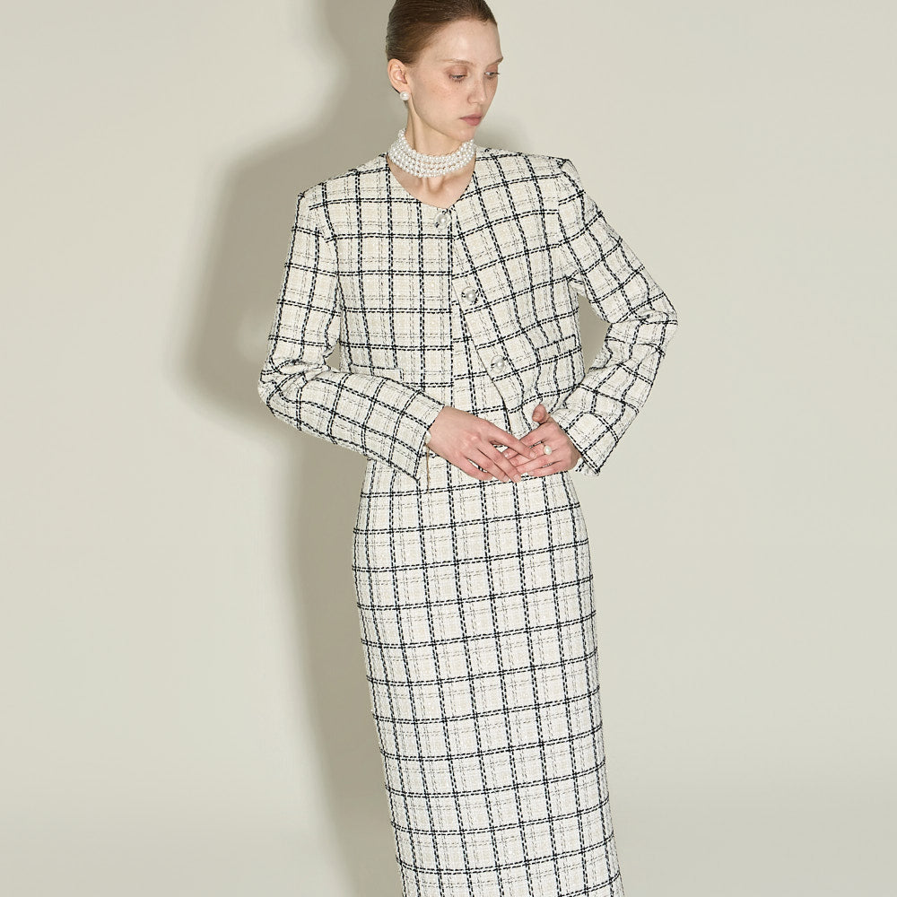 This feminine tweed jacket and dress set exudes a feminine vibe.