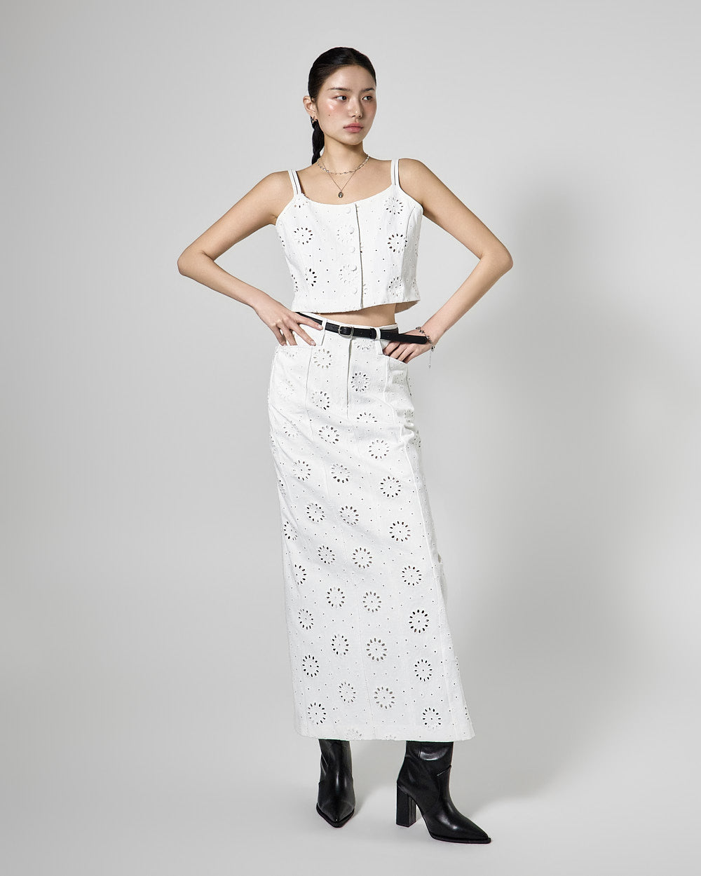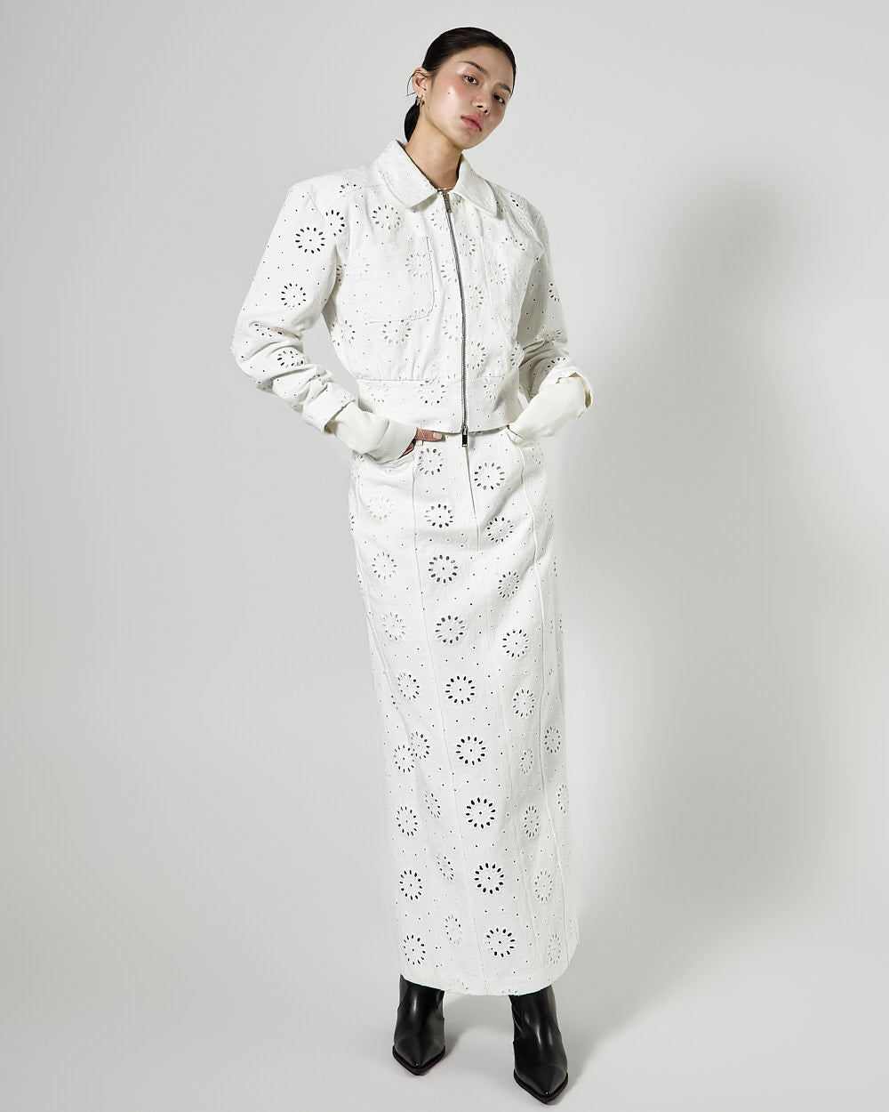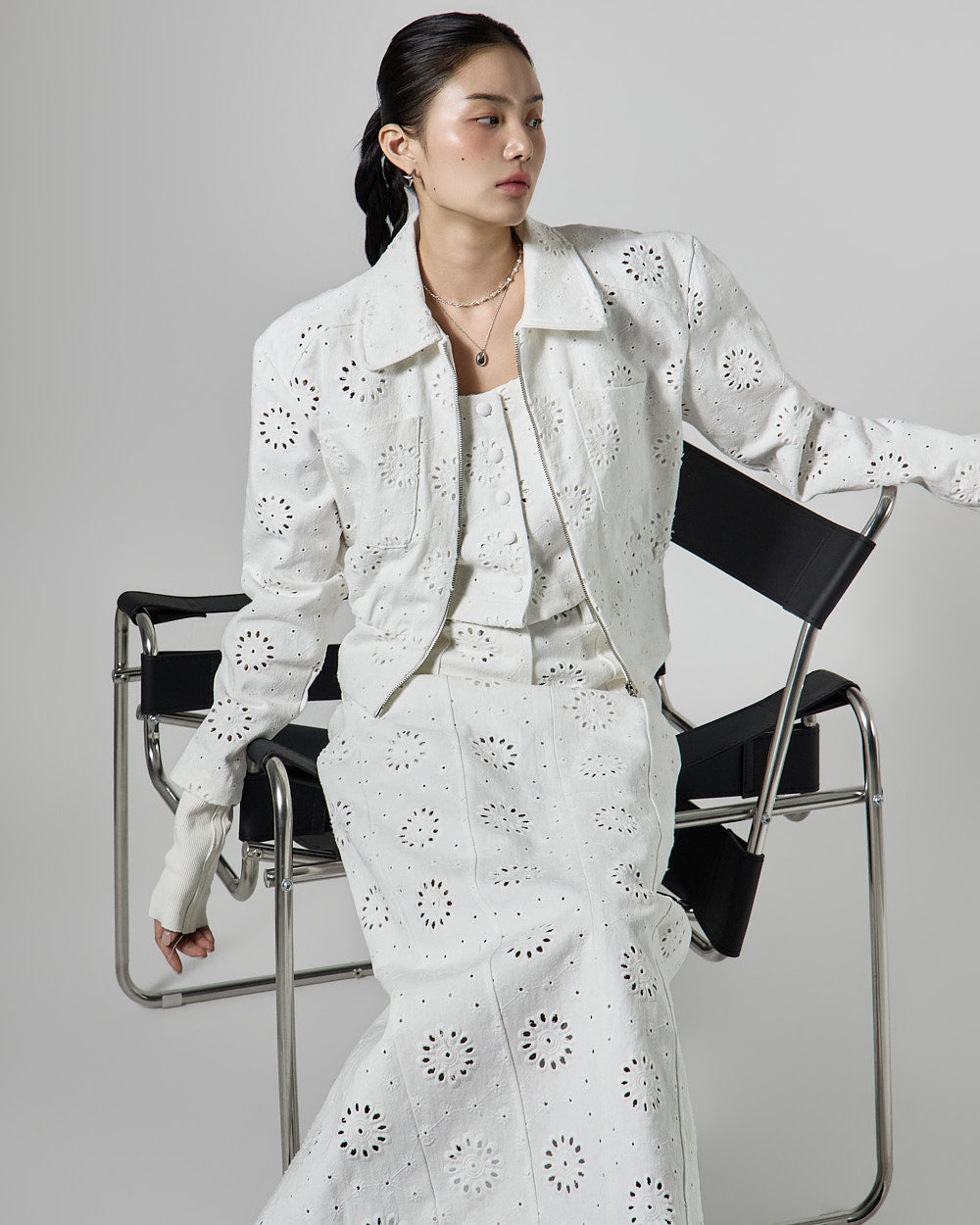 Made from lightweight punched cotton fabric for a cohesive finish, the set includes a collared zip-up top, a sleeveless top, and a long skirt, creating a fresh and airy atmosphere. Each piece can be worn individually, while styling them together delivers a complete and refined look.