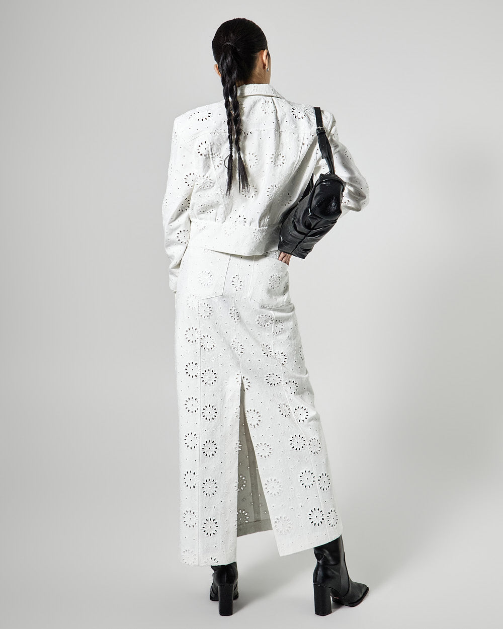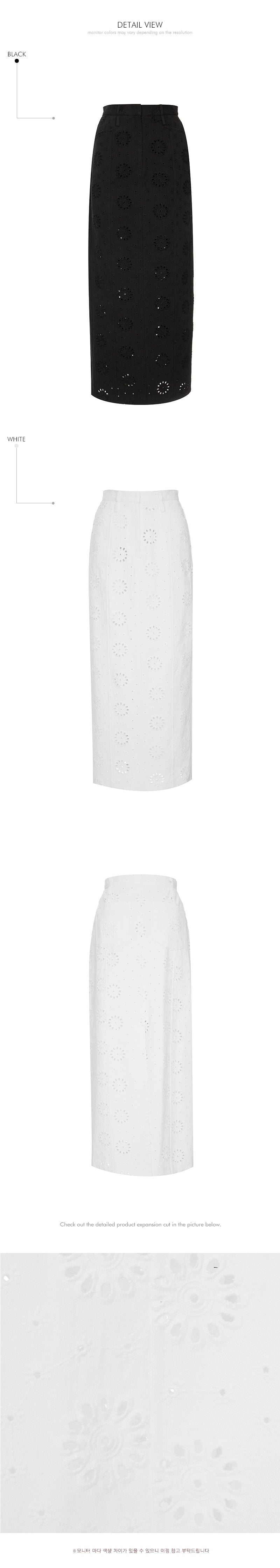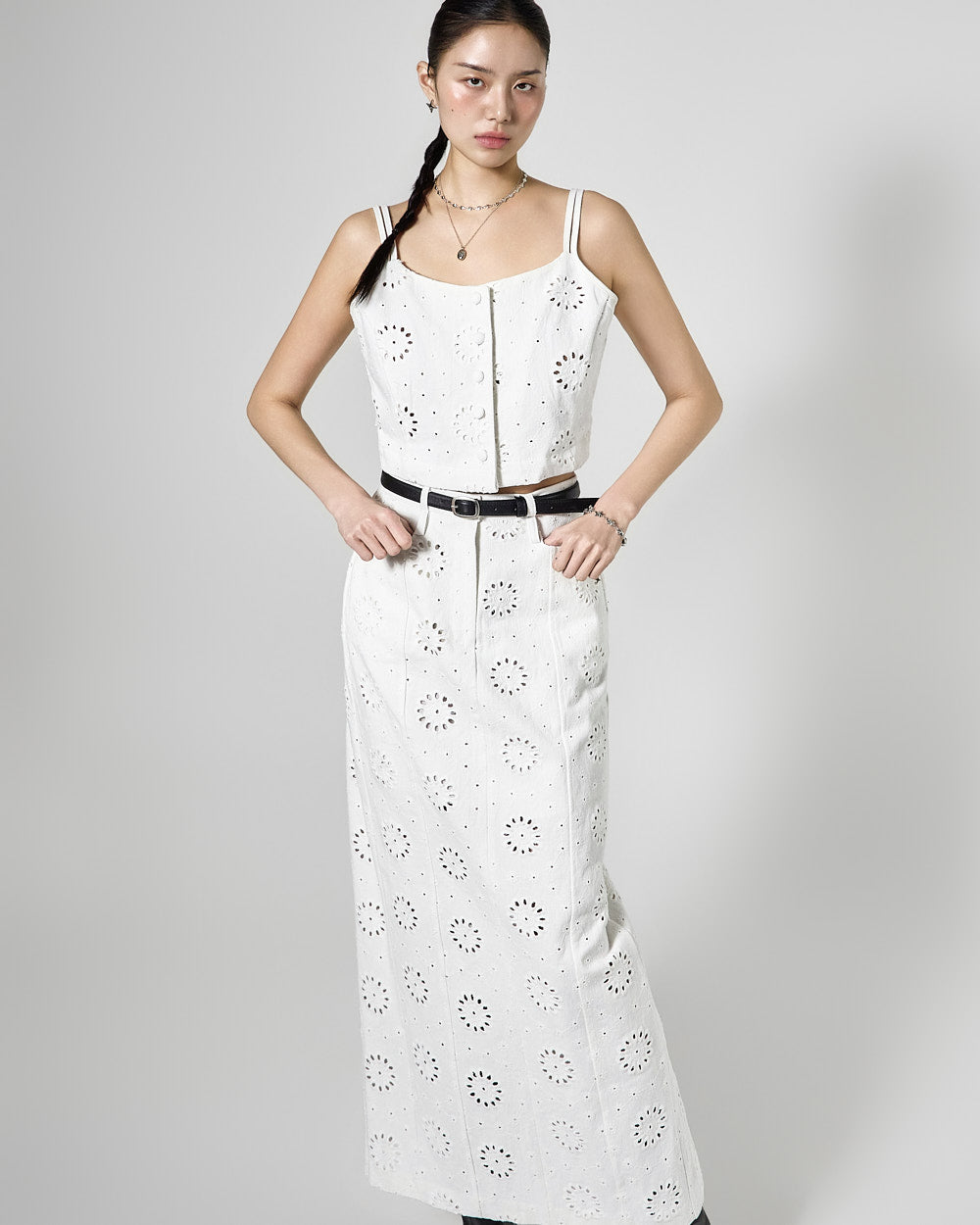 Made from lightweight punched cotton fabric for a cohesive finish, the set includes a collared zip-up top, a sleeveless top, and a long skirt, creating a fresh and airy atmosphere. Each piece can be worn individually, while styling them together delivers a complete and refined look.