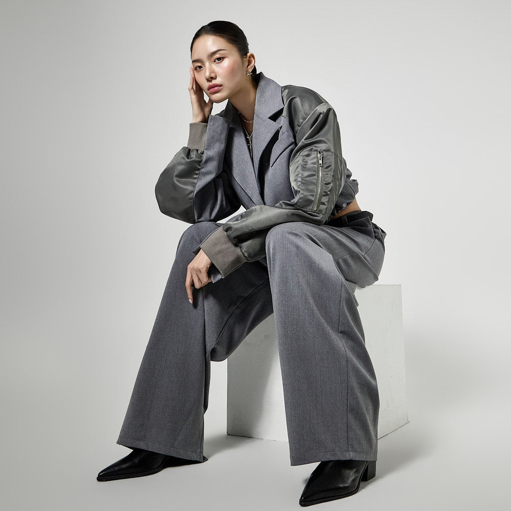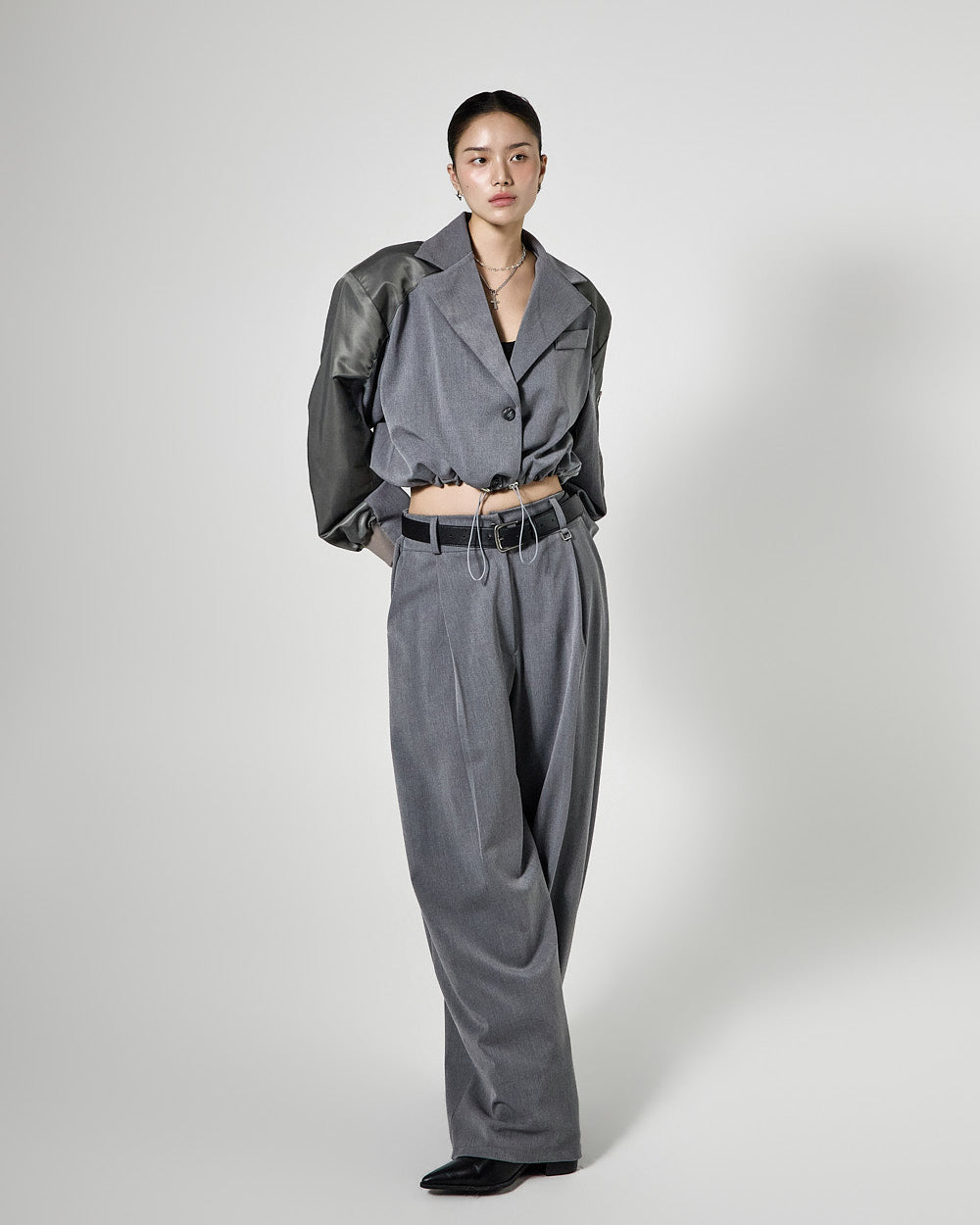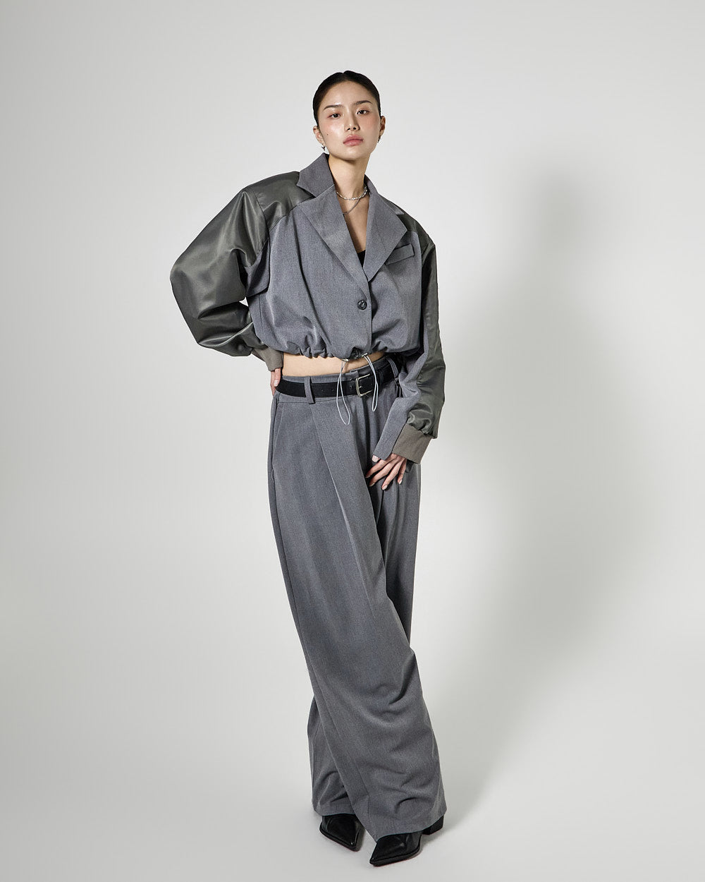 The 171cm model is wearing a size ONE jacket and slacks in the GRAY color.