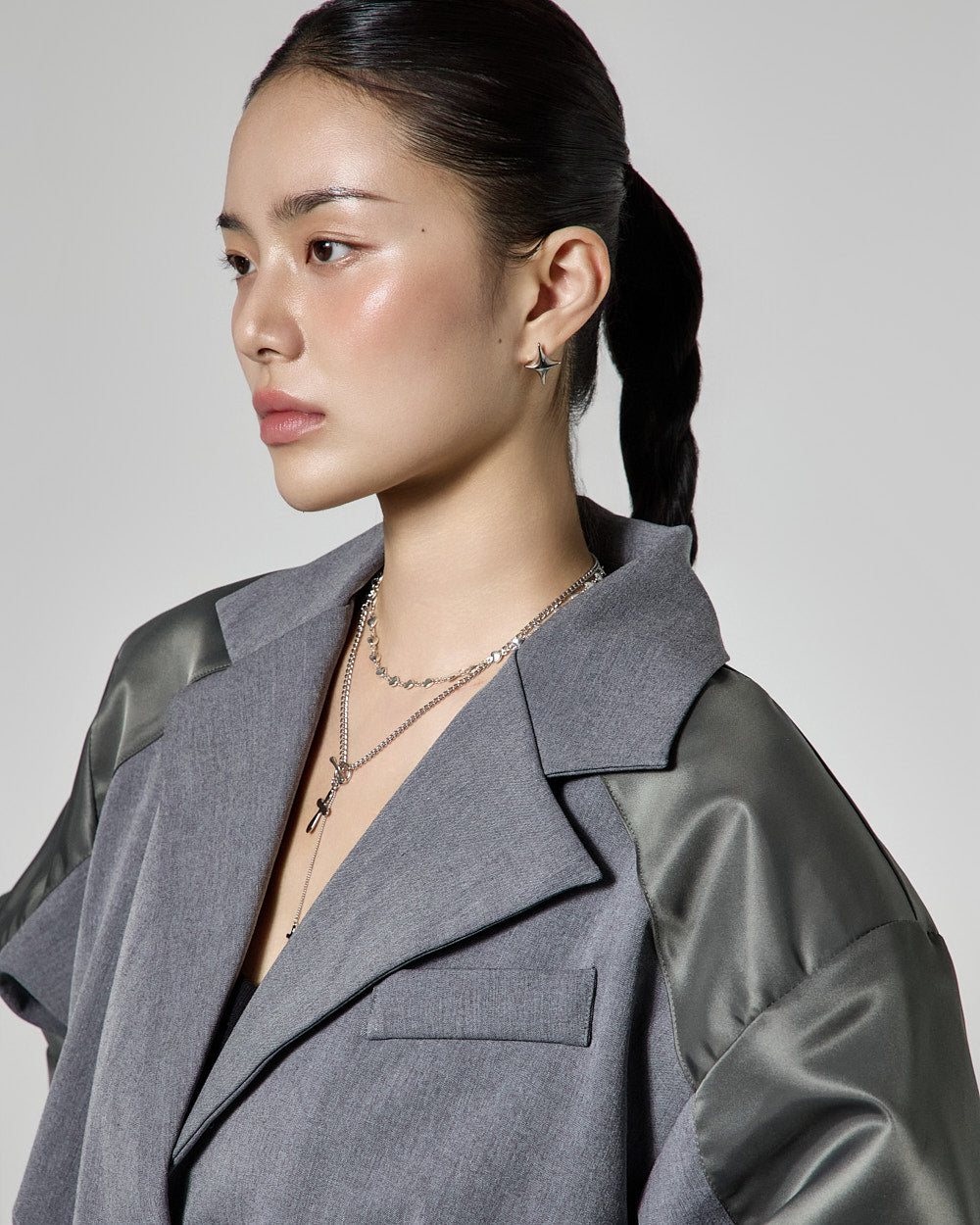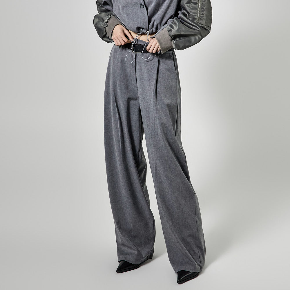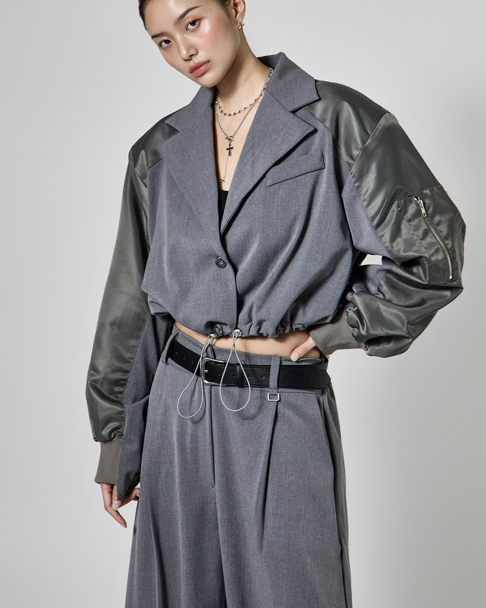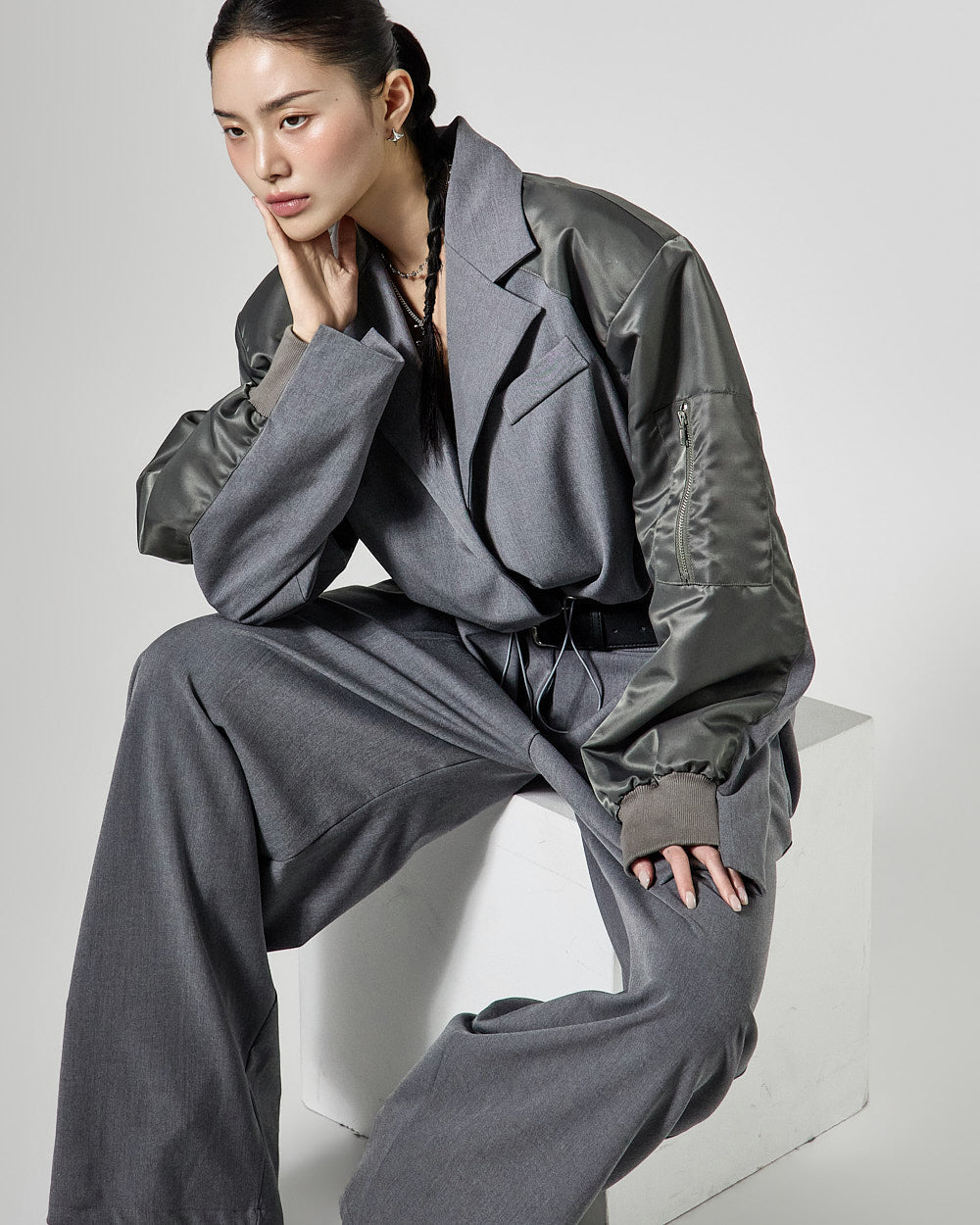 The 171cm model is wearing a size ONE jacket and slacks in the GRAY color.
