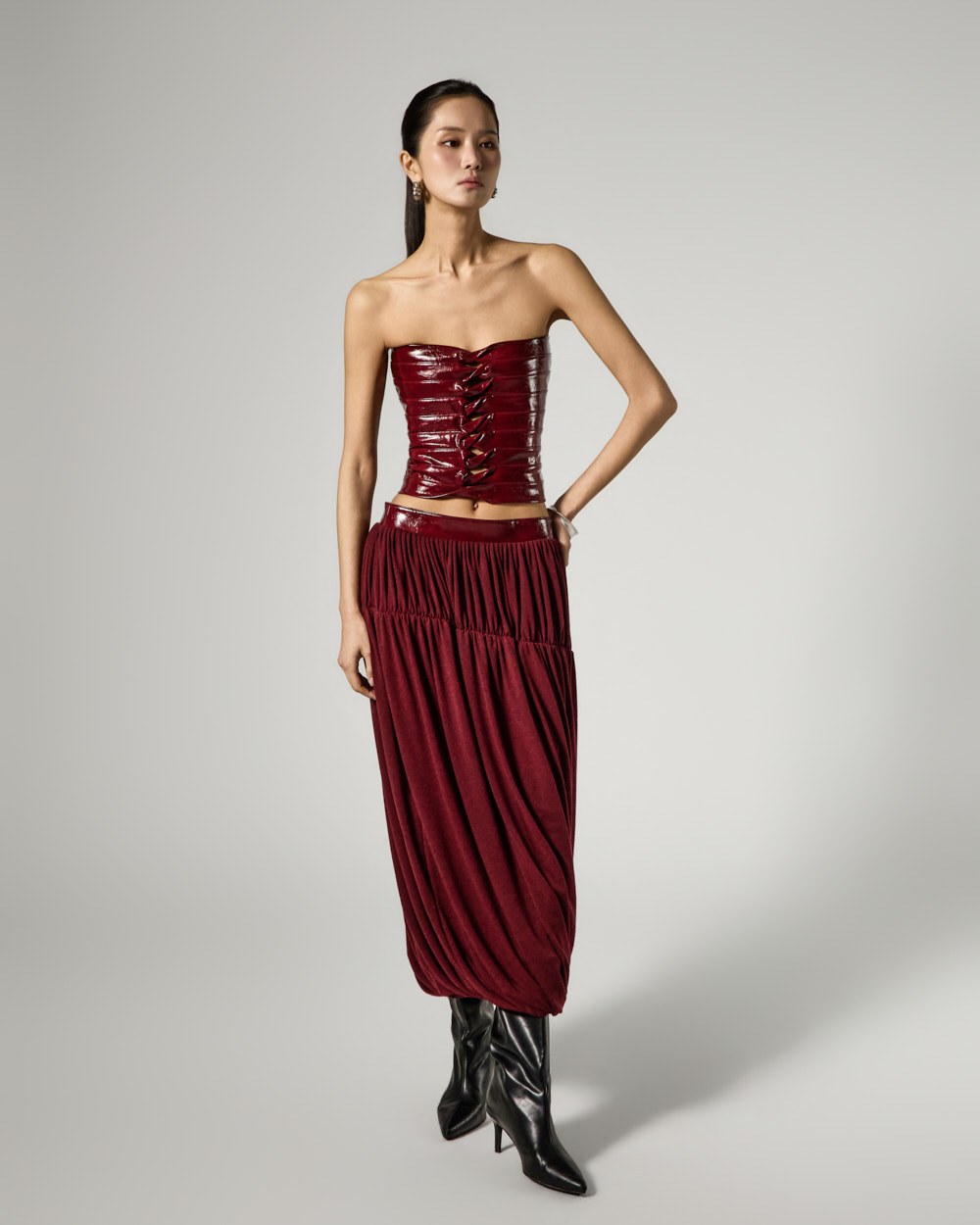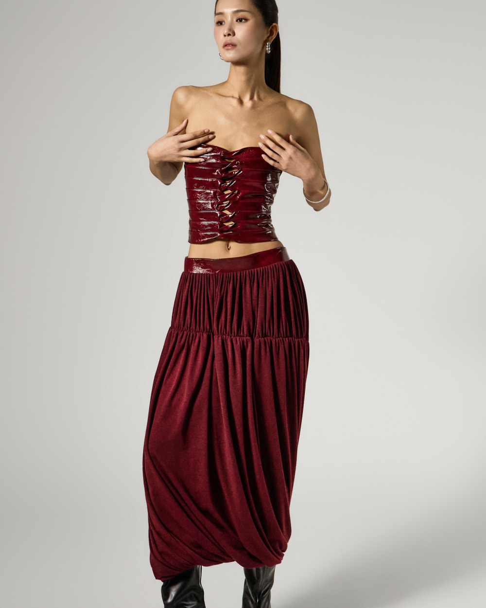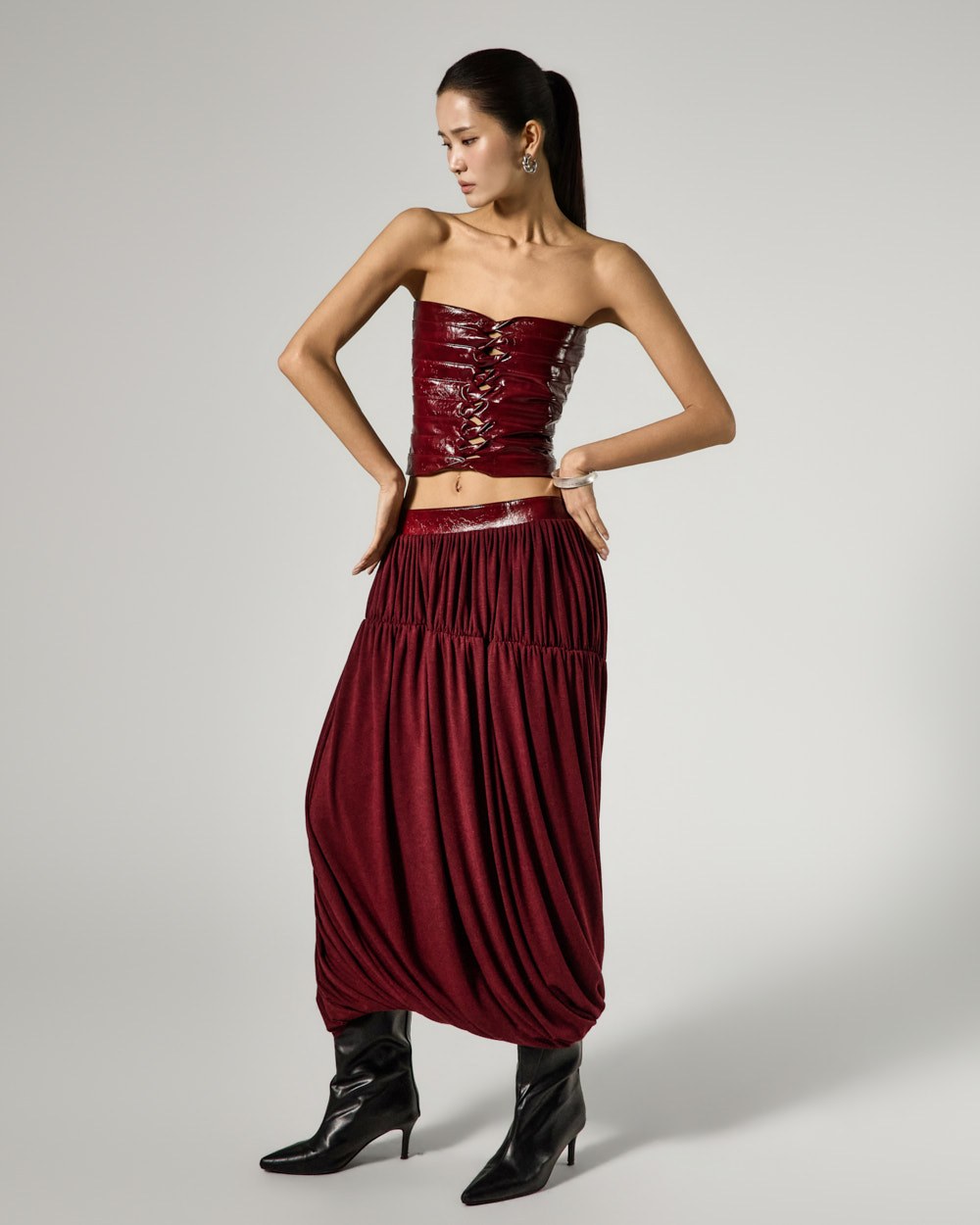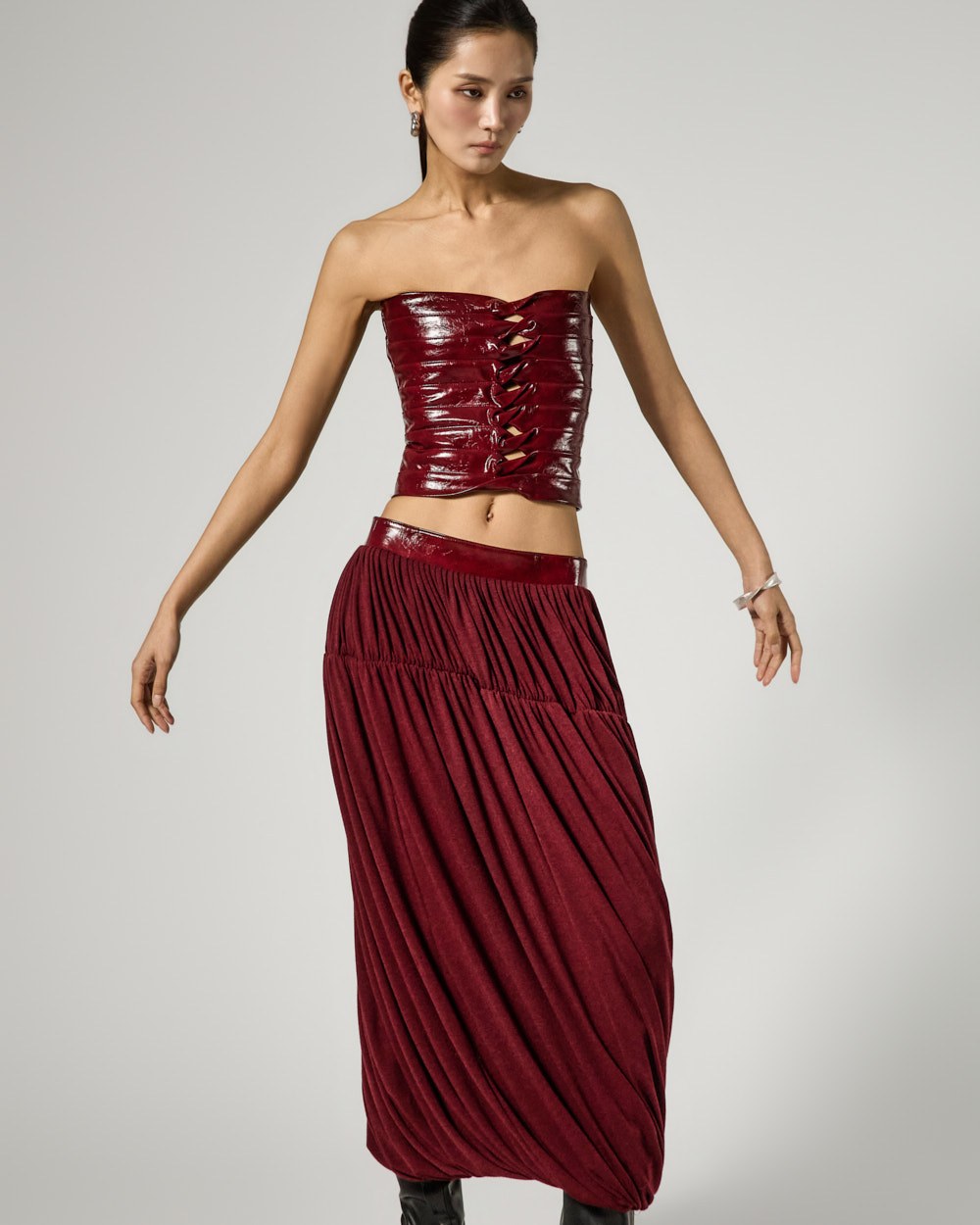 このユニークなトップスとスカートのセットは、個性的なスタイリングにぴったりです。