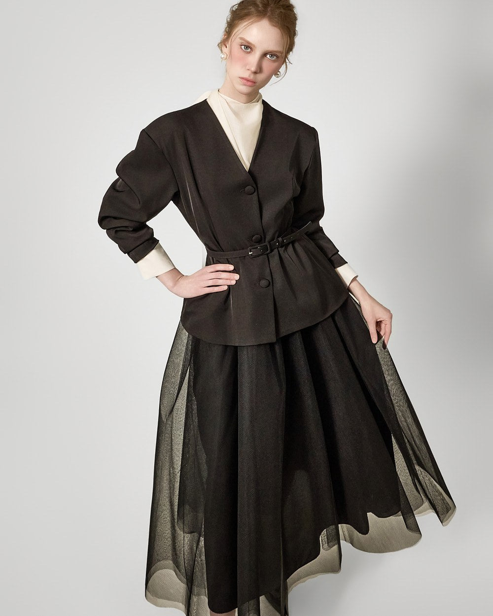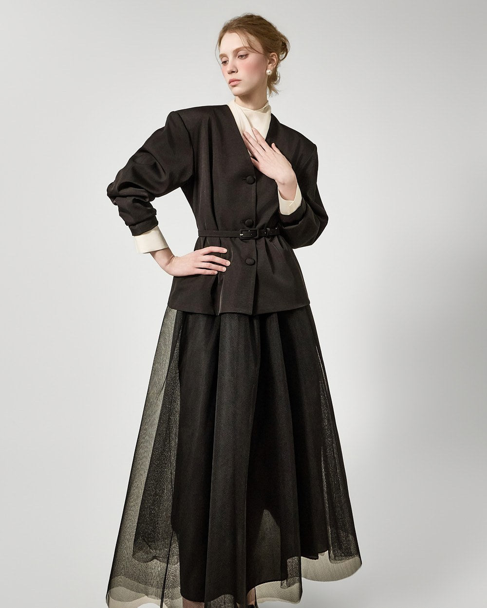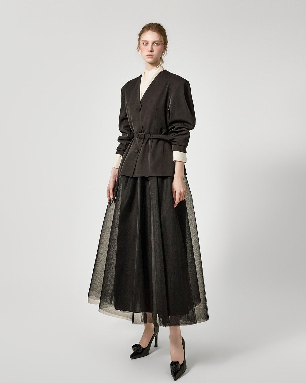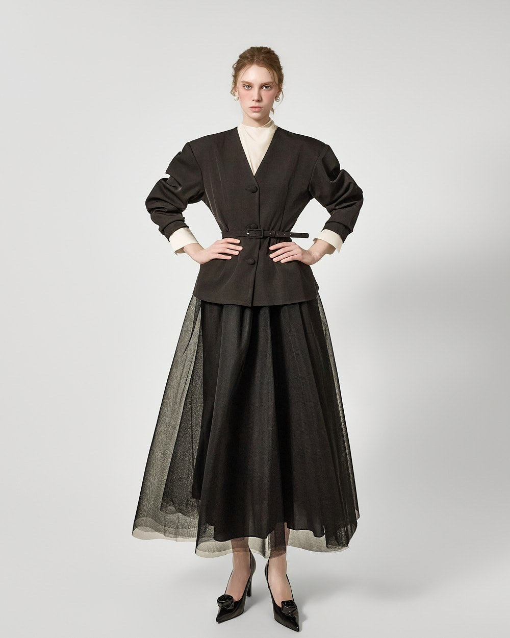すっきりとしたノーカラージャケットとボリューム感のあるチュールスカートが組み合わさり、エレガントながらも洗練された雰囲気を演出します。