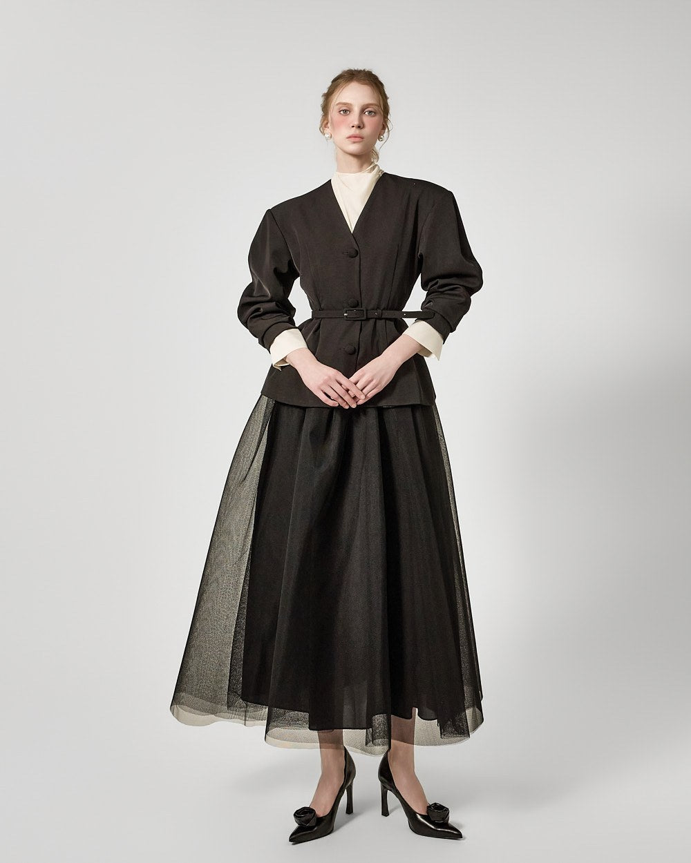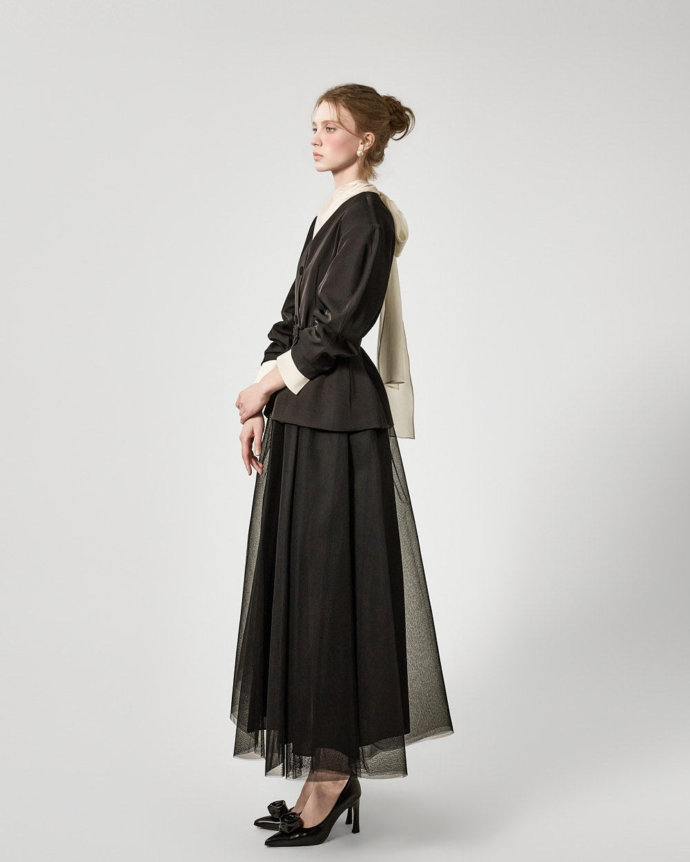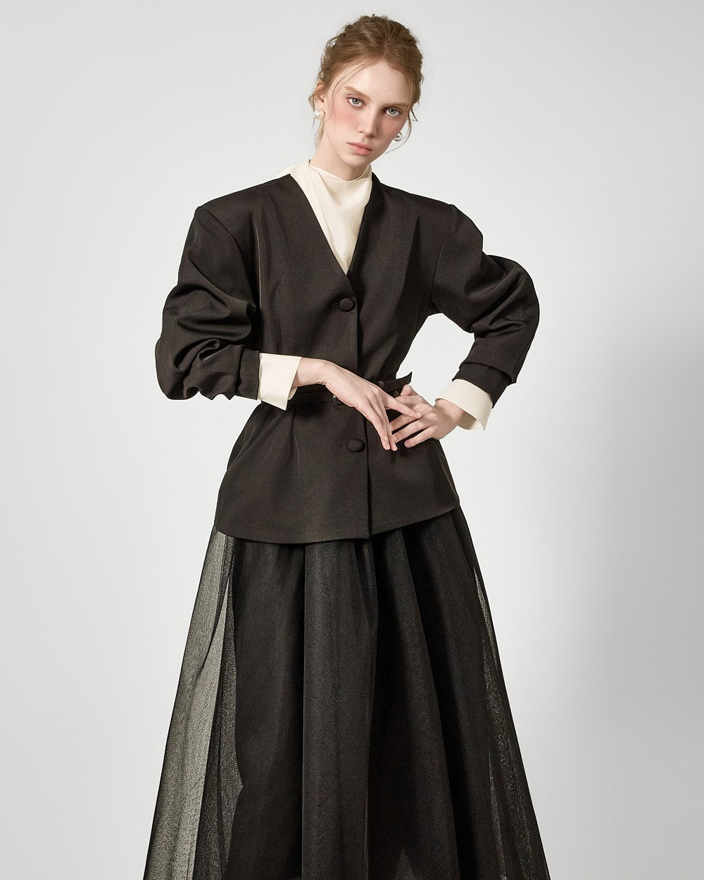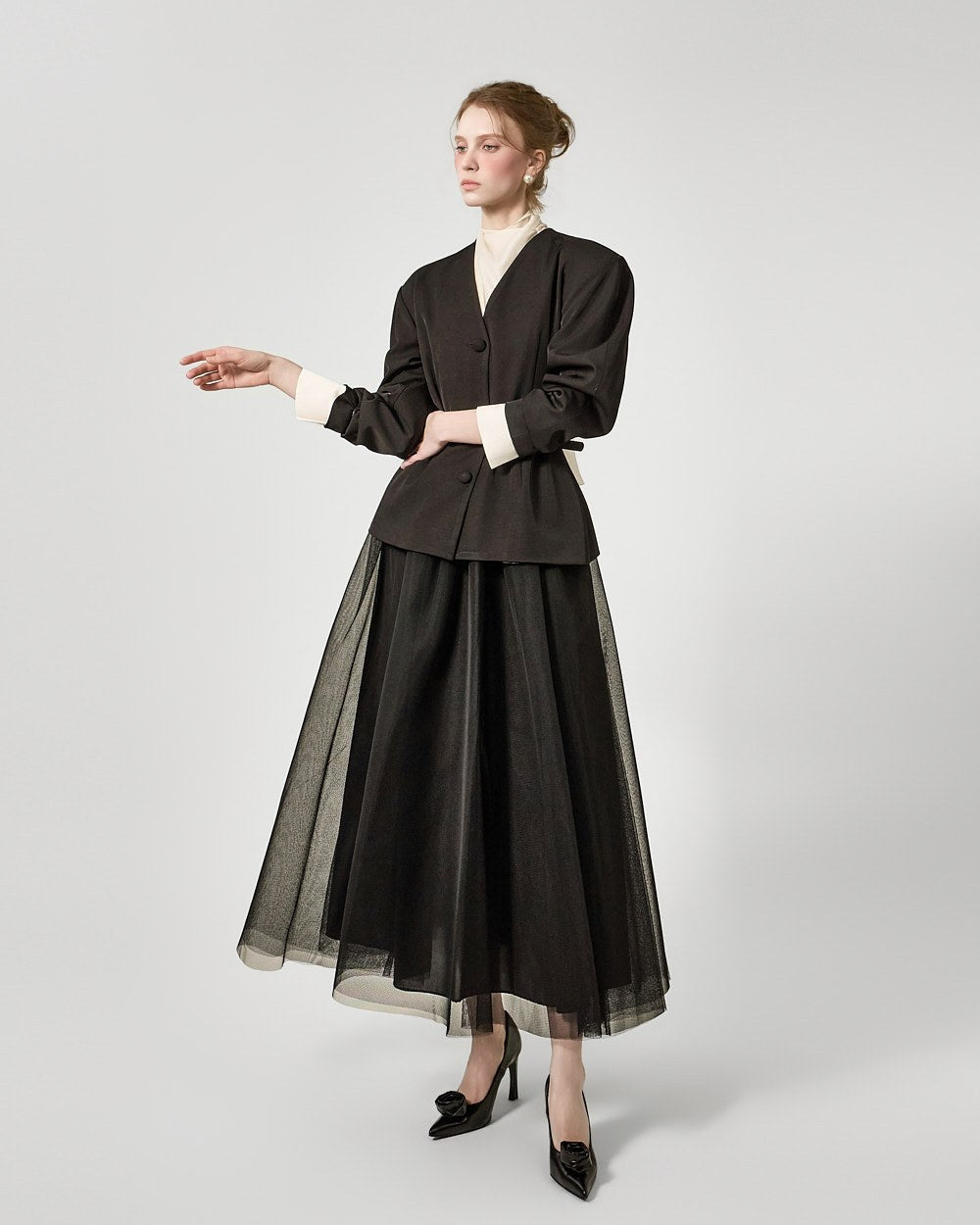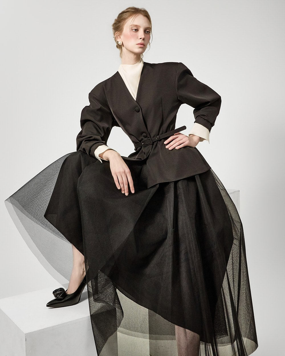 すっきりとしたノーカラージャケットとボリューム感のあるチュールスカートが組み合わさり、エレガントながらも洗練された雰囲気を演出します。