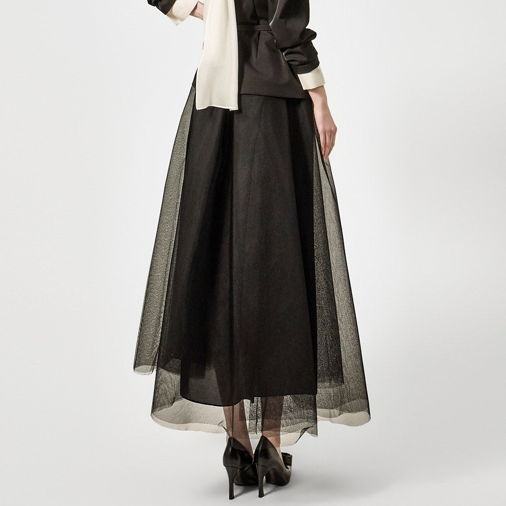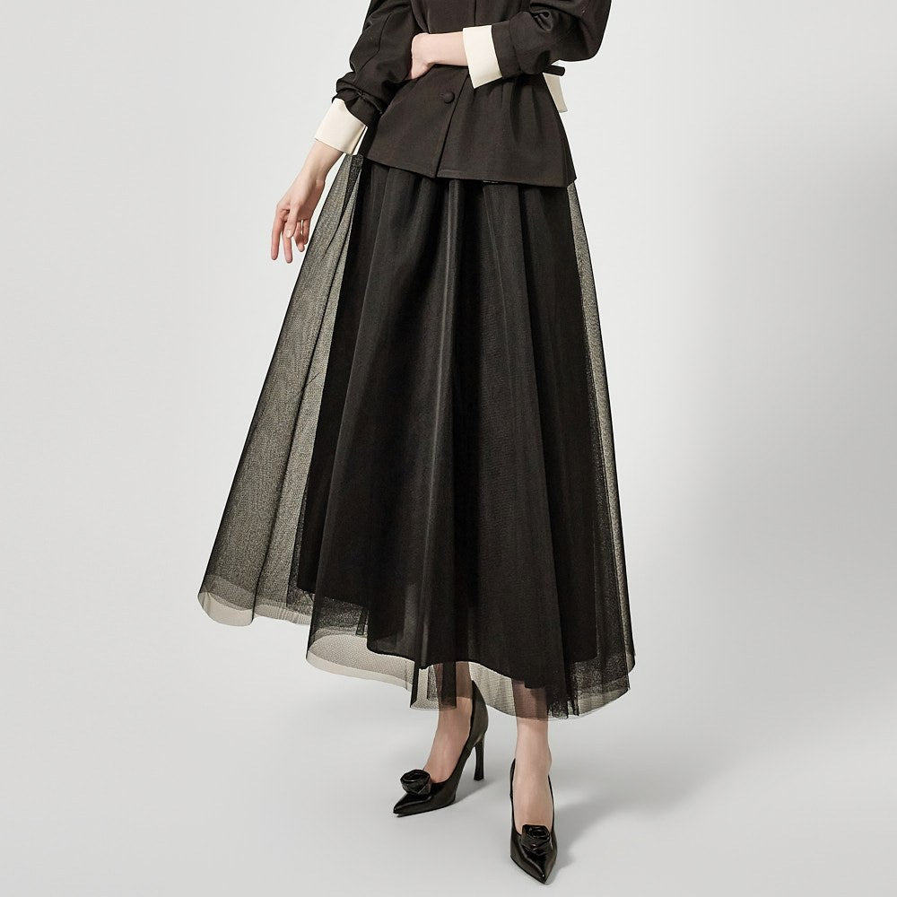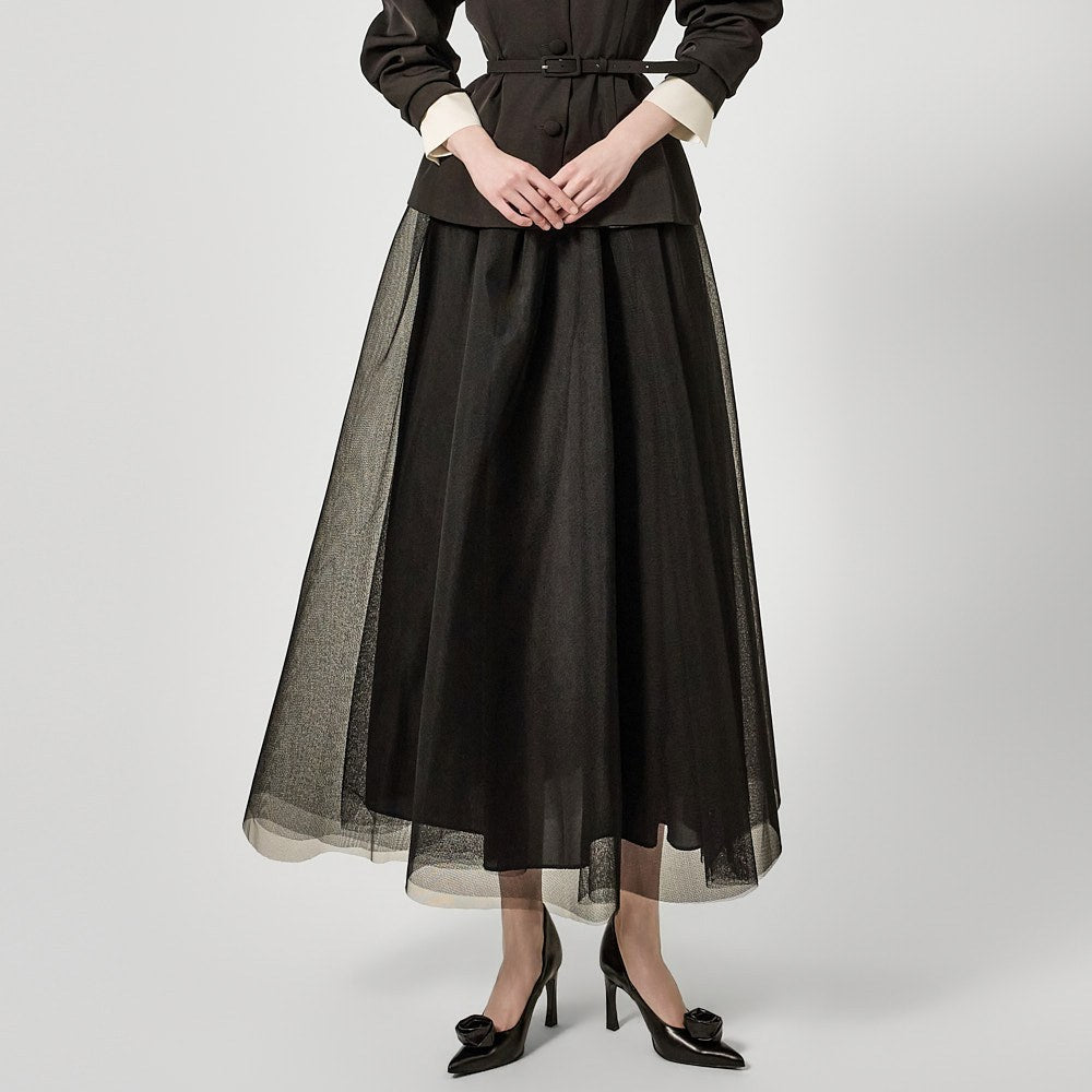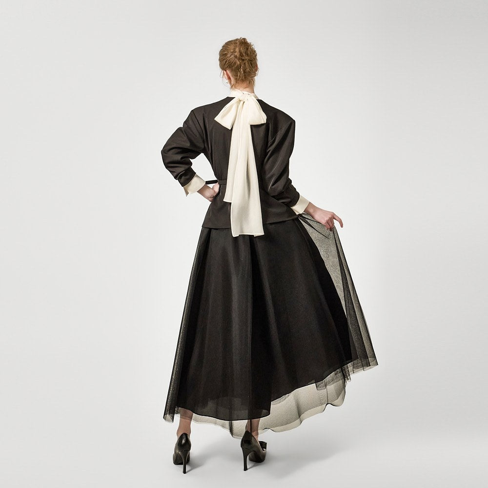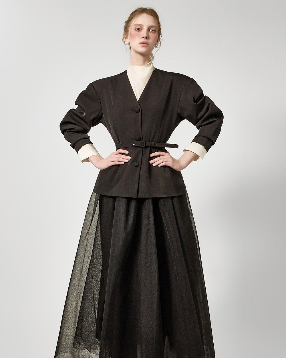 すっきりとしたノーカラージャケットとボリューム感のあるチュールスカートが組み合わさり、エレガントながらも洗練された雰囲気を演出します。