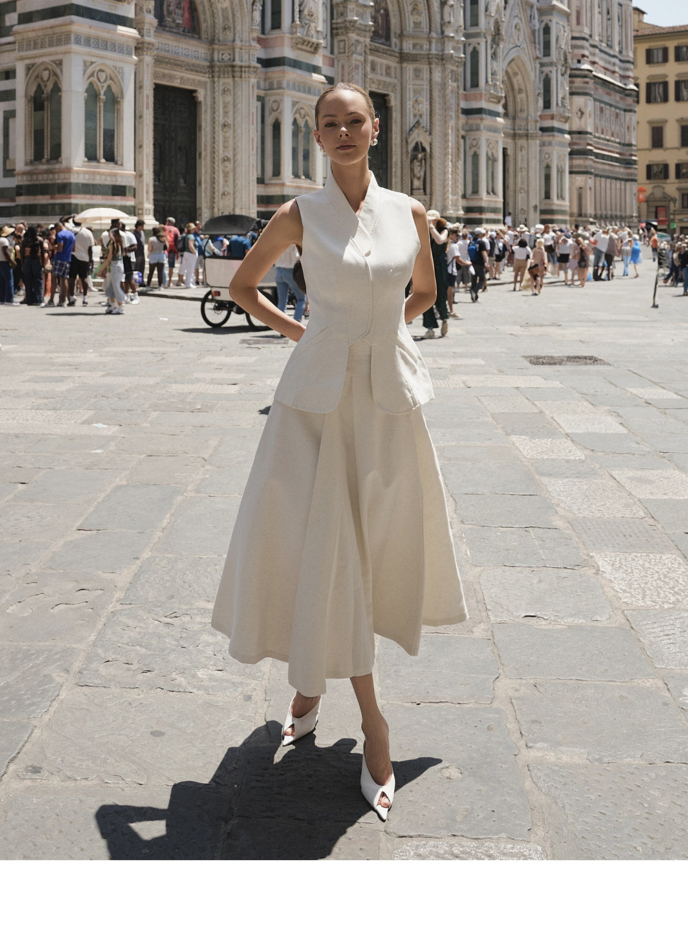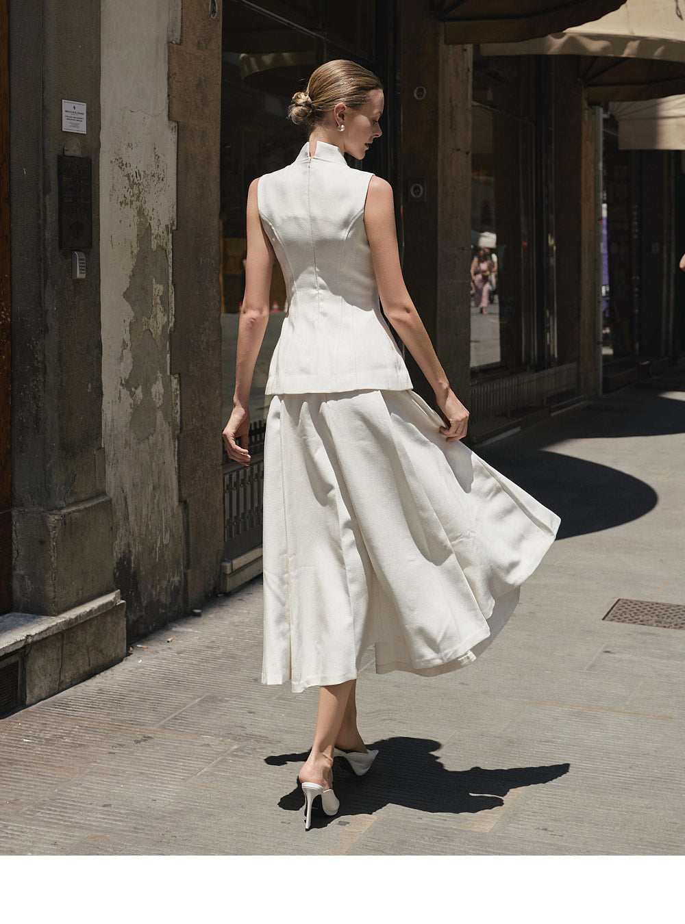 ベストデザインがクラシックな雰囲気を醸し出し、フレアスカートラインが