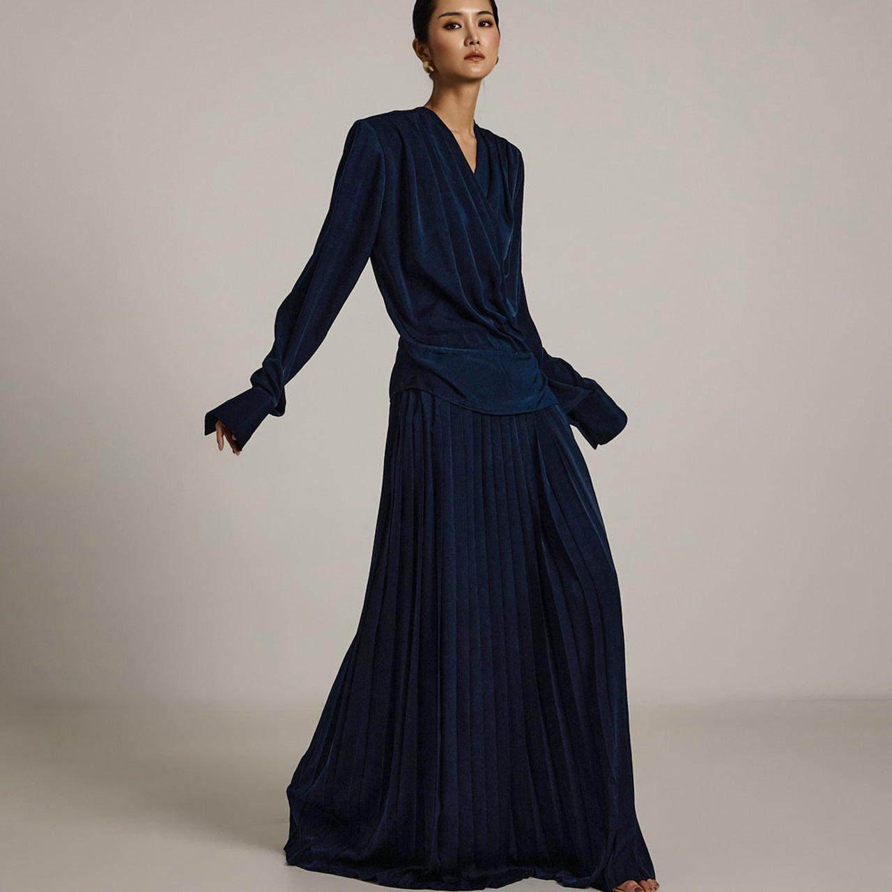 マキシ丈のたっぷりプリーツデザインが、すっきりとファッショナブルなシルエットを演出します。