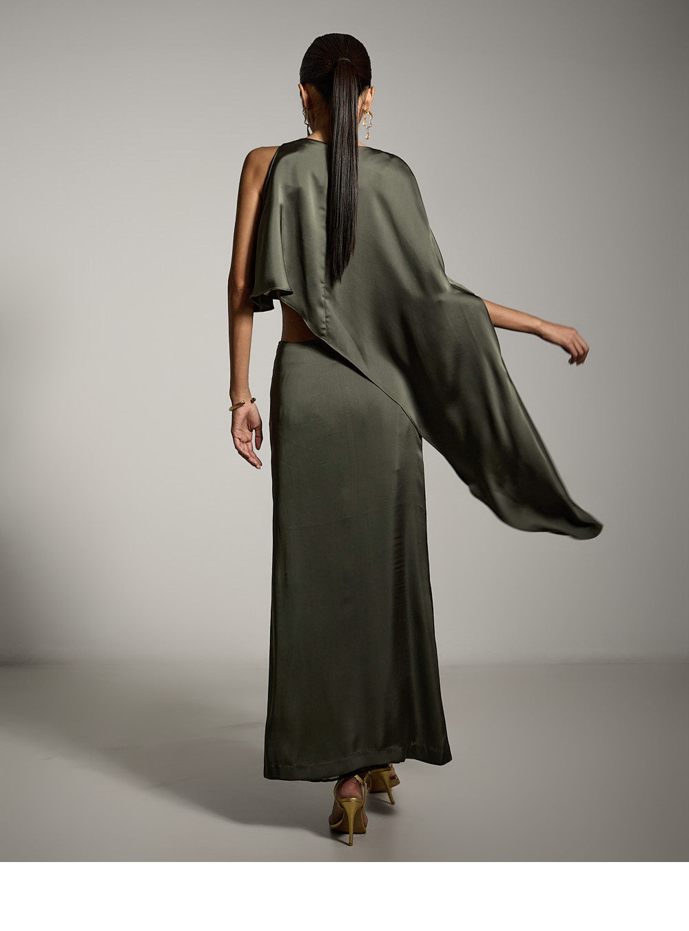 モデルの身長は173cmで、トップスはワンサイズ、スカートはSサイズ、カーキ色を着用しています。