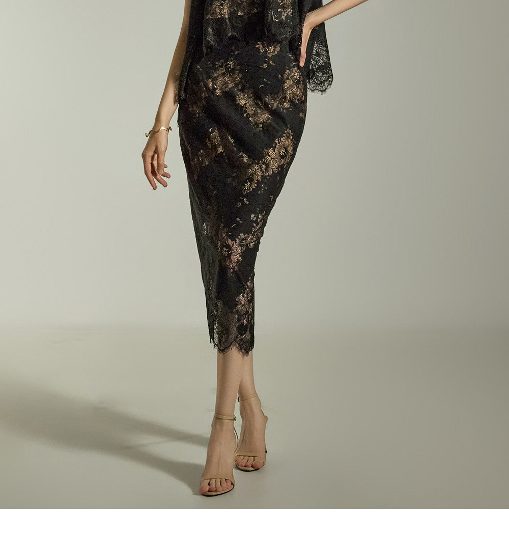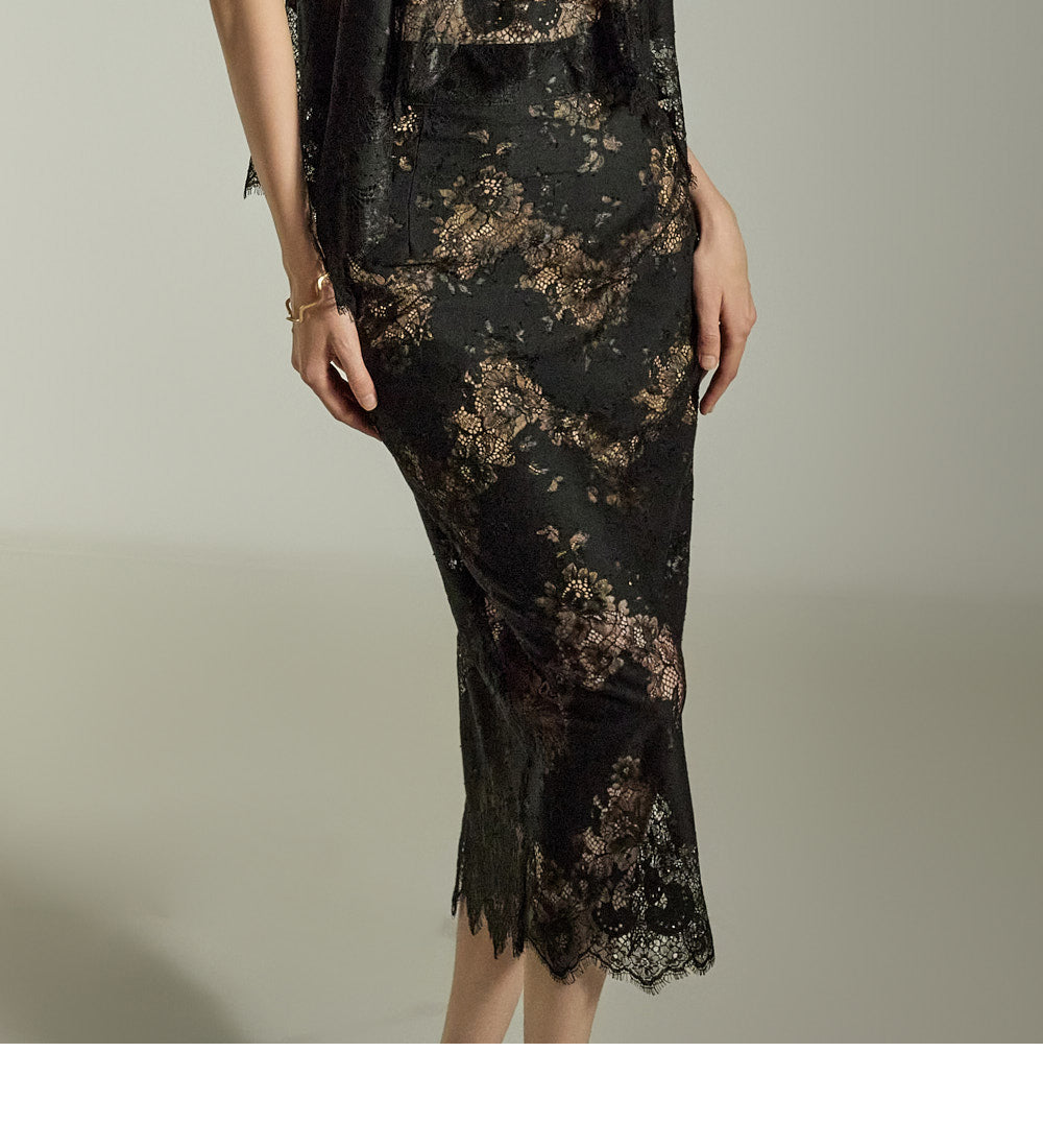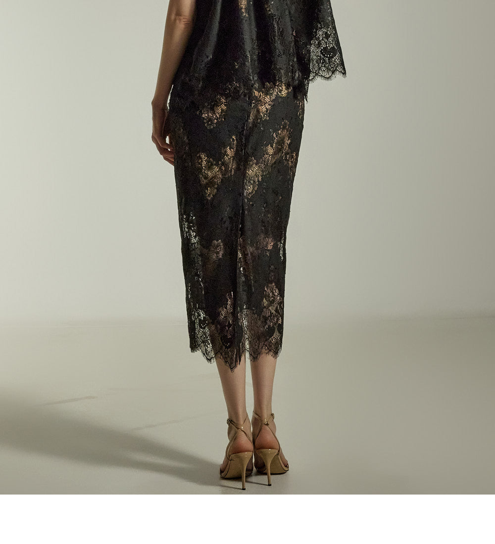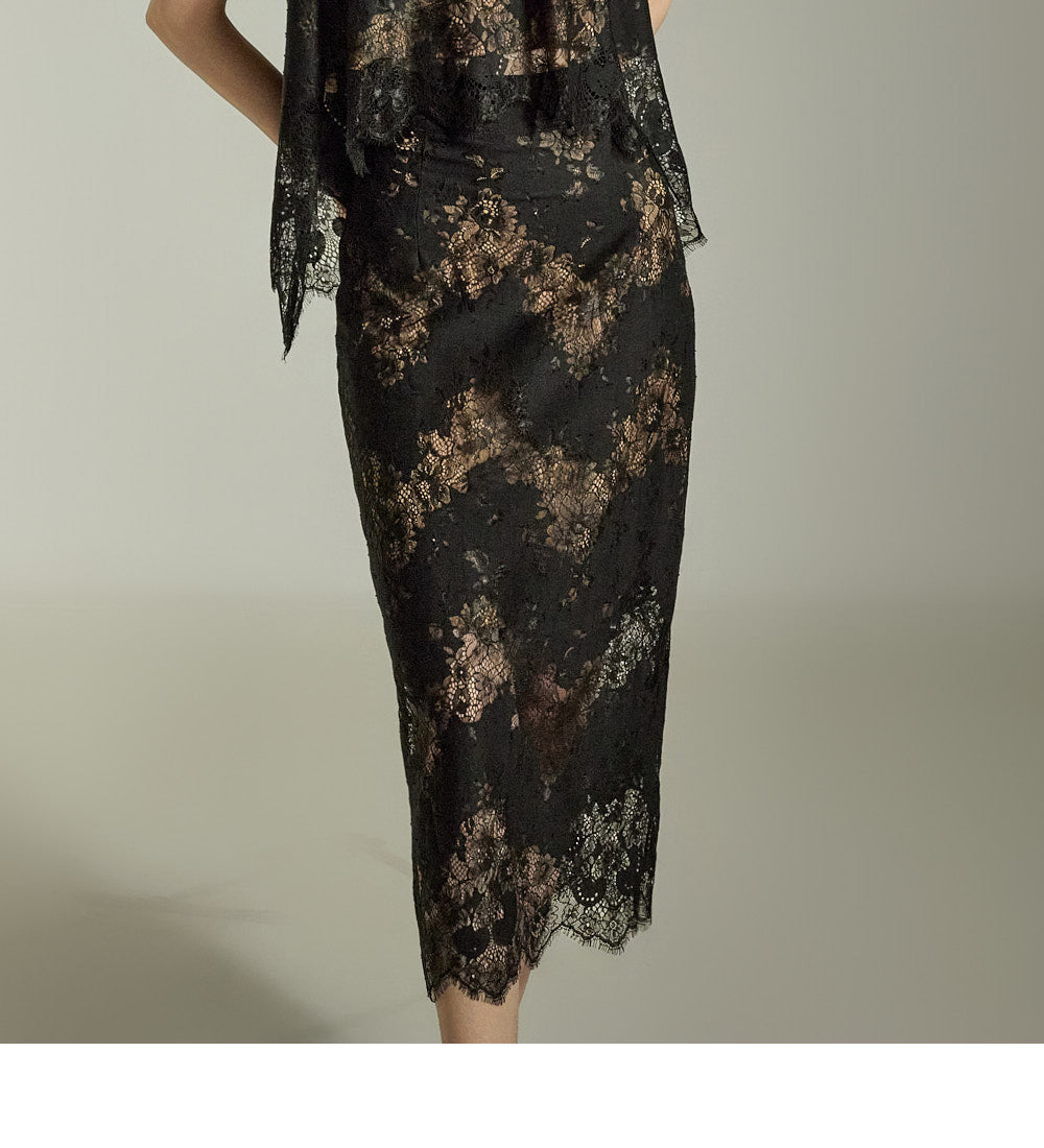 The subtle floral lace pattern on both the top and skirt creates a polished, sophisticated look.
